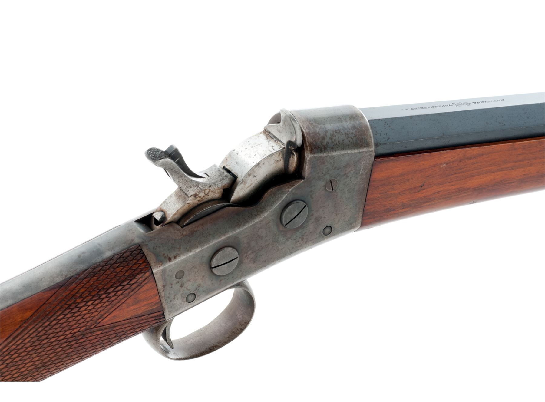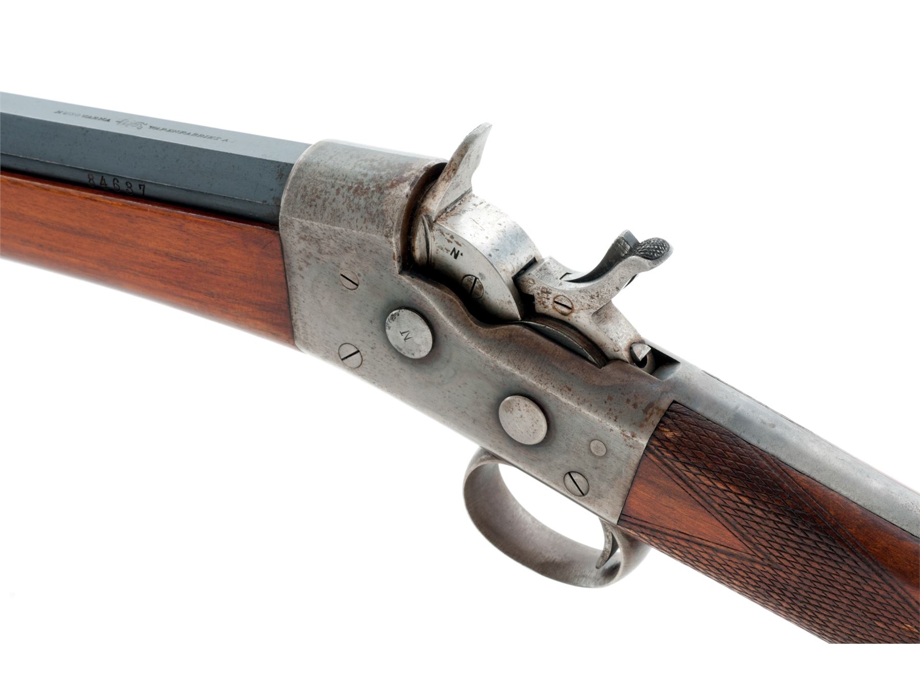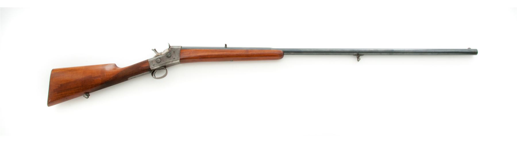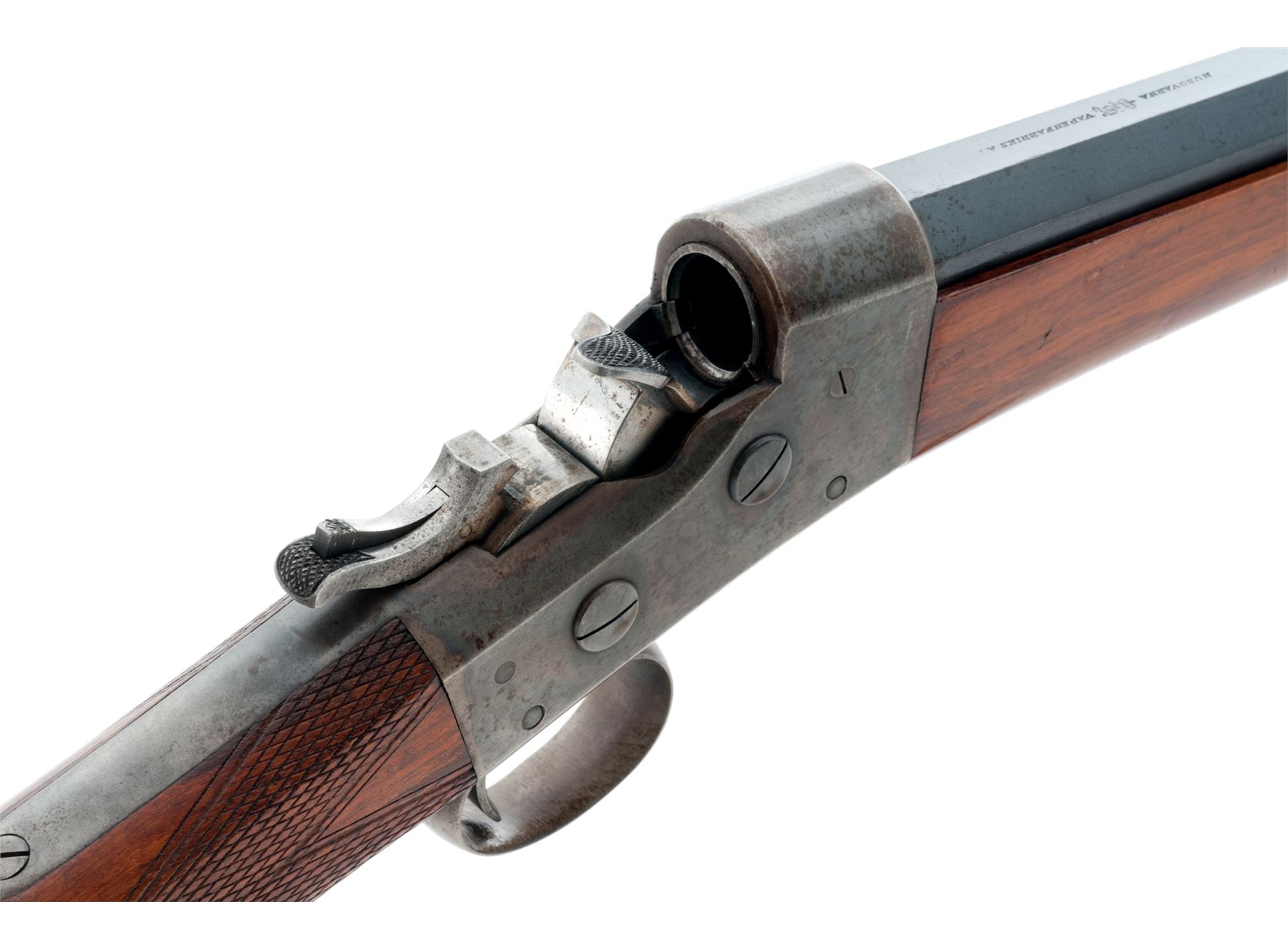 Husqvarna Rolling Block Action Single Shot Sporting Shotgun, #84637, 12 ga., blued 39'' part round-part octagonal barrel with integral blade front and large ''V-notch'' open rear sights, and a sling swivel mounted mid-way underneath marked on top flat at breech, ''Husqvarna (crown)/H logo) Vapenfabriks A.L.'', and the serial number on left flat; case hardened receiver, breechblock, hammer, trigger and triggerguard; varnished European walnut forend and straight buttstock with checkering at wrist and carved cheekpiece with plain steel buttplate and sling swivel underneath. Condition is excellent, the barrel retaining approx. 95% original blue, the case hardened parts showing muted mottling and good colors. Stocks are smooth and solid with clean checkering, light handling marks and nice grain and color. Action is smooth; bore is clean and shiny. Est.: $450-$750. (C&R)