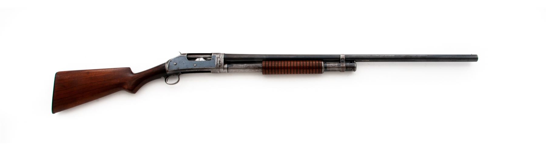 Winchester Model 1897 Pump Action Shotgun, #580364, 12 ga., 30'' barrel choked Full, blue finish, smooth pistol-grip walnut stock. Mfg'd 1915. Condition is very good retaining approx. 60% original factory blue, with social security number lightly electro-penciled to upper receiver flat. Stock with even general wear and possible minor sanding. Good action, bright bore. Est.: $250-$400. (C&R)