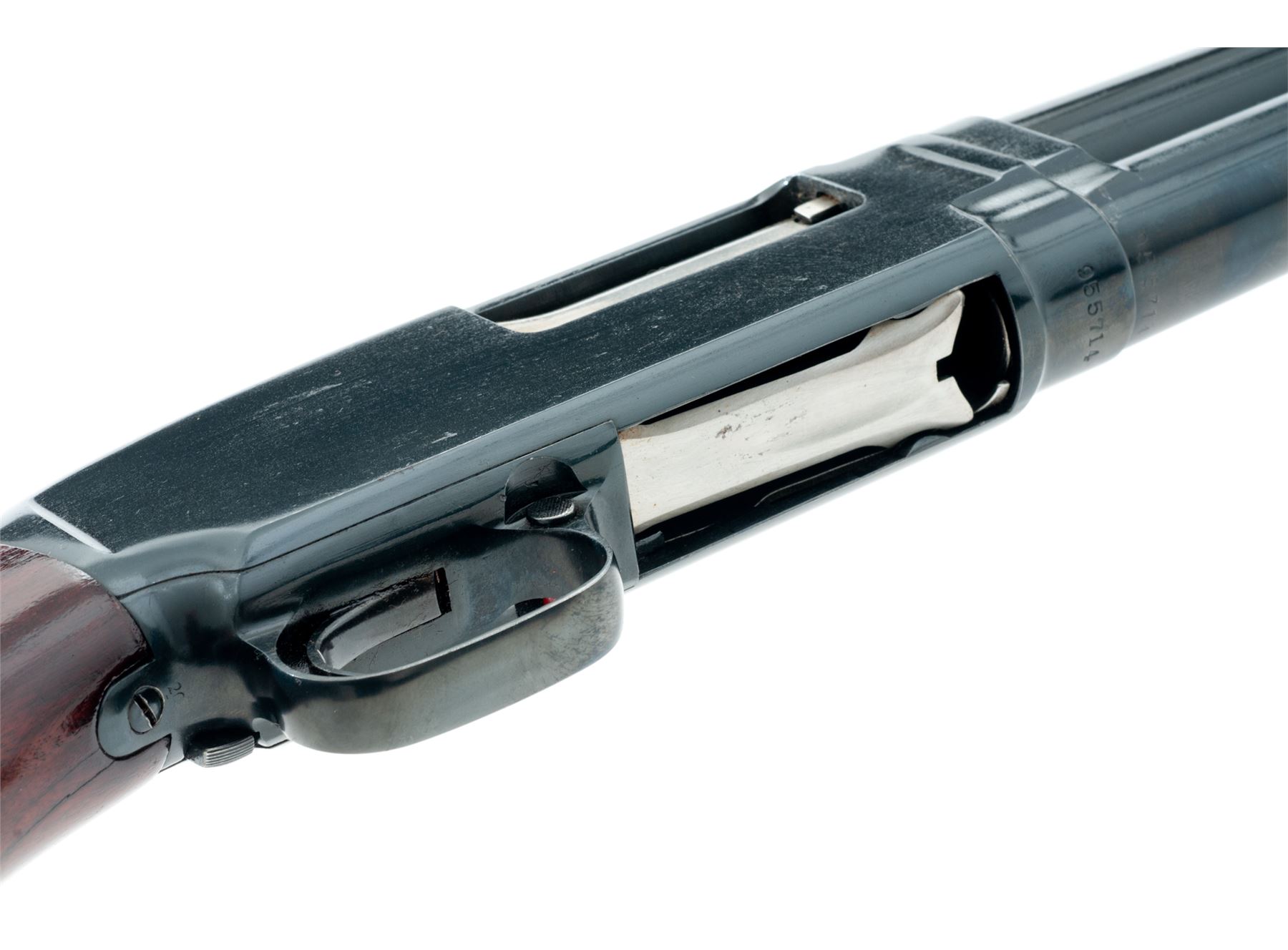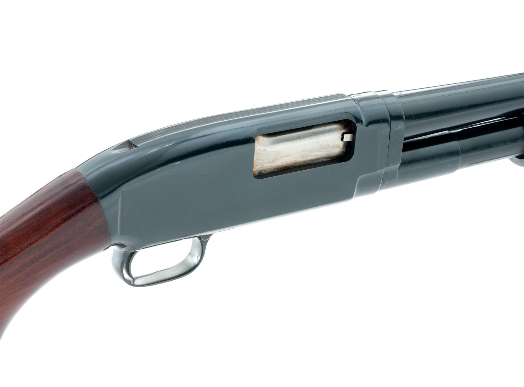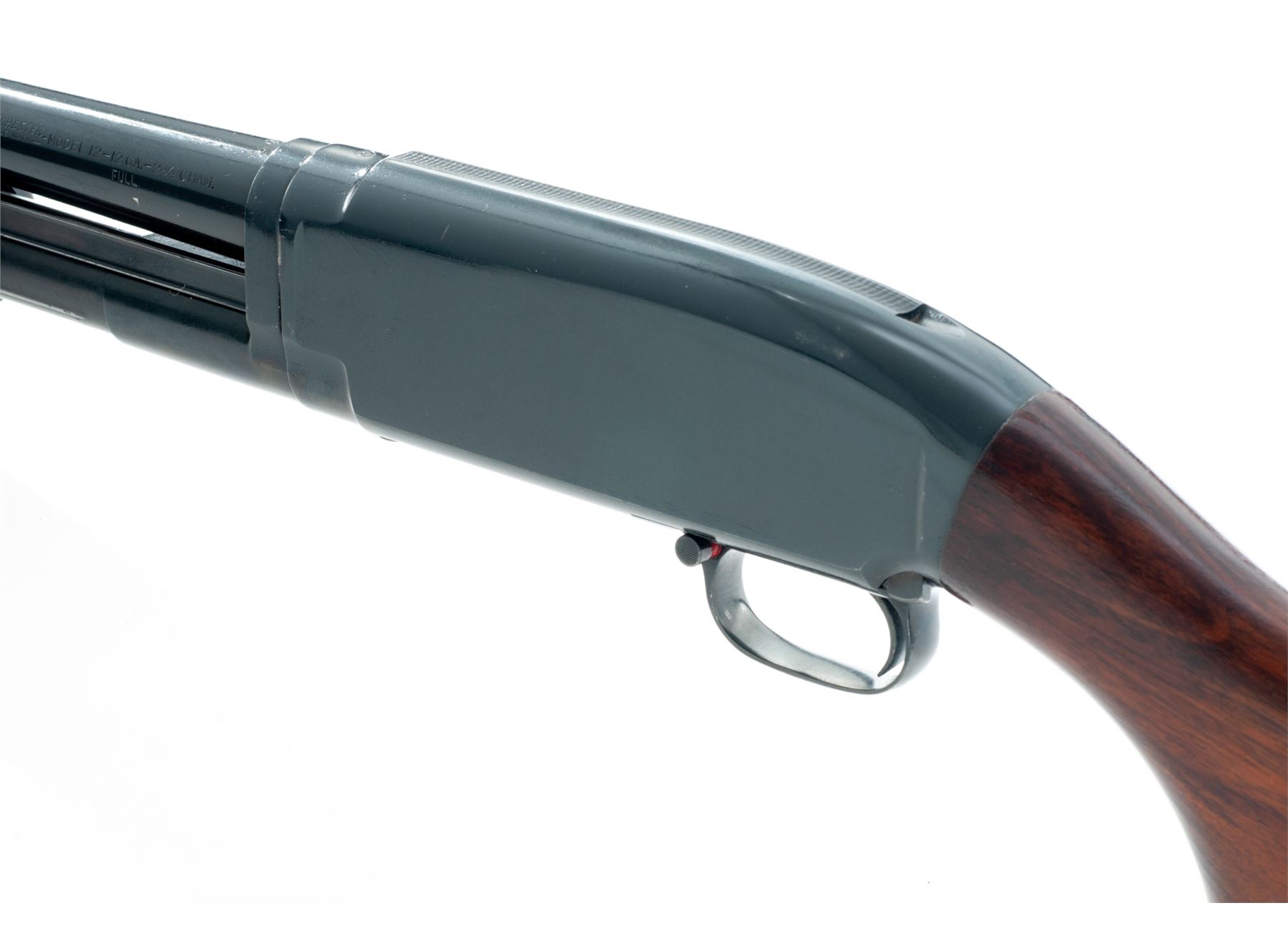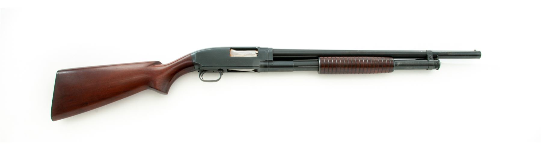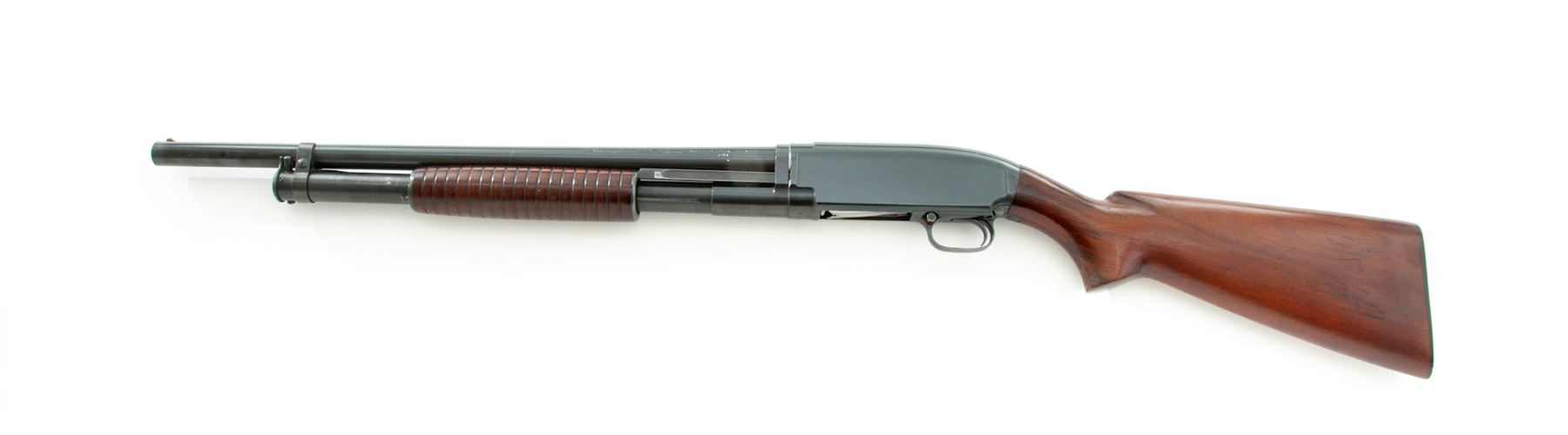 Winchester Model 12 Field Grade Slide-Action Shotgun, #955714. 12 ga. 21'' plain barrel has 2-3/4'' chamber and Cylinder bore (no choke) after being shortened. Original grooved forend and pistol-grip buttstock appear original and have a pre-1959 Winchester buttplate. Mfg'd 1942. Condition is very good with shortened barrel. Action appears to function well; there are numerous handling marks in the wood and some residual adhesive on receiver. Est.: $250-$350. (C&R)