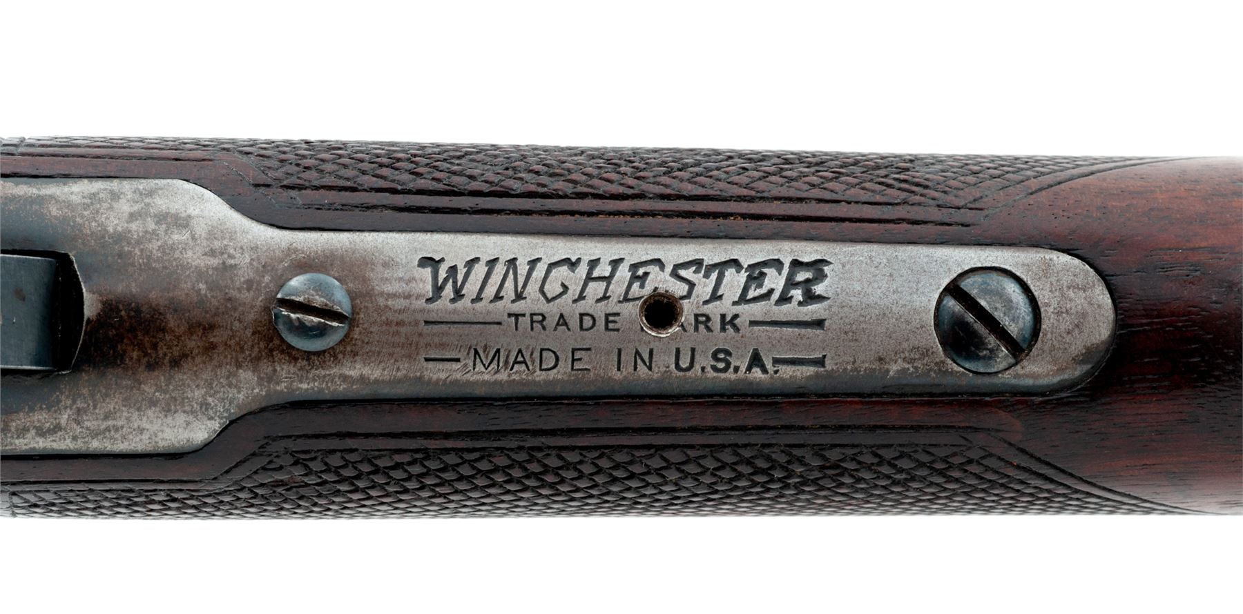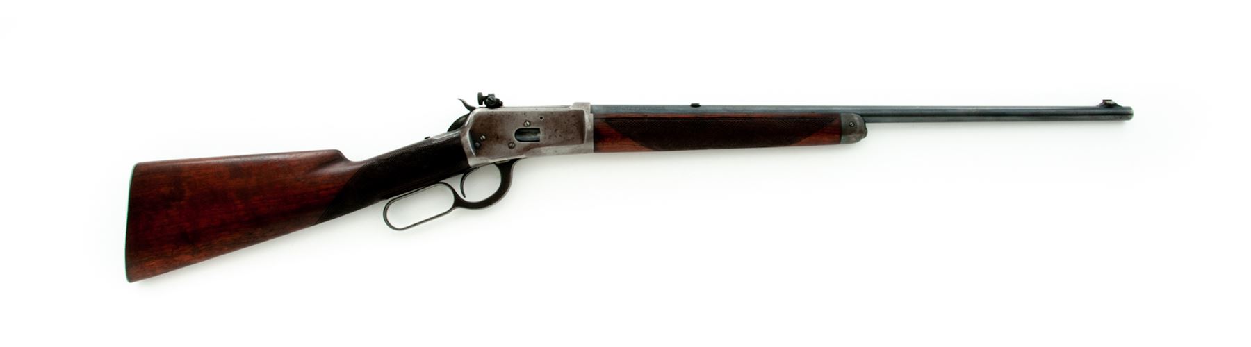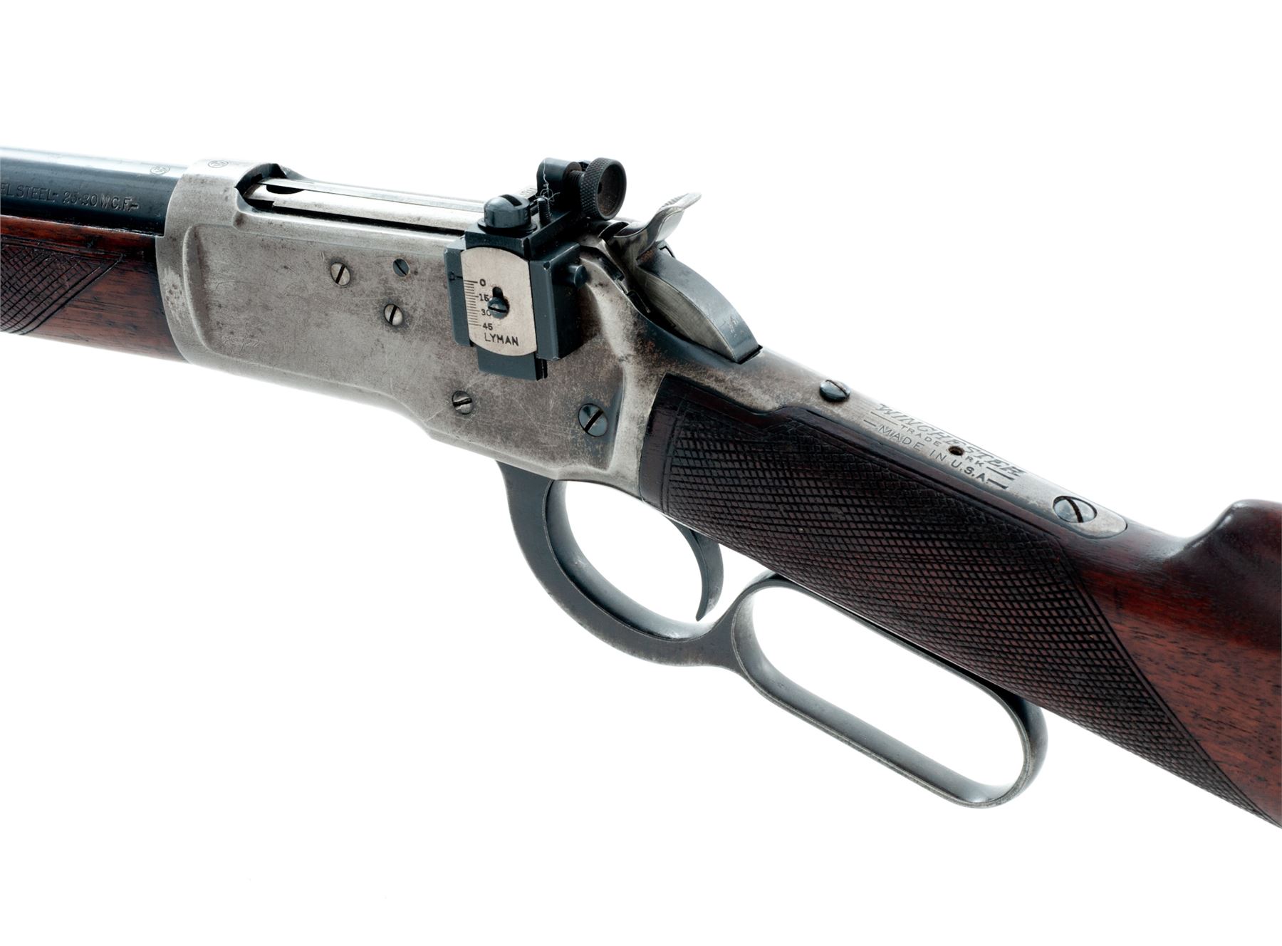 Winchester Model 53 Lever Action Rifle, #2578, .25-20 cal., 22'' barrel, blue finish, checkered walnut stock and forend, dovetailed bead front and Lyman adjustable receiver sight. Mfg'd 1925. Condition is very good. Barrel and button mag retain approx. 94% thinning blue; receiver with little original finish, except for protected areas. Stock and forend have been hobbyist checkered, with one additional hole drilled and tapped at center of upper tang. Good action, bright bore. Est.: $450-$650. (C&R)