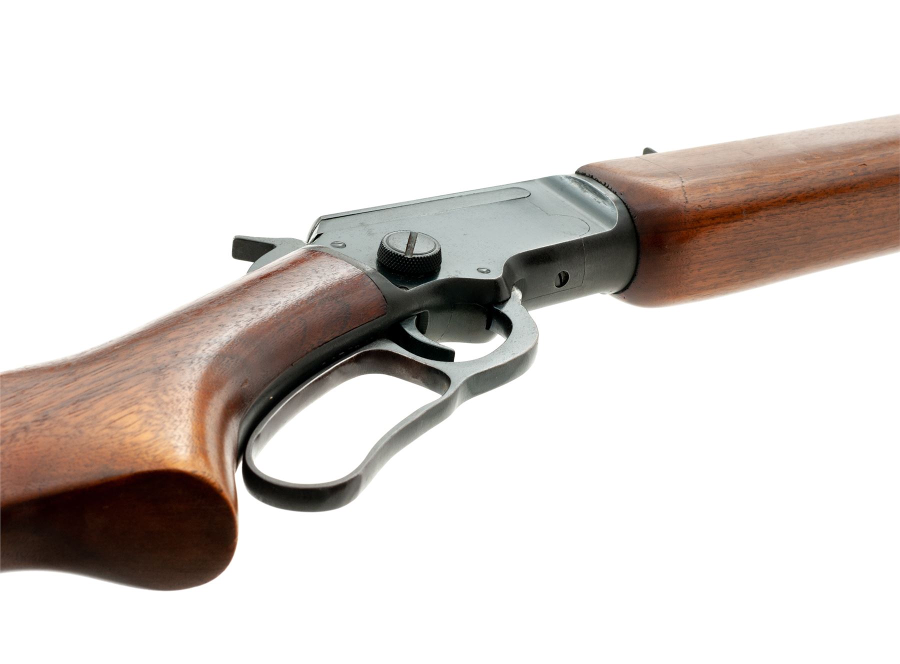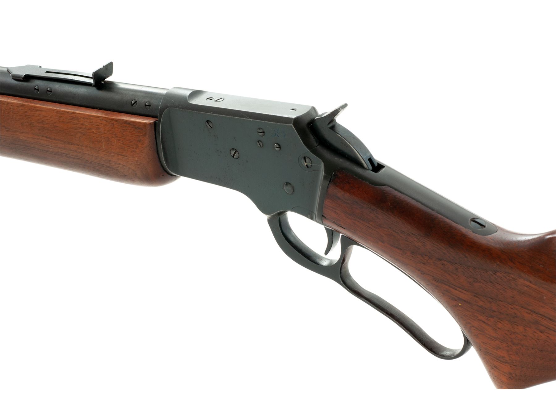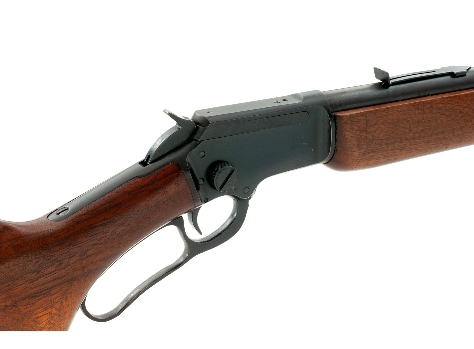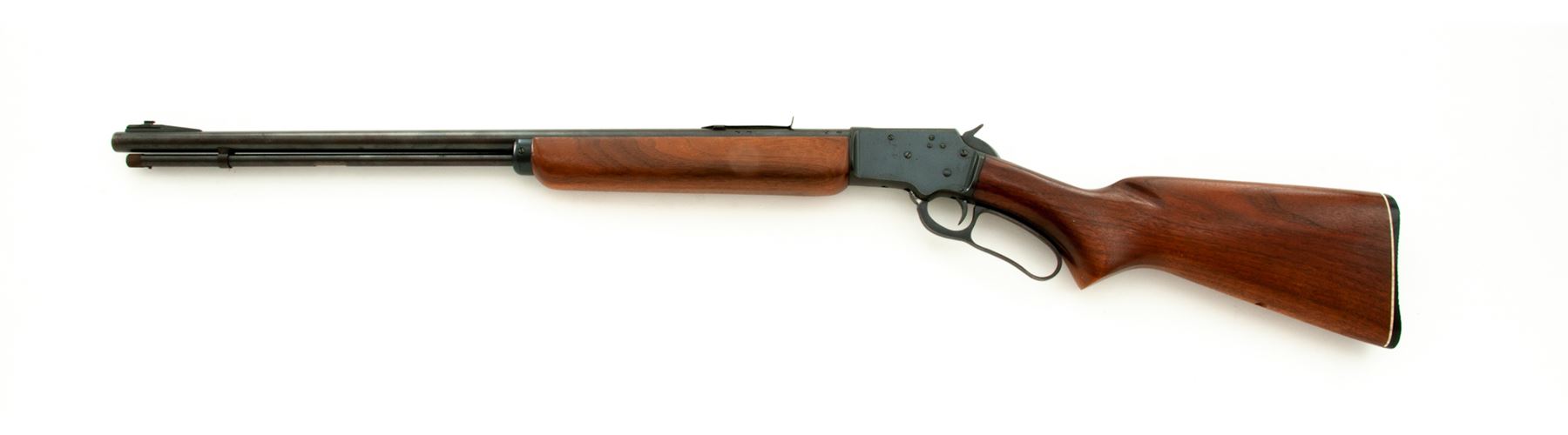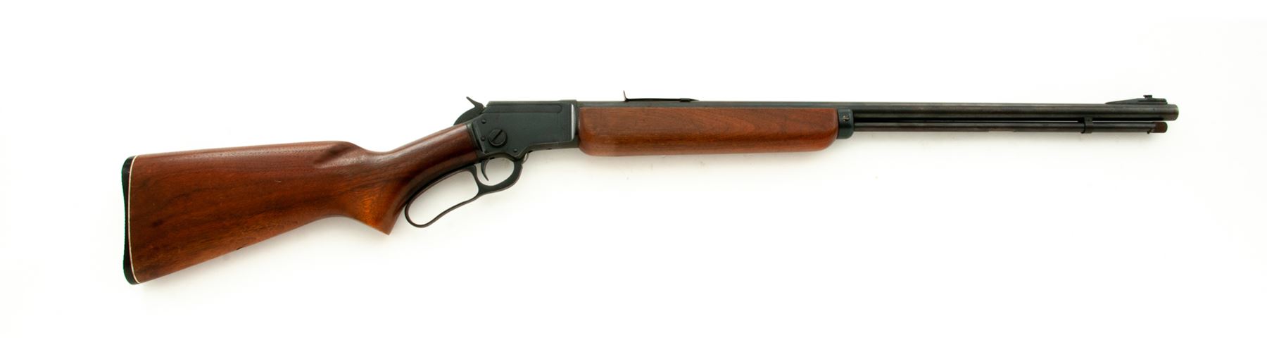 Mid-50's Marlin Model 39A Lever Action Rifle, #N11206, .22 S-L-LR cal., 24'' JM marked micro-groove barrel, blue finish, pistol-grip walnut stock and forend, buttstock with fluted comb and black composite Marlin buttplate with white spacer. Also featuring a brass bead front sight dovetailed into a ramped base, notched rear sight that is missing the elevator; top of receiver and left rear portion of barrel are factory drilled and tapped. Mfg'd 1956. Condition is very good. Receiver retains approx. 95% original blue finish with some toning at the upper tang and lever; barrel and magazine tube also retain a majority of their finish with mild thinning and general moderate toning, also with specks of oxidation mainly in the protected area between the barrel and magazine tube as well as the rear sight. Factory lettering is clear and defined. Wood with scattered small dings and scratches that are all normal signs of age and use; missing the Marlin ''bullseye'' at the bottom edge. Excellent crisp action and bore. Est.: $400-$600. (C&R)