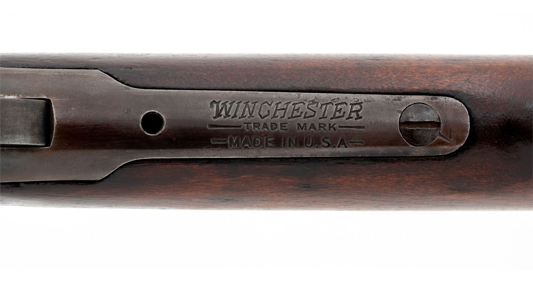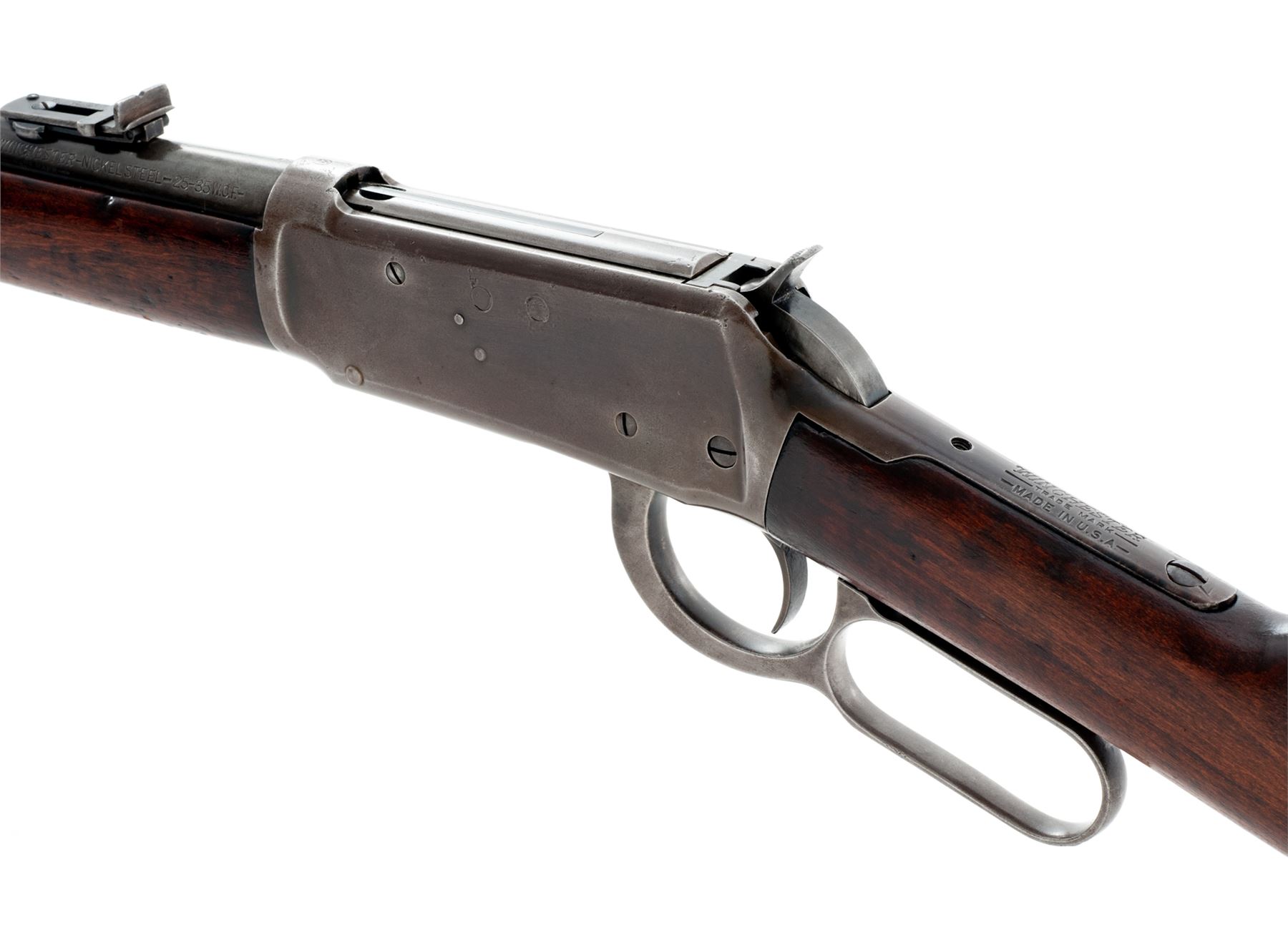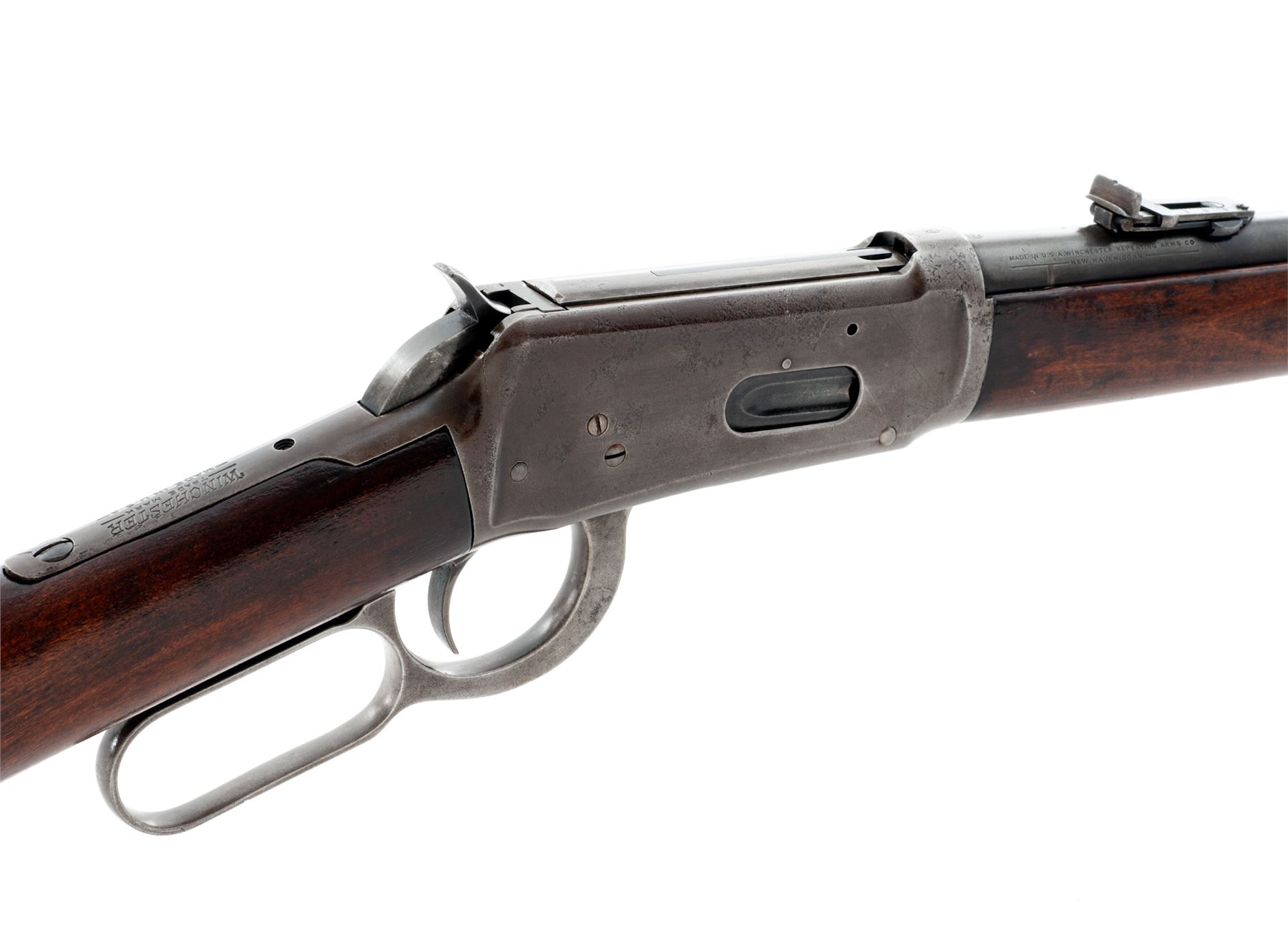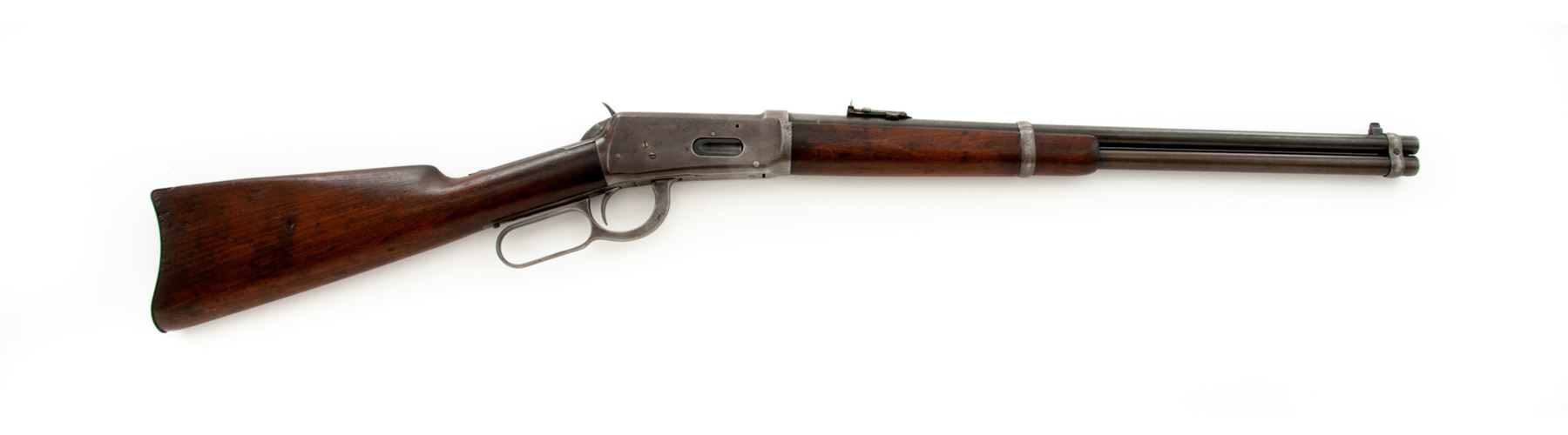 Winchester Model 94 Lever Action Carbine, #1057126, .25-35 cal., 20'' barrel, blue finish, gumwood stock and forend, with steel carbine butt. Mfg'd 1929. Condition is very good. Barrel and mag tube with approx. 60% thinning blue; receiver with 40% blue, light pitting, and plugged holes from old scope mount. Wood shows moderate wear and some sanding as the buttplate fits fractionally large. Good action and bore. Est.: $400-$600. (C&R)
