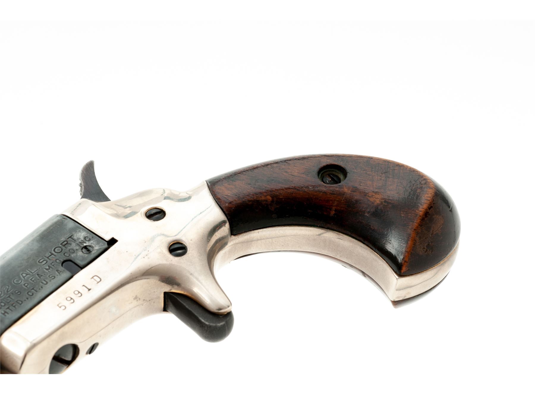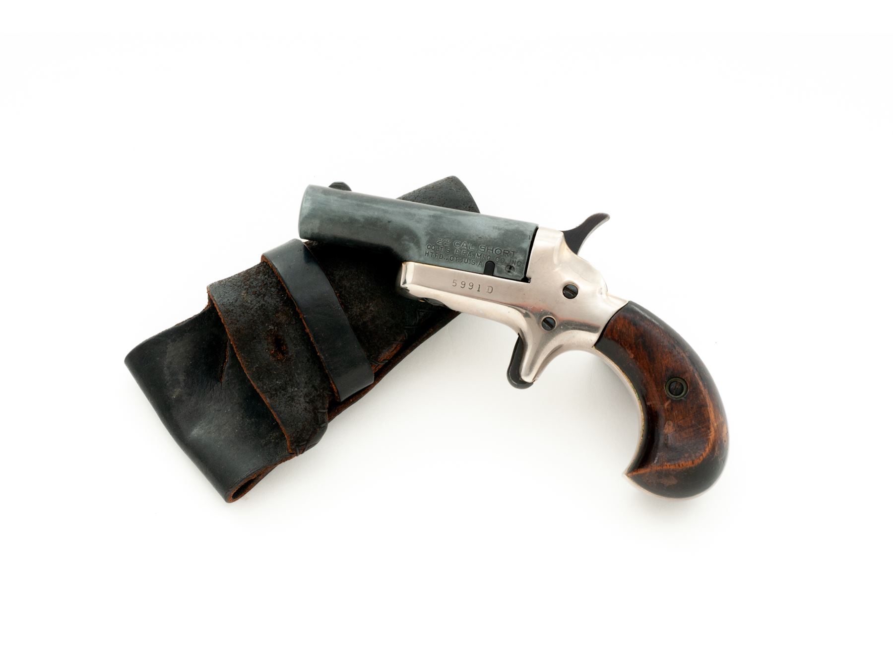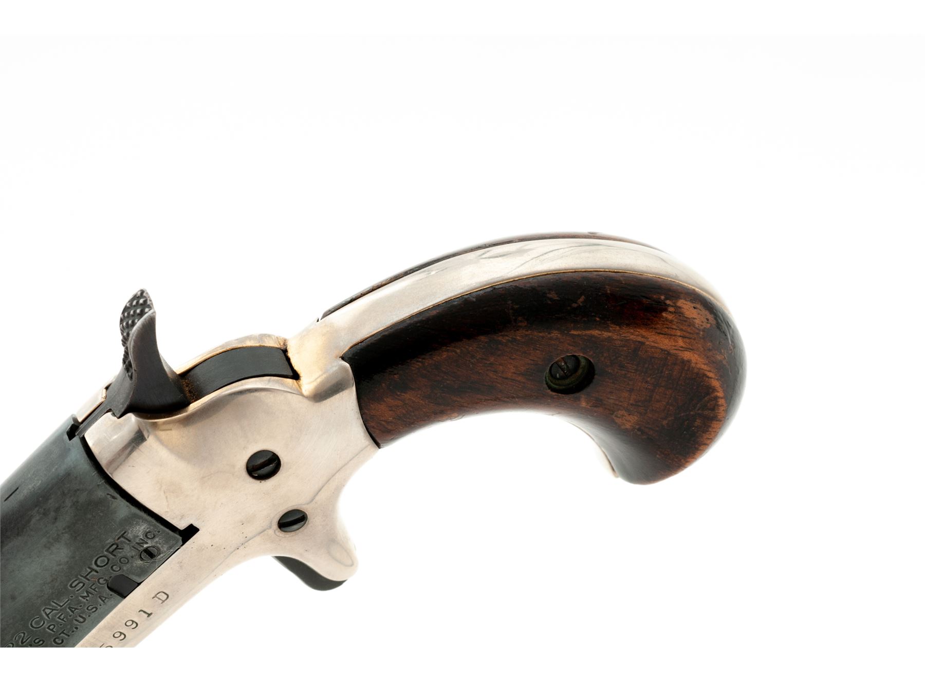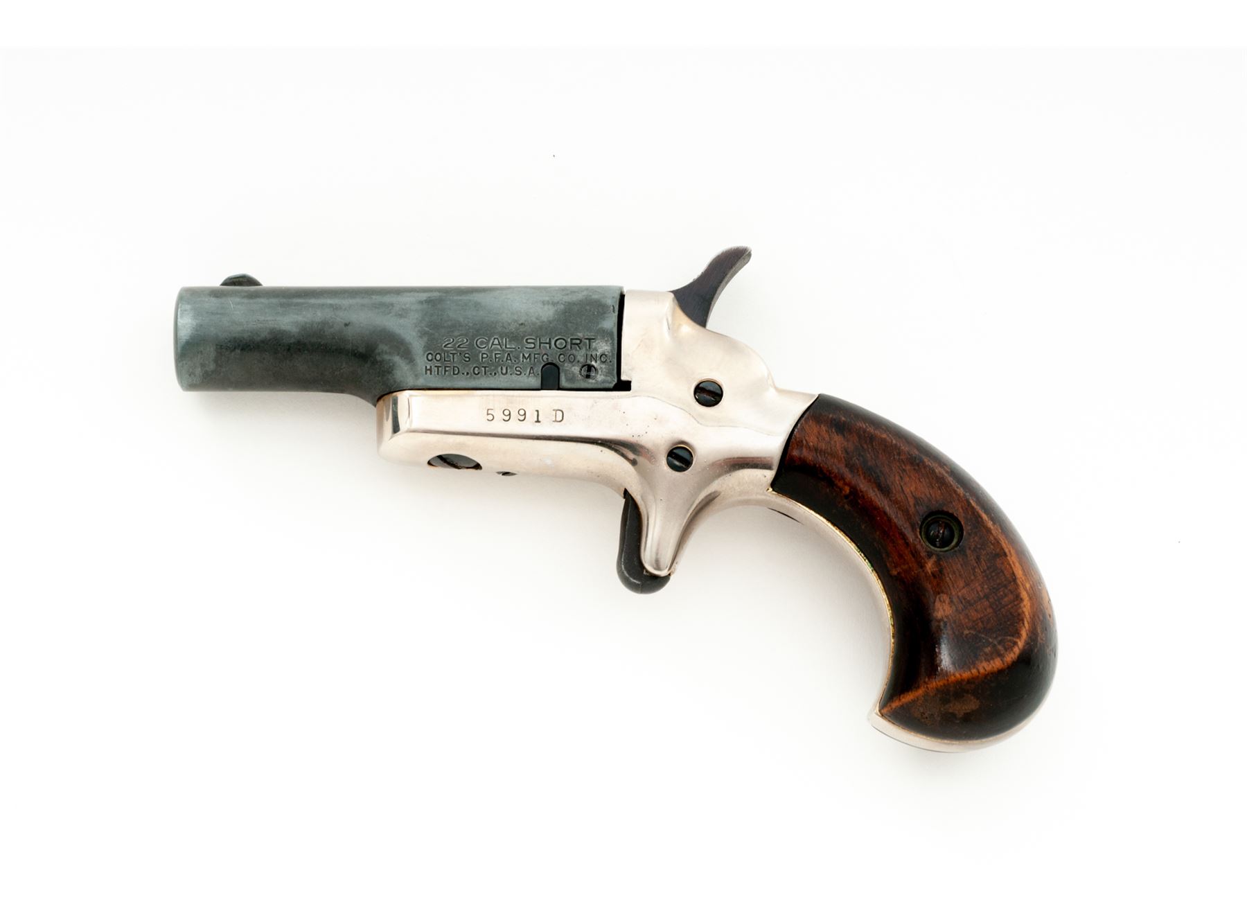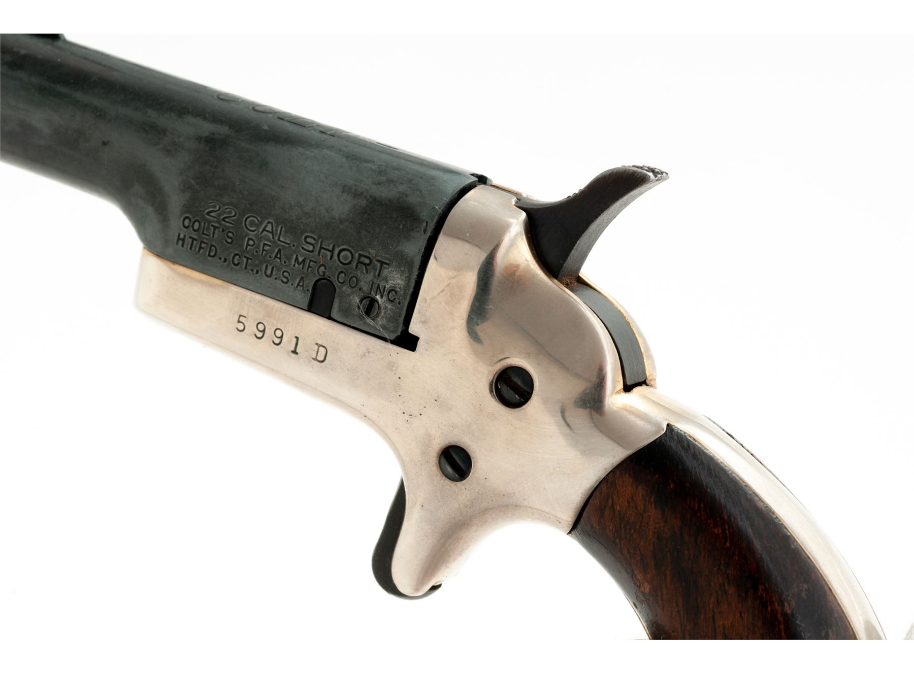Colt 4th Model Single Shot Derringer, with holster, #5991D, .22 Short RF cal., 2.5'' round barrel marked ''-COLT-'' in large italic letters on top, ''22 Ca. Short / Colt's P.F.A.Mfg. Co. Inc. / HTFD, CT U.S.A.'' on left side, originally blued and nickel-plated finish, two-piece varnished hardwood grips. Condition is very good to fine, retaining virtually all nickel; barrel blue appears to have been chemically removed. Grips show high edgewear but otherwise retain most of their varnish. Action is crisp, bore is shiny with shallow rifling. Black leather holster shows slight surface aging but is smooth and sound. Est.: $150-$250. (C&R/PPT)