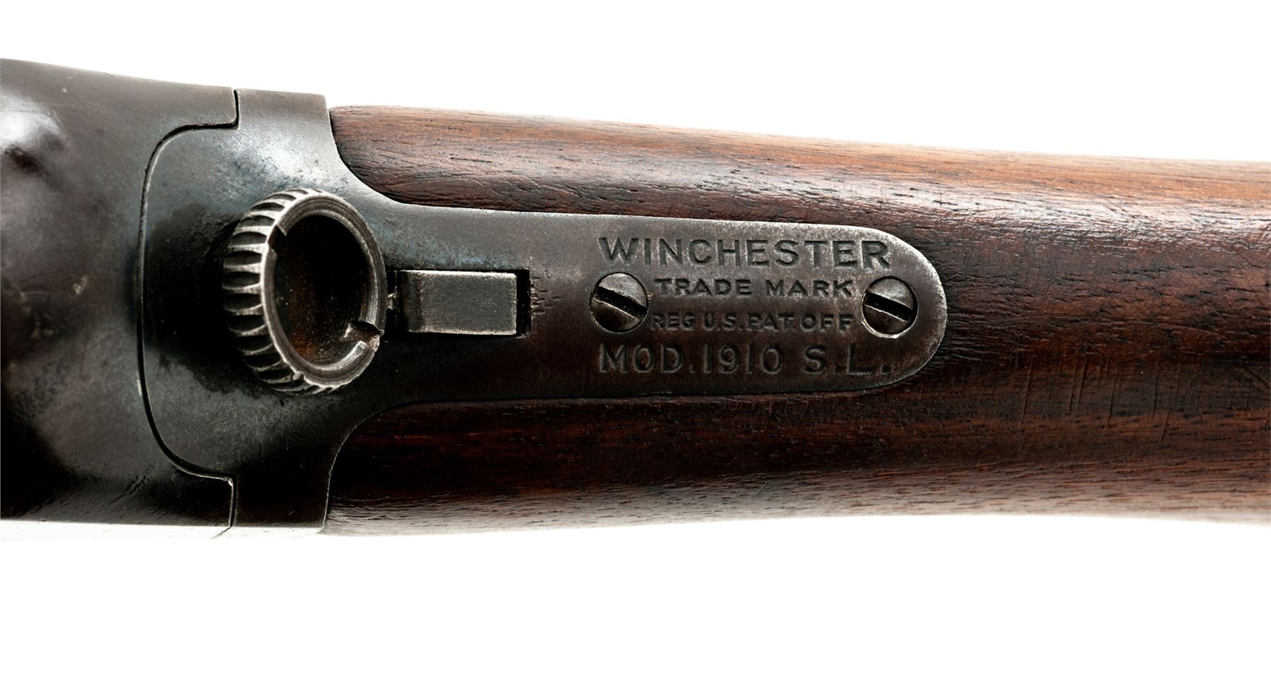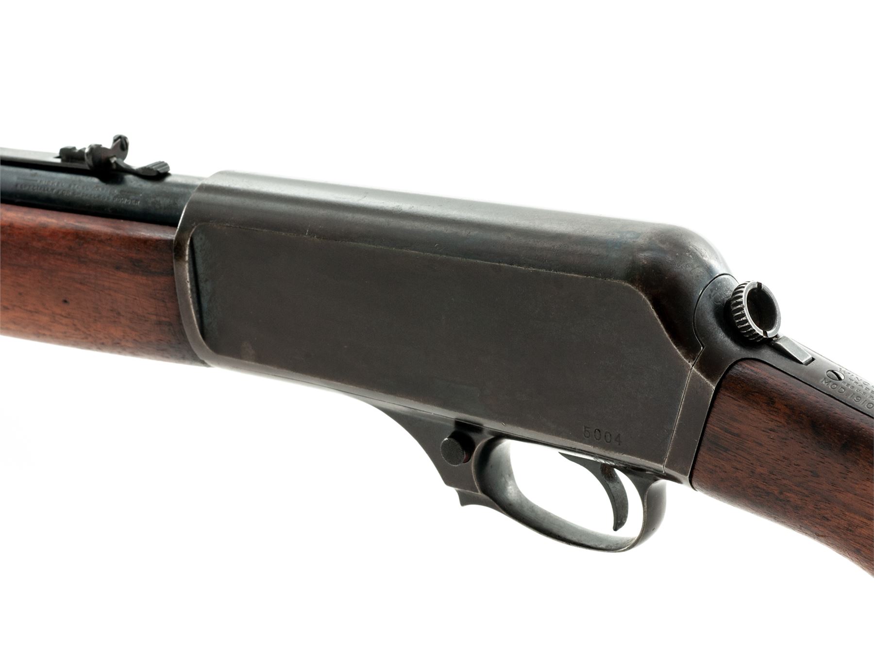 Winchester Model 1910 SL Self-Loading Rifle, #5004, .401 SL cal., 20'' barrel, blue finish, walnut stock and forend. Mfg'd 1911. No magazine. Condition is very good retaining approx. 85% moderately toning blue. Stock with light sanding and some oil darkening. Forend with repaired crack running full length. Good action and bore. Est.: $450-$650. (C&R)