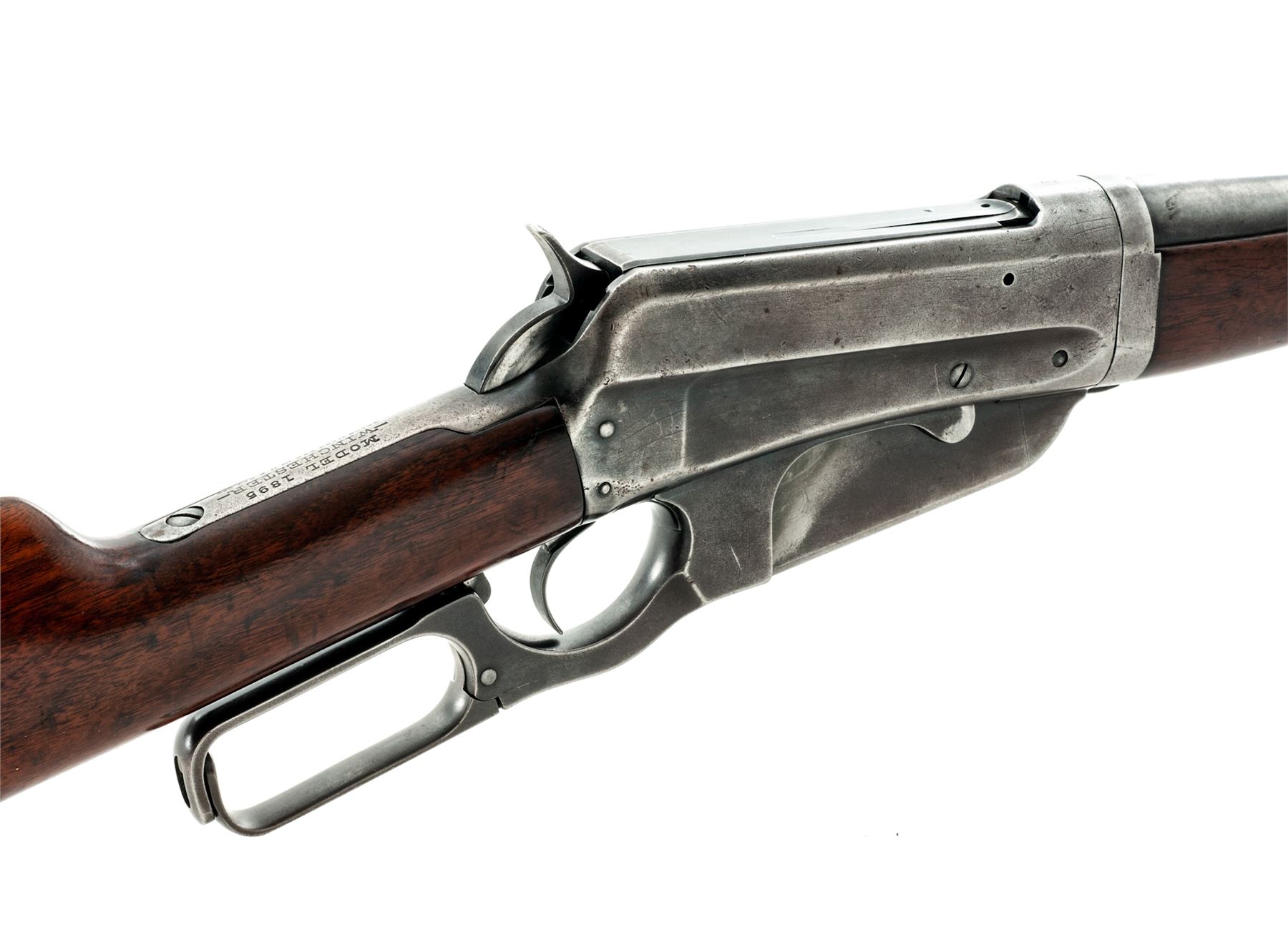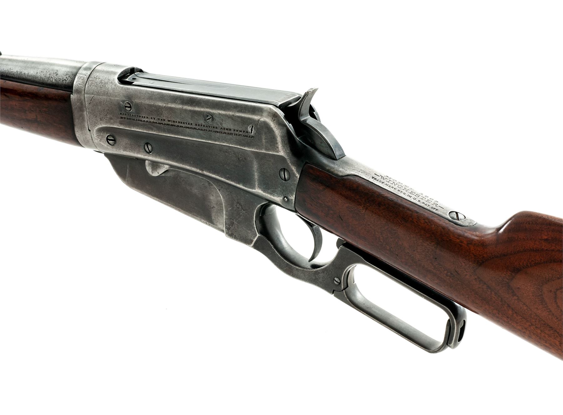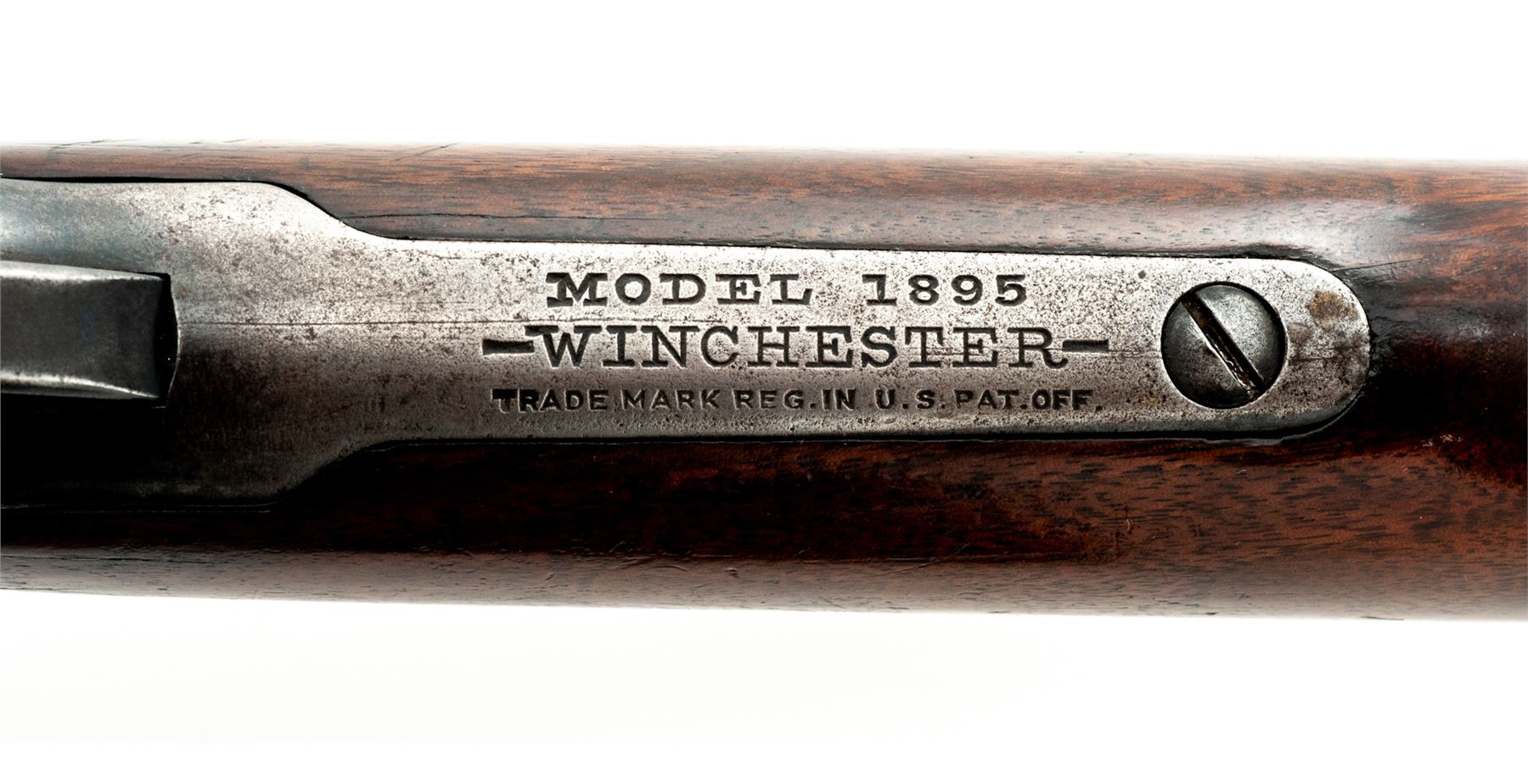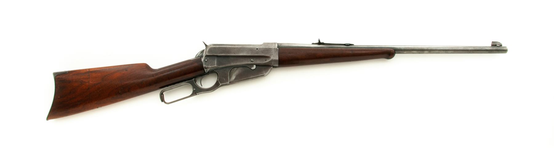 Winchester Model 1895 Takedown Lever Action Rifle, #84798, .30 Army (.30-40) cal., 22'' barrel, blue finish, walnut stock and handguard. Mfg'd 1915. Condition is near fine. Barrel retains approx. 80% blue; receiver with approx. 75% blue; receiver with three additional drilled and tapped holes above factory address markings from previous sight or scope application. Stock and forend with plugged swivel eyelets. Barrel extension for takedown feature locks up tightly. Good action, fine bore. Est.: $500-$750. (C&R)