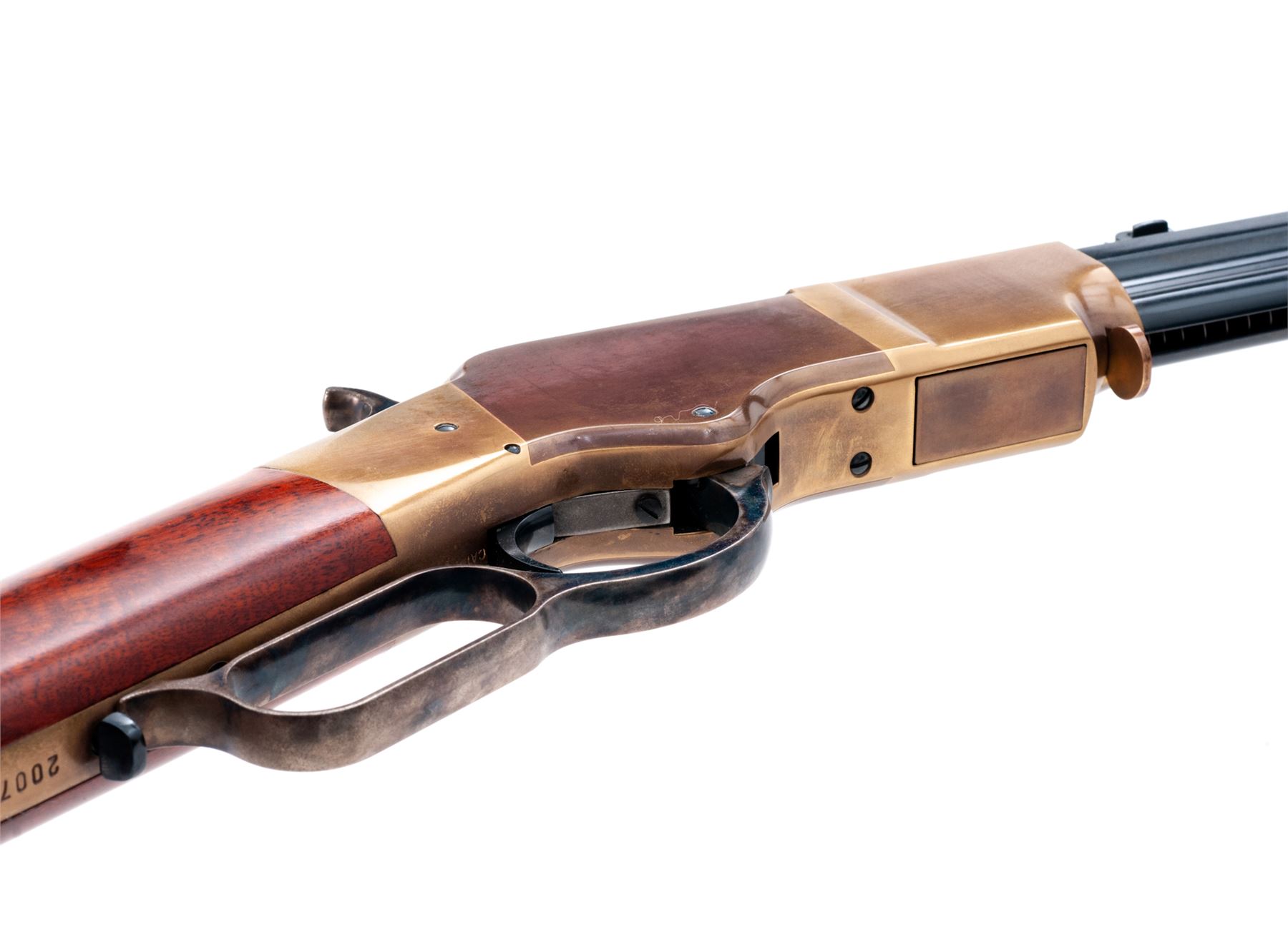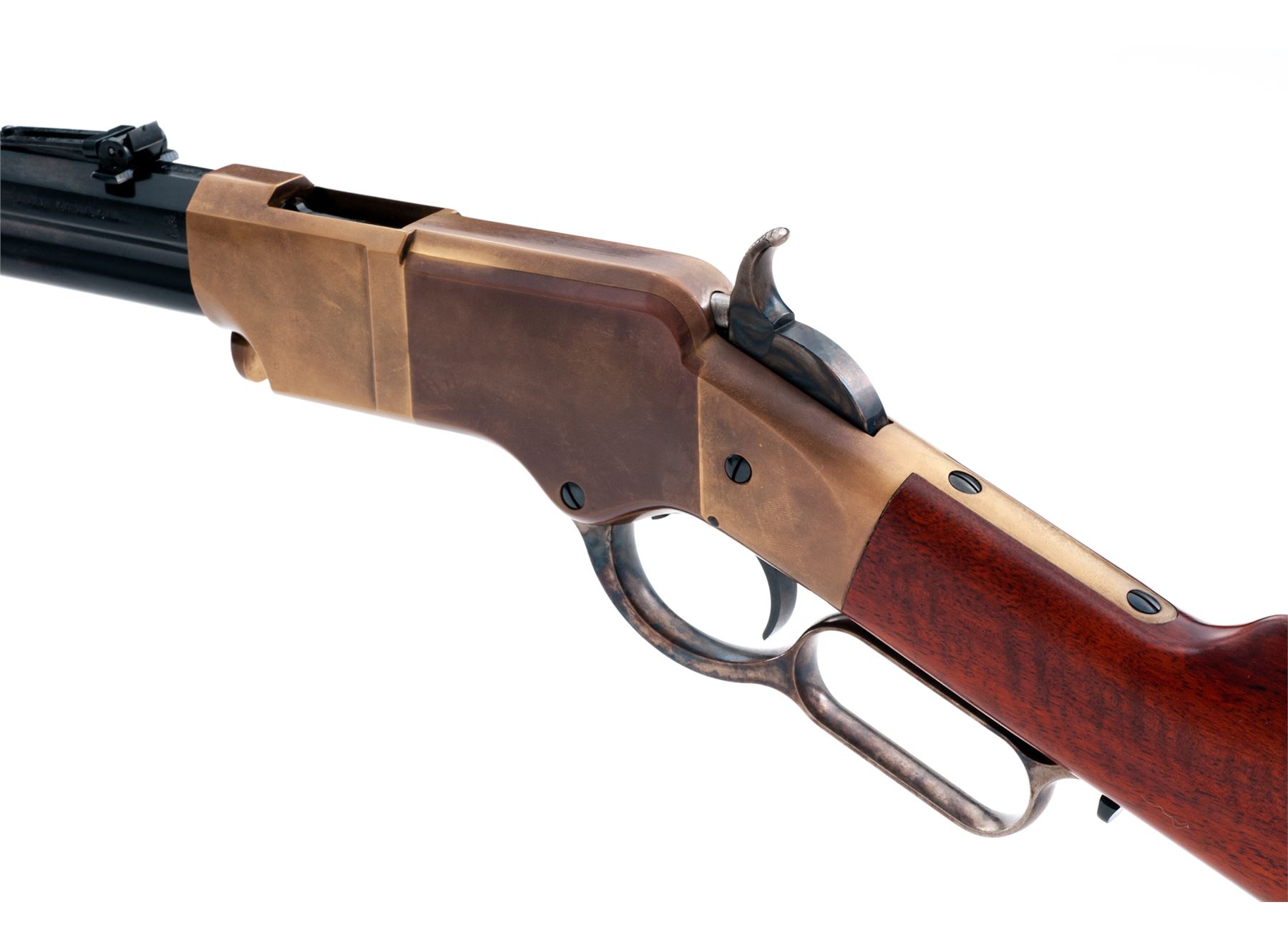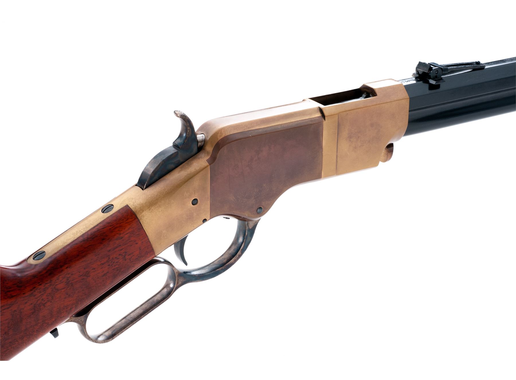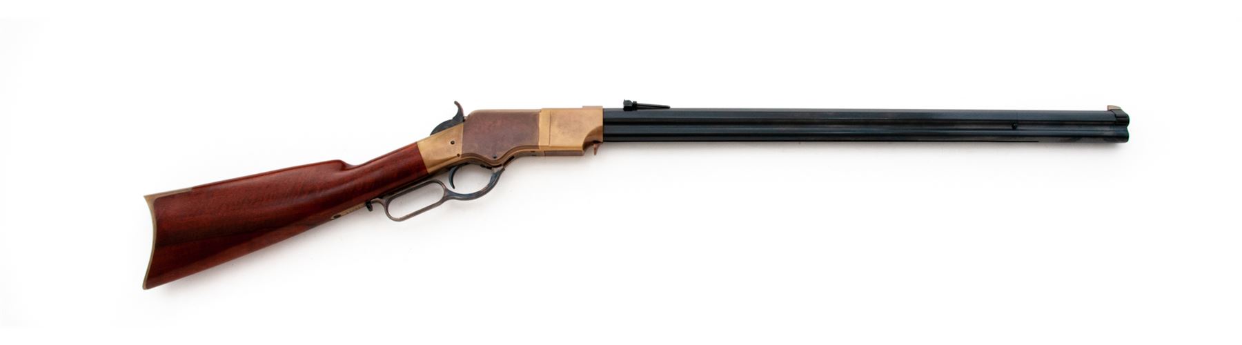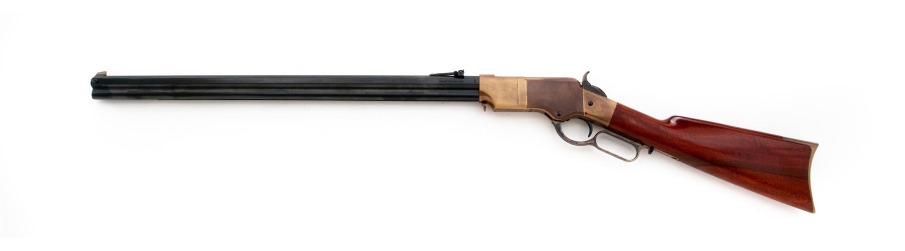 Reproduction Civil War Model 1860 Henry Lever Action Rifle, by Uberti-EMF, #20071, .45 Long Colt CF cal., blued 24'' octagonal barrel, with German silver blade and adjustable leaf rear sights, blued full-length cartridge magazine underneath is marked on top flat ''Henry's Patent. Oct. 16, 1860'' over ''Manufact'd by A. Uberti Gardone V.T. Italy'' ahead of rear sight; brass receiver, cartridge lifter, spring-activated cartridge follower, and crescent buttplate; case hardened hammer and loop operating lever; blued trigger; varnished walnut buttstock. Condition is as new and unfired, the blued and case hardened parts retaining all of their original factory finishes, the brass with a smooth light patina (sideplates with a pleasing slightly darker tone). Stock is solid, smooth, unmarked and with lovely grain and color. Action is butter-smooth; bore is brilliant with blue and sharp rifling. A beauty. Est.: $750-$1,000. (Modern)