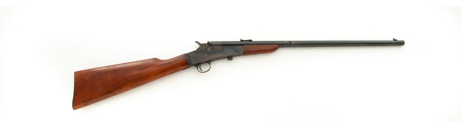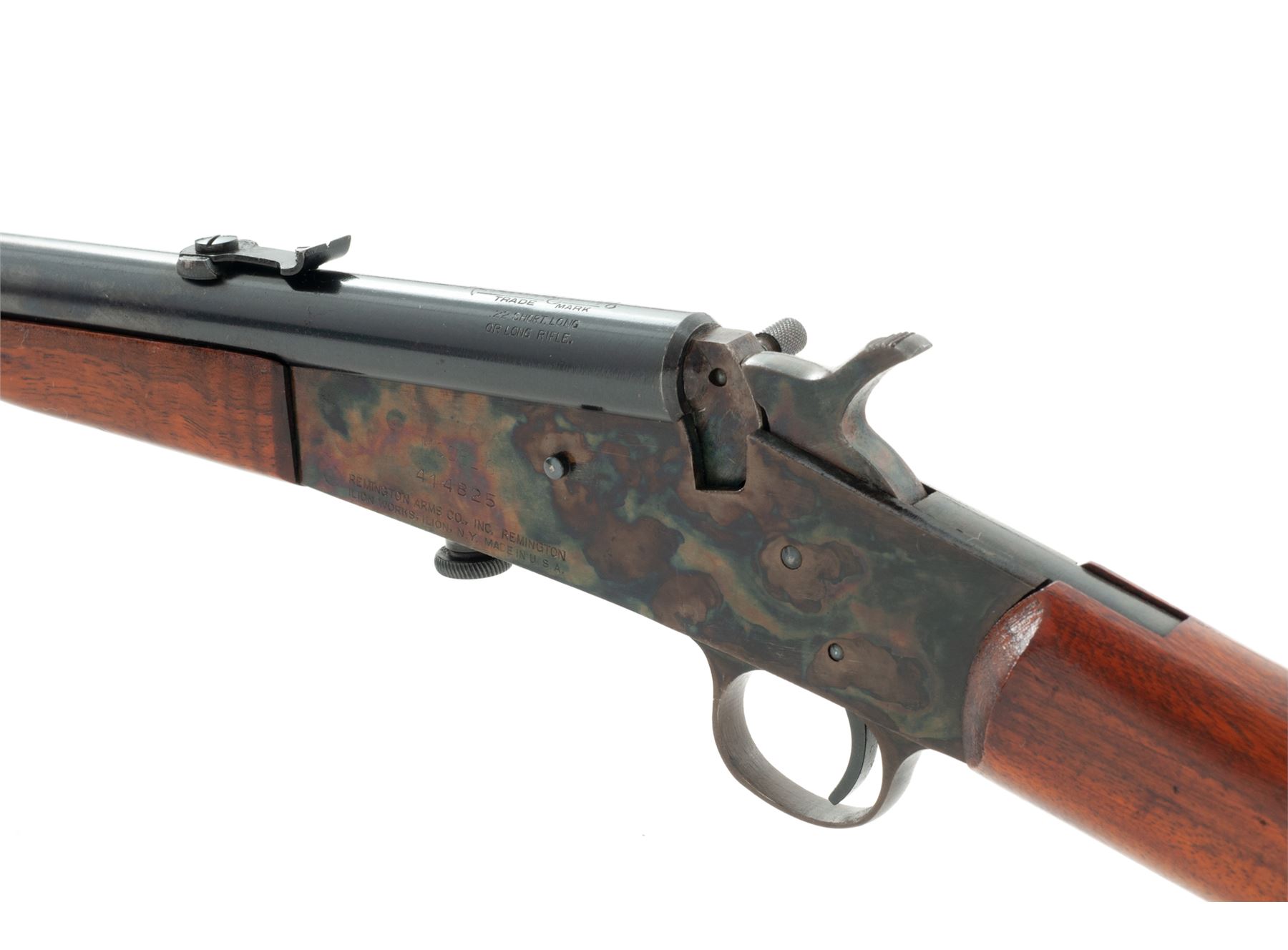 Remington Model 6 Falling Block Single Shot Boy's Rifle, #414825, .22 LR RF cal., 20'' blued round barrel having dovetailed bead-blade front and screw-adjustable open rear sights, with the serial number and tiny ''KTG (?)'' letters underneath ahead of forestock; case hardened receiver with integral triggerguard is marked on left side ''Model 6/414825/Remington Arms Co. Inc. Remington/Ilion Works, Ilion, N.Y. Made in U.S.A.'' in four lines; case hardened hammer and breechblock; varnished walnut forend and buttstock with steel buttplate having the encircled ''Remington/UMC/Trade Mark'' logo. Mfg'd 1902-33. Condition is as new, the barrel retaining approx. 99% deep original blue, the receiver, breechblock and hammer having rich, highly-figured case hardening colors. Stocks with all of their original varnish finish and lovely grain and color. Action is crisp and smooth; bore is brilliant with sharp rifling. An exceptional Remington rifle, made highly desirable in this .22 Long Rifle caliber and with its dual blue and case hardened finishes. Est.: $350-$550. (C&R)