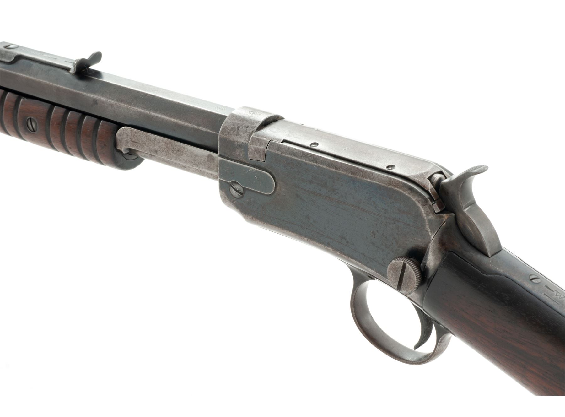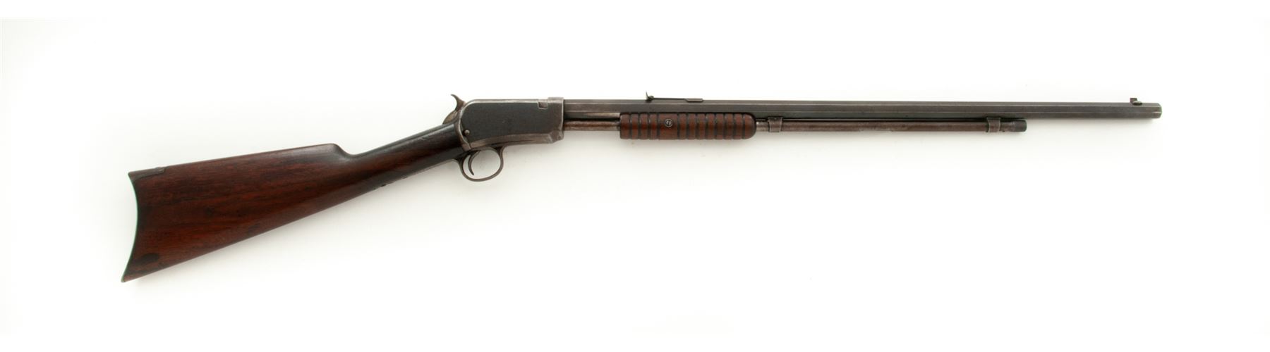 Winchester Model 1890 Pump Action Rifle, #463929, .22 WRF cal., 24'' octagonal barrel, blue finish, walnut stock, with early small forend. Mfg'd 1908. Condition is very good to near fine retaining approx. 85% thinning and toning blue. Stock and forend with small scuffs and scratches, and oil darkening at metal surfaces. Good action, very good bore. Est.: $500-$750. (C&R)