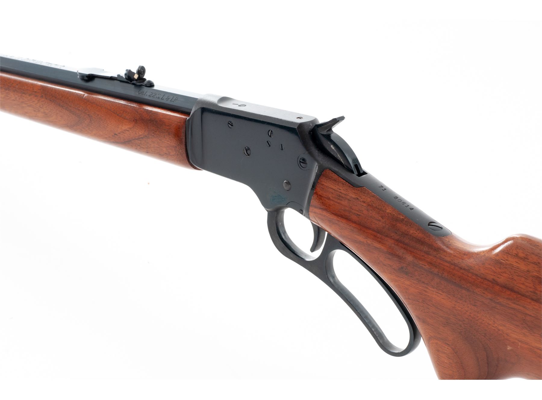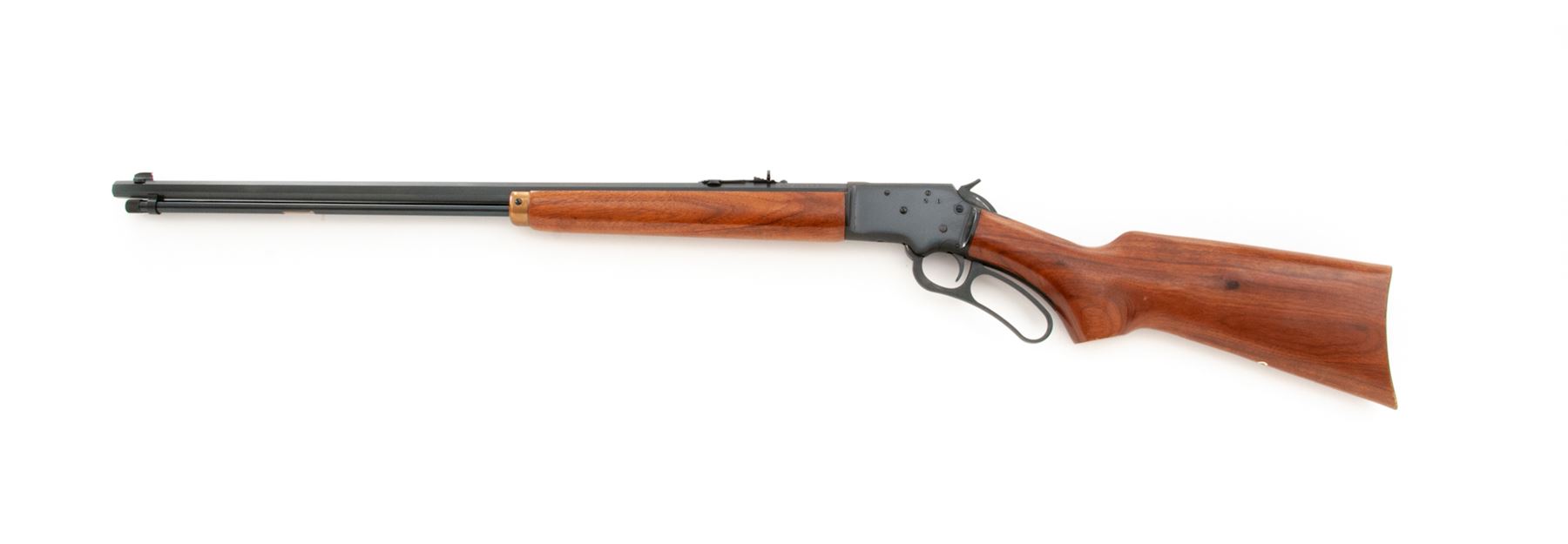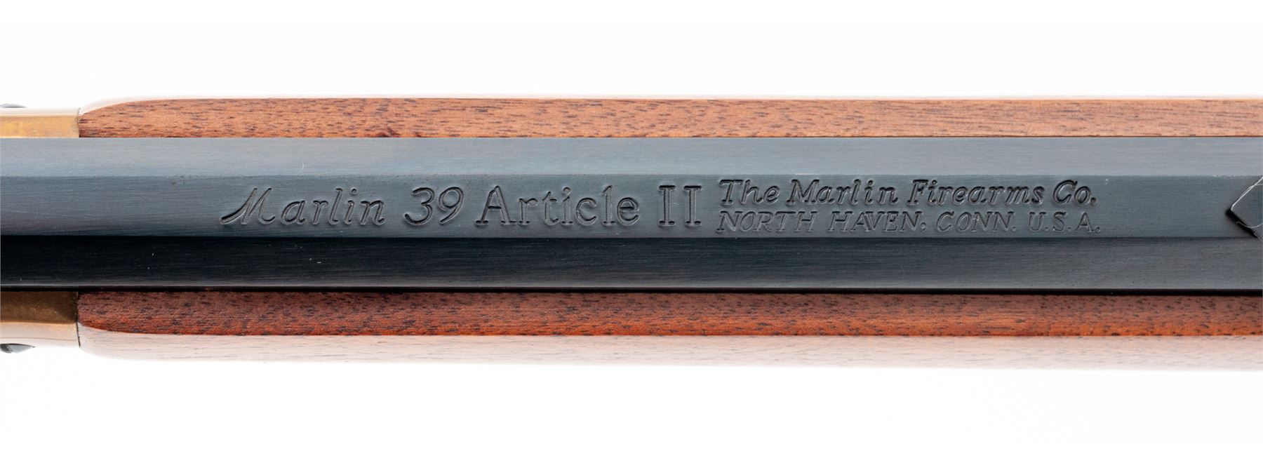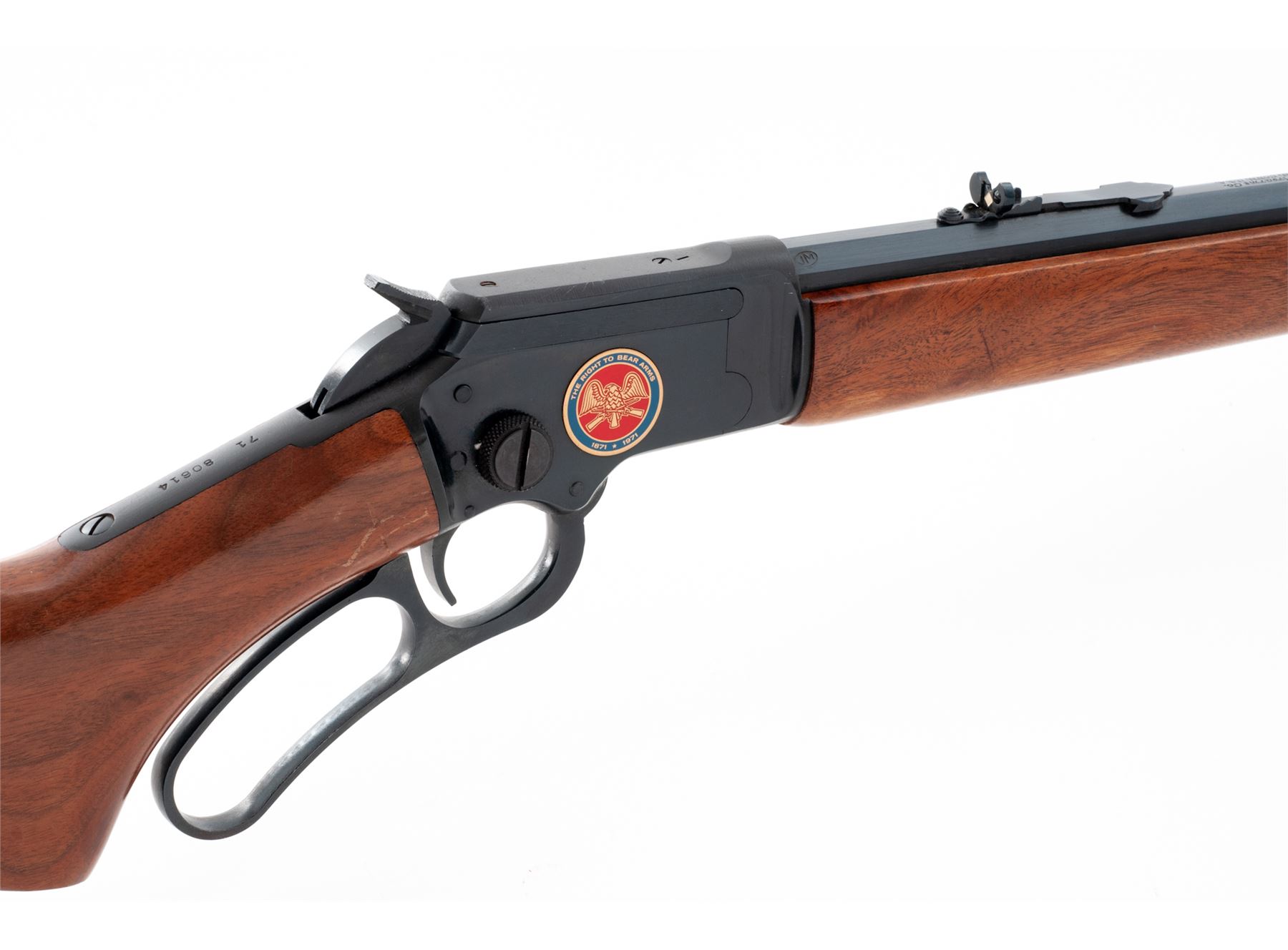 Marlin Model 39A Article II NRA Centennial Commemorative Lever Action Rifle, #7180614, .22 S-L-LR cal., 24'' JM marked octagon barrel, blue finish, right side of receiver with a commemorative 1871-1971 ''The Right To Bear Arms'' medallion. Oil-finished pistol-grip walnut stock with brass buttplate and forend cap. Sights include a dovetailed blade front with brass bead and a semi-buckhorn rear sight. Limited to a production of 6,244 in 1971. Metal surfaces rate as excellent with approx. 98% original blue finish; factory lettering with crisp raised edges. Wood is very good with a nice even finish and color; forend and wrist with shallow impressions from handling; bottom edge of buttstock with scattered small dents and scratches. Brass shows normal mild toning. Excellent action and bore. Est.: $600-$900. (Modern)