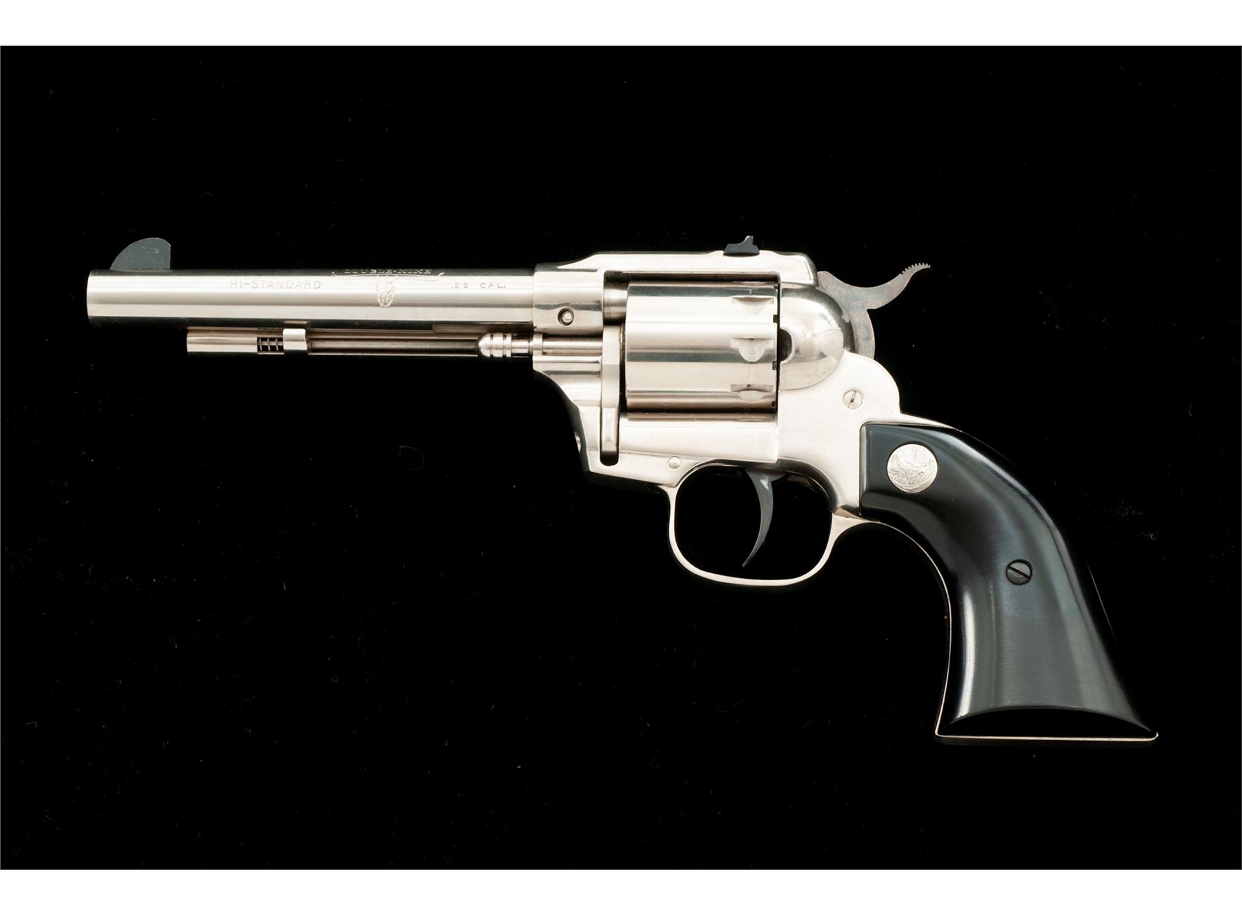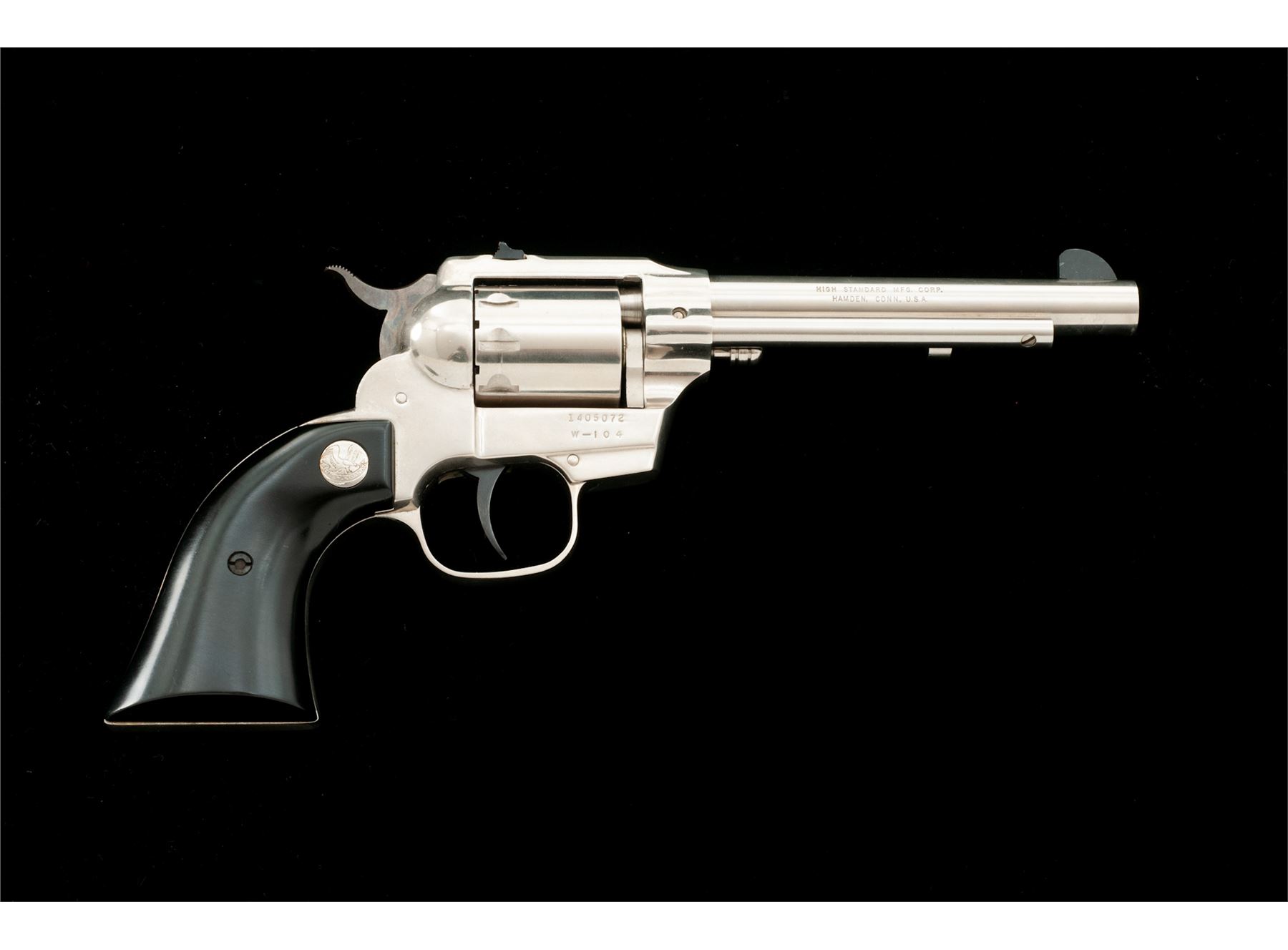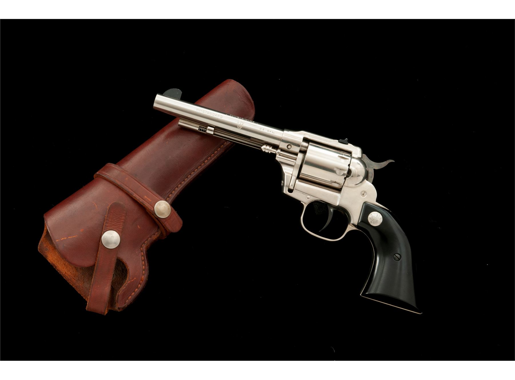 High Standard Model W-104 Double-Nine Single Action Revolver, #1405072, .22 cal., 9-shot cylinder, 5.5'' barrel, nickel finish, aluminum frame, smooth black plastic grips with High Standard medallions. Fixed sights include a blade front and square notched rear. Made in Hamden, Conn. Included is a brown leather right-hand holster by Viking. Overall condition is very good. There is no noticeable flaking, etc. to the nickel finish; metal with intermittent light scratches; cylinder with a moderate index line; cylinder face and inside of the frame with very little powder residue or staining. Grips are nice, no chips or cracks, only a few normal light handling marks. Barrel address and other factory lettering is clear and defined. Excellent action and mirror bright bore. Holster shows signs of moderate wear. Est.: $250-$400. (C&R/PPT)