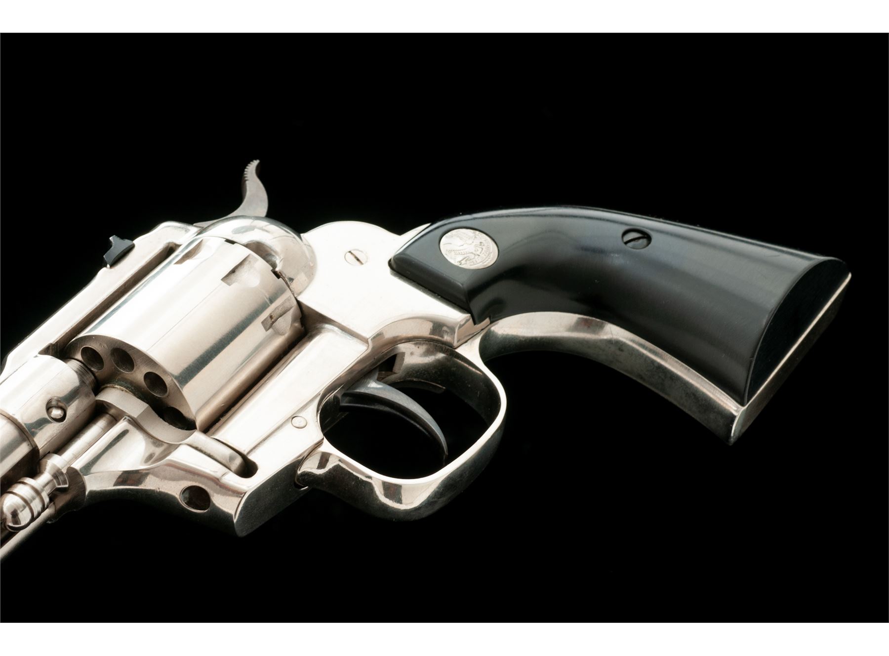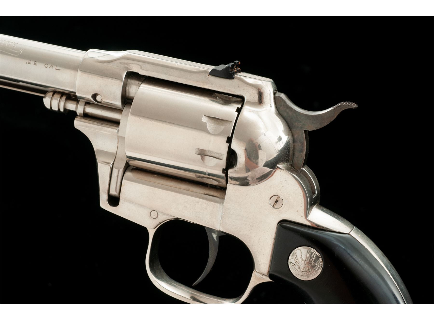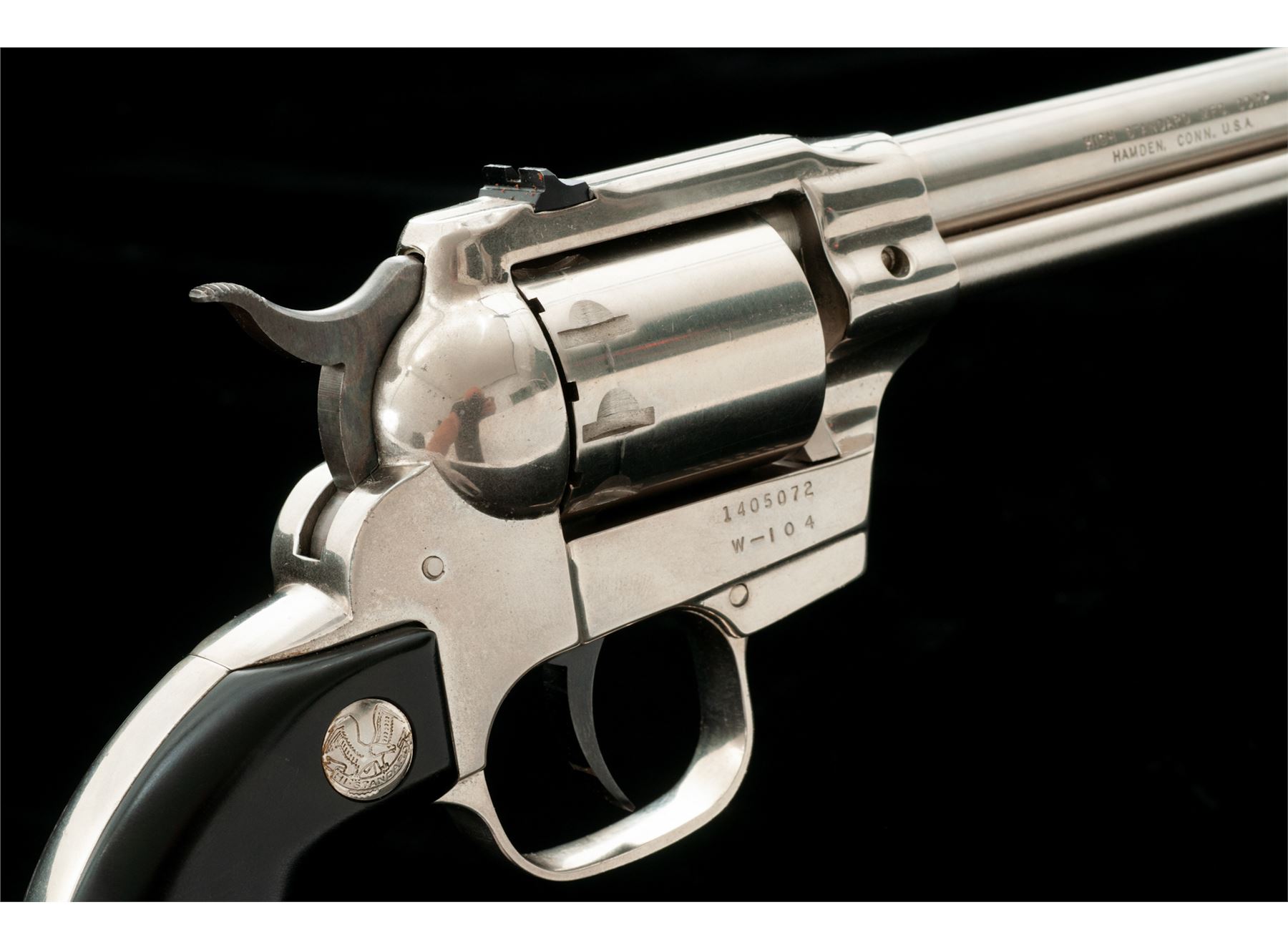 High Standard Model W-104 Double-Nine Single Action Revolver, #1405072, .22 cal., 9-shot cylinder, 5.5'' barrel, nickel finish, aluminum frame, smooth black plastic grips with High Standard medallions. Fixed sights include a blade front and square notched rear. Made in Hamden, Conn. Included is a brown leather right-hand holster by Viking. Overall condition is very good. There is no noticeable flaking, etc. to the nickel finish; metal with intermittent light scratches; cylinder with a moderate index line; cylinder face and inside of the frame with very little powder residue or staining. Grips are nice, no chips or cracks, only a few normal light handling marks. Barrel address and other factory lettering is clear and defined. Excellent action and mirror bright bore. Holster shows signs of moderate wear. Est.: $250-$400. (C&R/PPT)