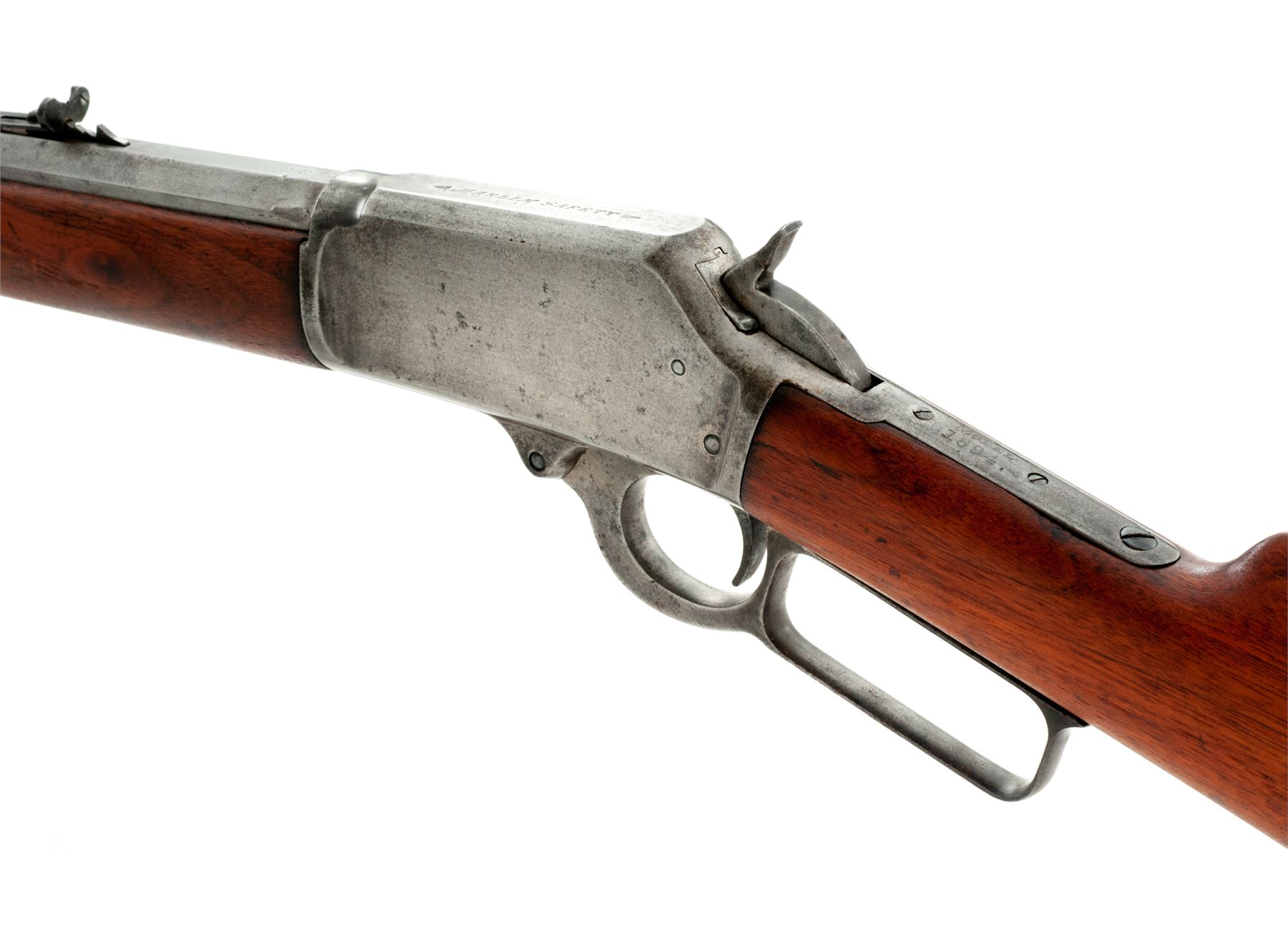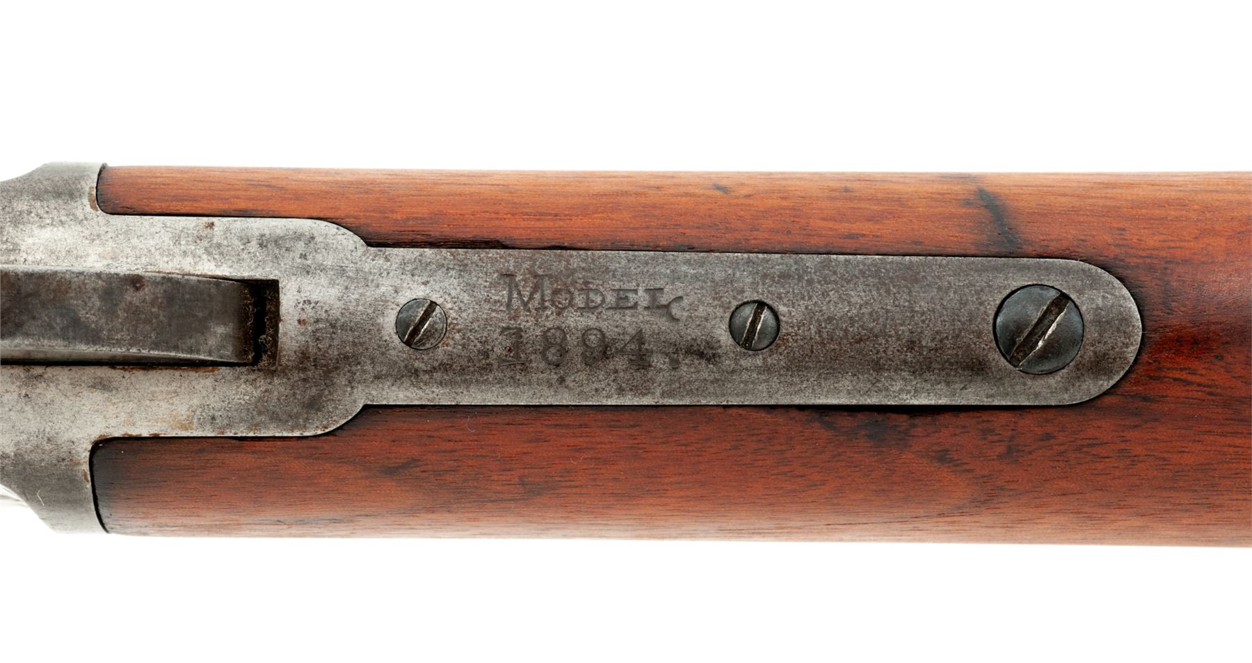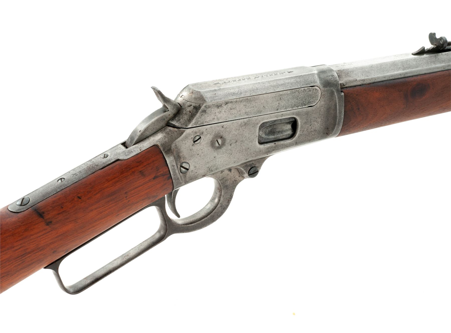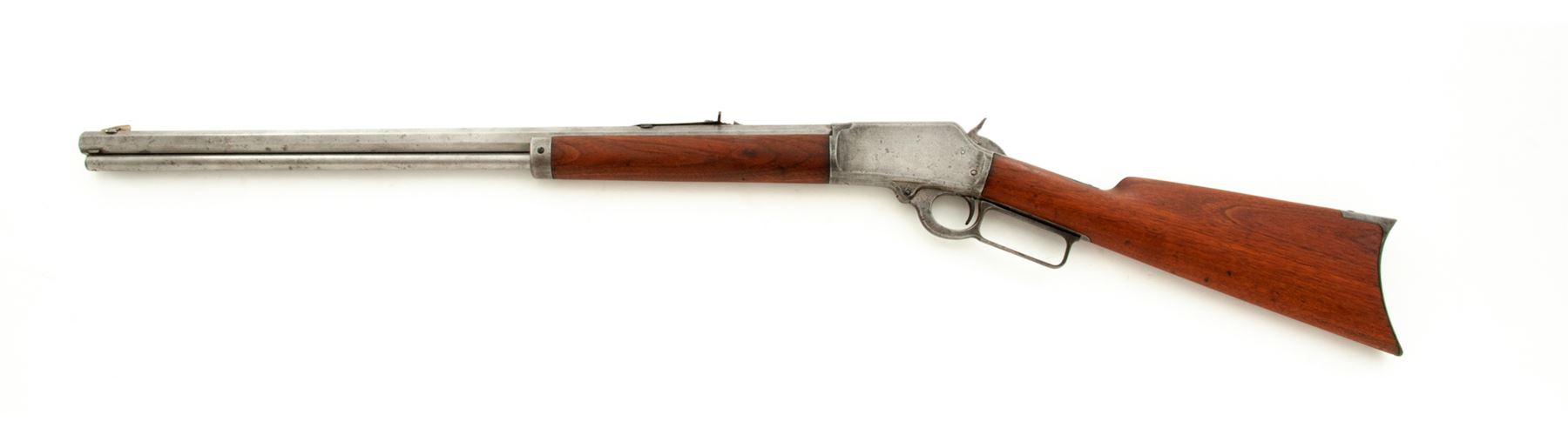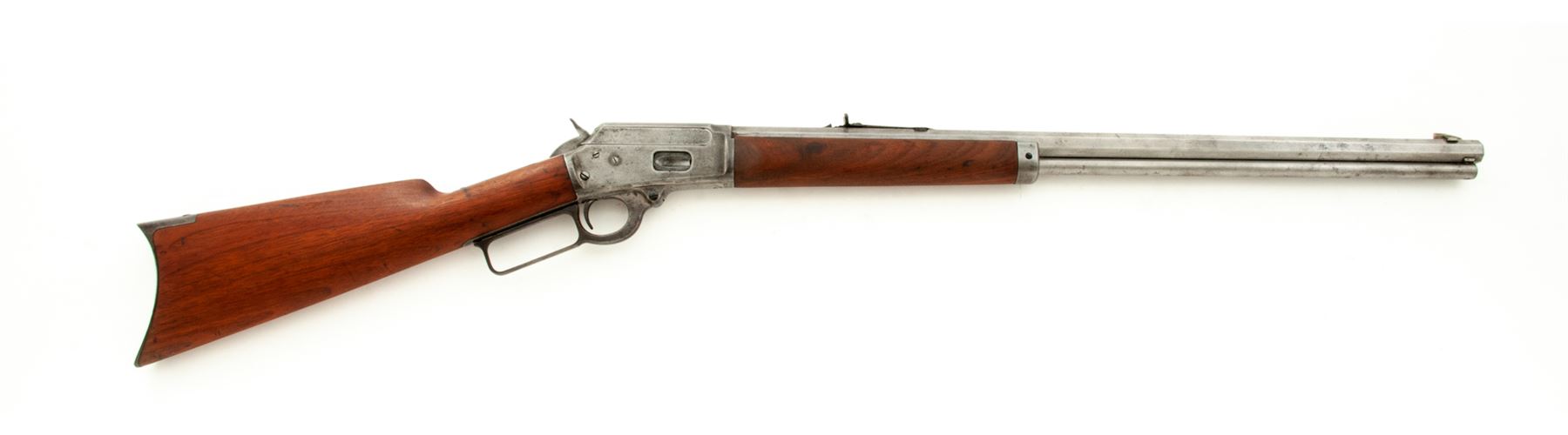 Marlin Model 1894 Lever Action Rifle, #231888, .25-20M cal., 24'' octagon barrel, metal retains no original finish, plain straight grip walnut stock and forend, crescent steel buttplate, Rocky Mountain type front sight, semi-buckhorn rear sight with elevator. Barrel with the standard two-line ''August 1, 1893'' last patent date address; upper tang is marked ''MODEL / 1894''; top of receiver ''MARLIN SAFETY''. Rifle was mfg'd in 1901 and therefore is not drilled and tapped for the Hepburn receiver sight. Condition is good. Metal is mostly silvery gray in color with patches of cloudy dark spotting, some moderate cleaned pitting that occurs mainly on the barrel and magazine tube. Factory lettering is clear and defined. Barrel near the receiver with a few toolmarks. Wood has been lightly sanded leaving intermittent dark impressions and scratches, as well as a small reveal at some of the adjoining metal surfaces. Overall wood retains a good color and a linseed oil type finish. Crisp lever with a smooth hammer and trigger; dark lightly frosted bore with good rifling. Est.: $400-$600. (C&R)