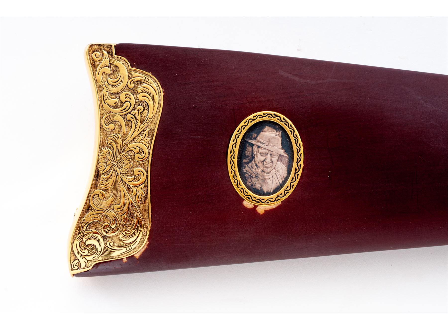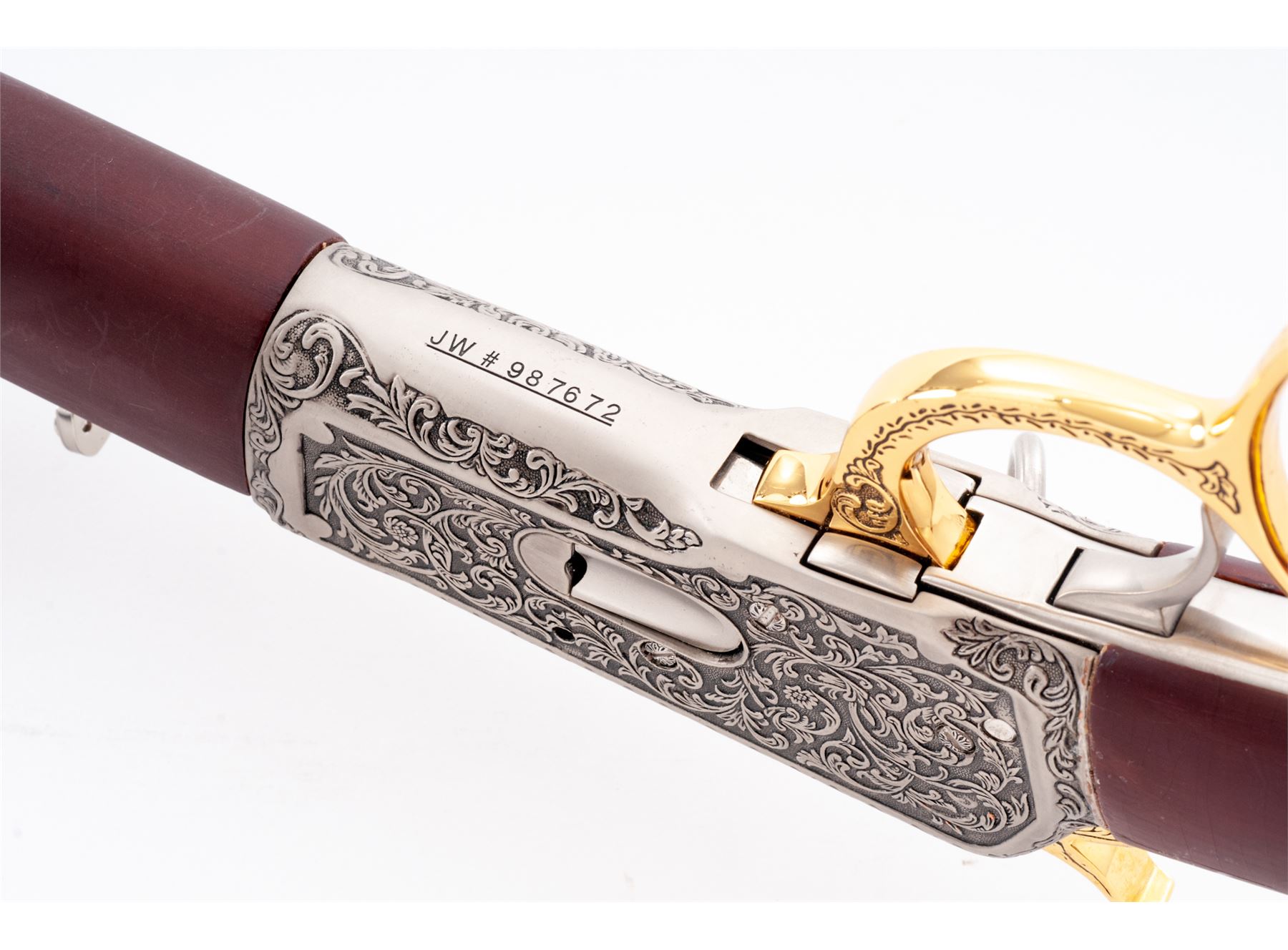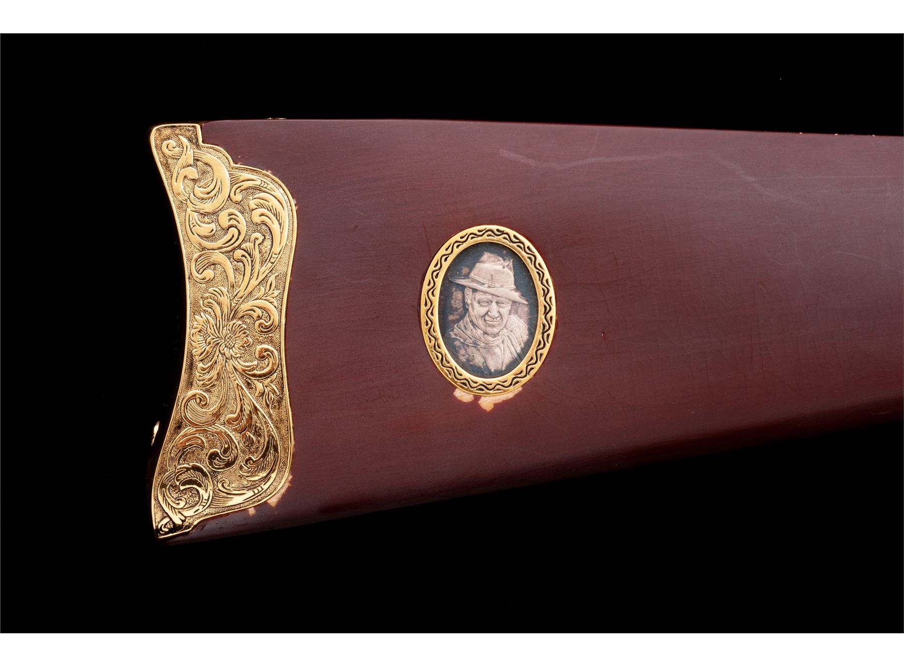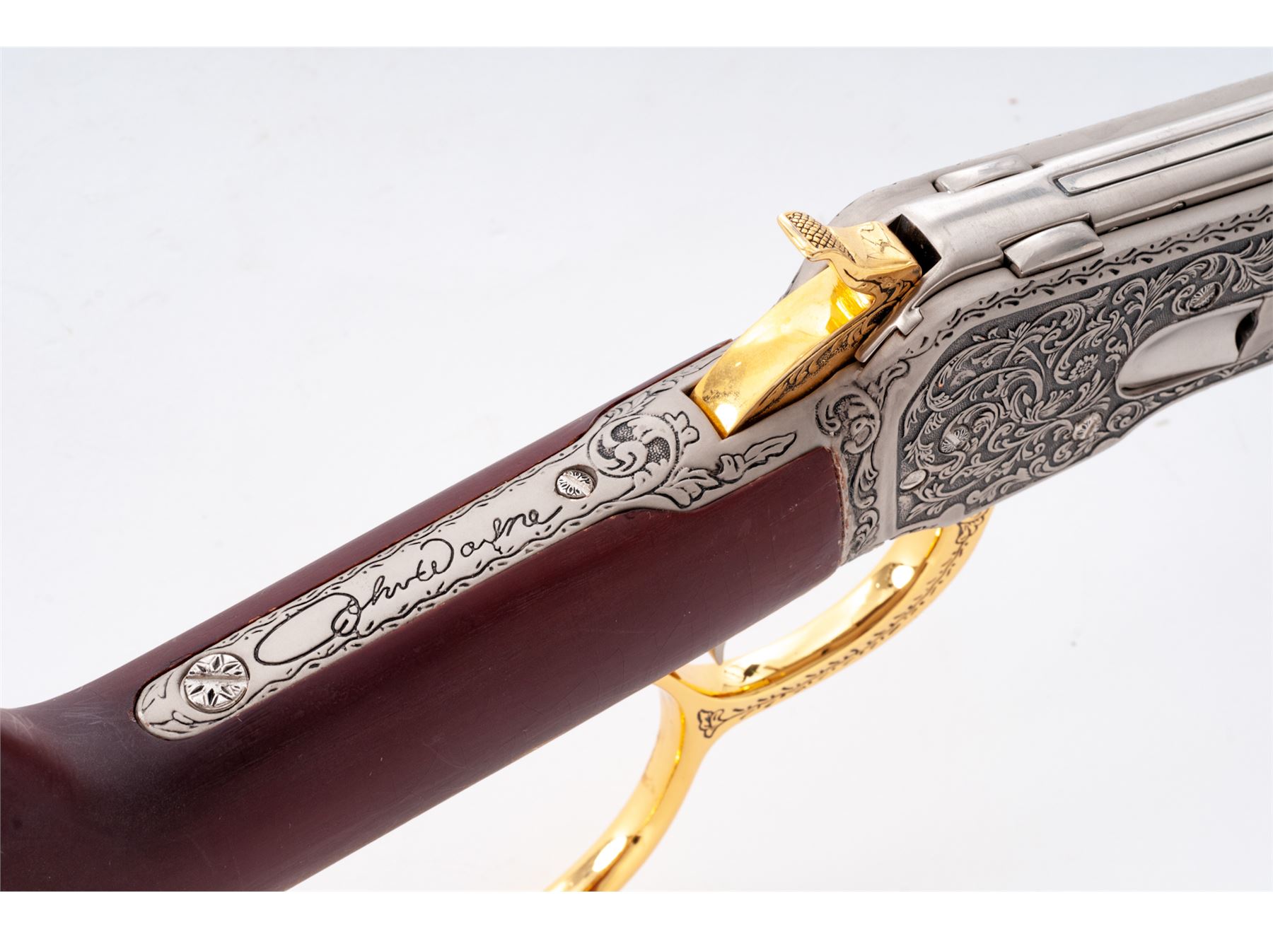 Non-Firing John Wayne Model 92 Western Commemorative Tribute Rifle, by The Franklin Mint, JW#987672, fancy engraved frame, gold embellishments, plastic stock, with large loop lever, and display board. In original box with paperwork. Metal surfaces are in excellent condition. Stock with minor scuffs from handling, small losses at buttplate, and chips around John Wayne emblem in buttstock. Est.: $400-$600. (No FFL Required)