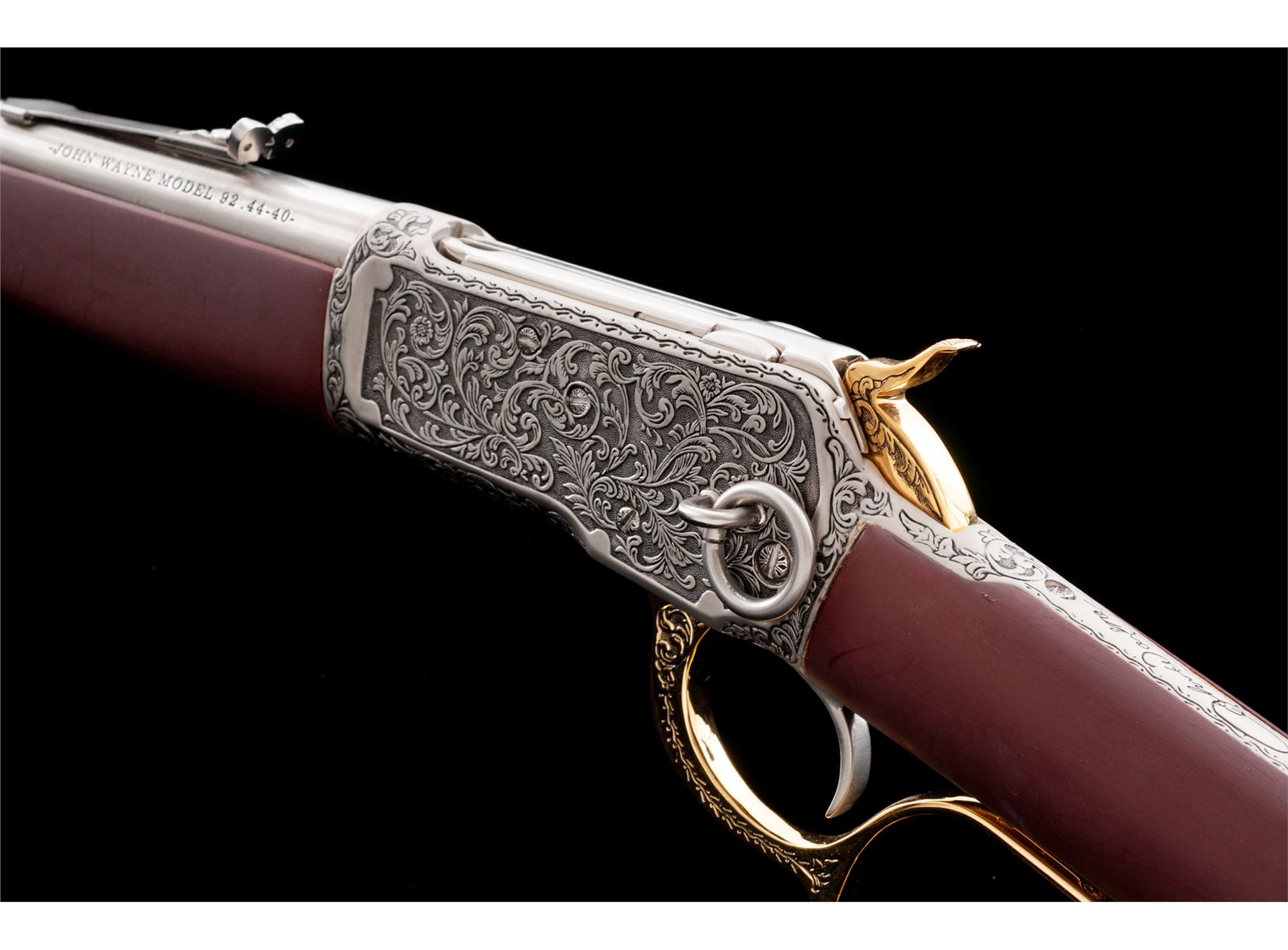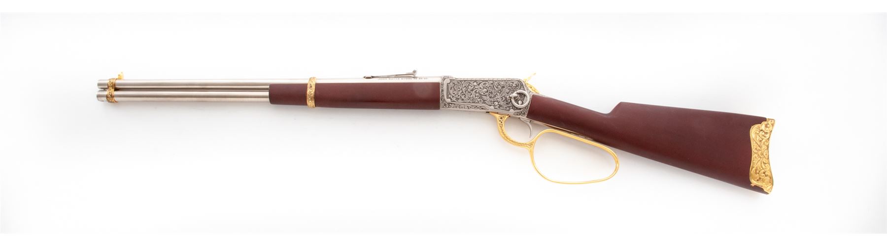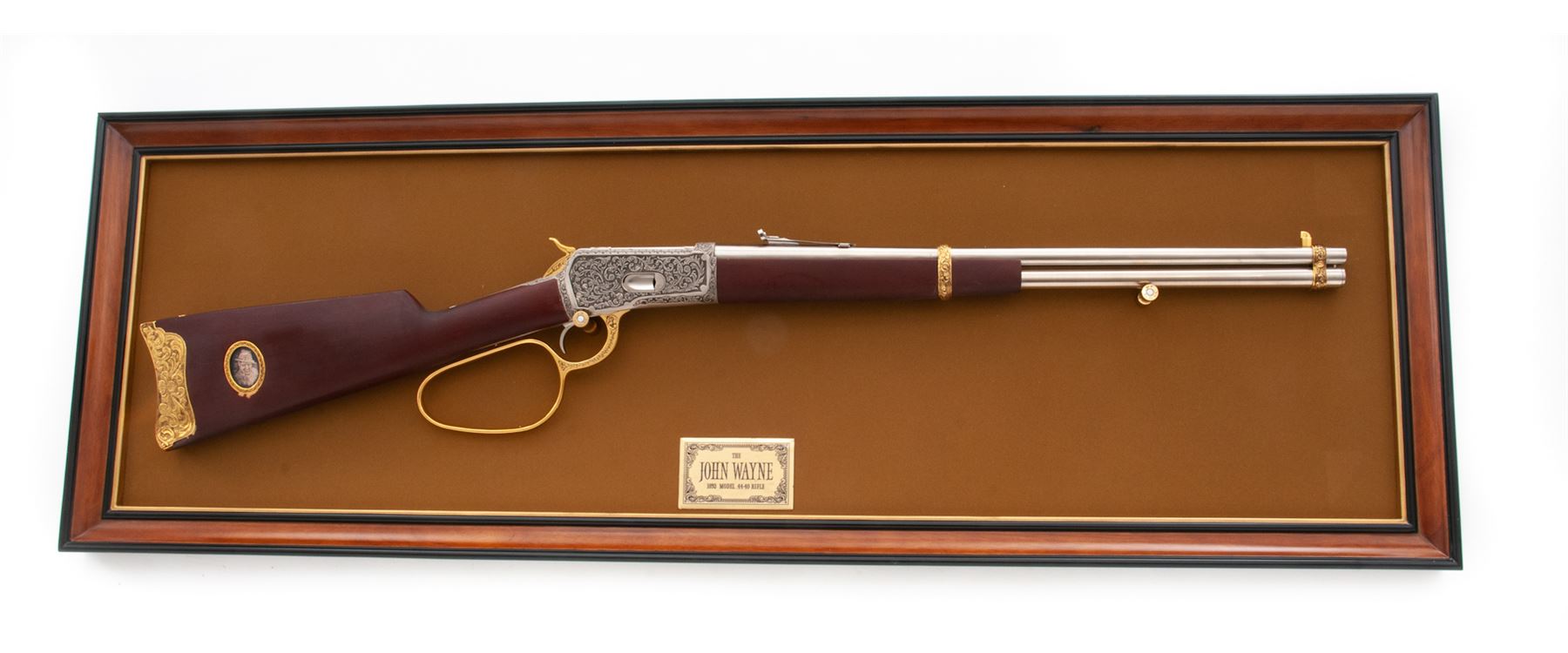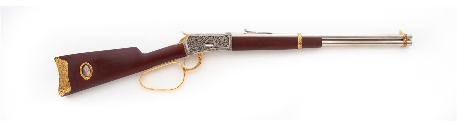 Non-Firing John Wayne Model 92 Western Commemorative Tribute Rifle, by The Franklin Mint, JW#987672, fancy engraved frame, gold embellishments, plastic stock, with large loop lever, and display board. In original box with paperwork. Metal surfaces are in excellent condition. Stock with minor scuffs from handling, small losses at buttplate, and chips around John Wayne emblem in buttstock. Est.: $400-$600. (No FFL Required)