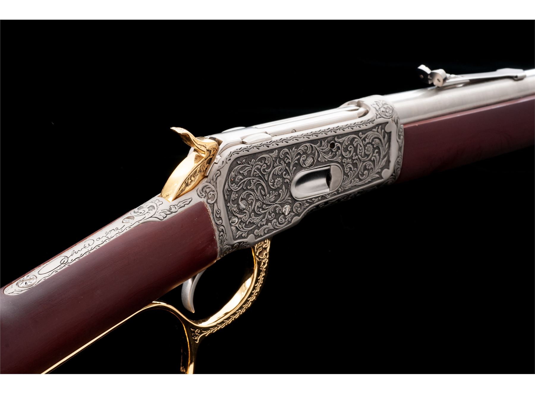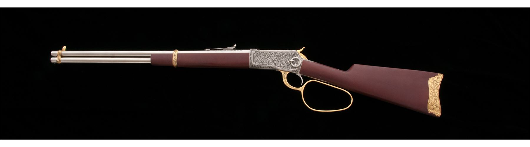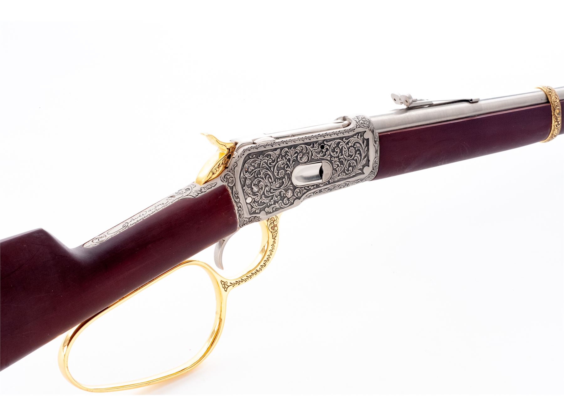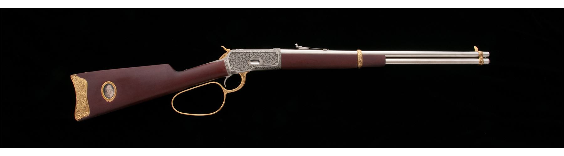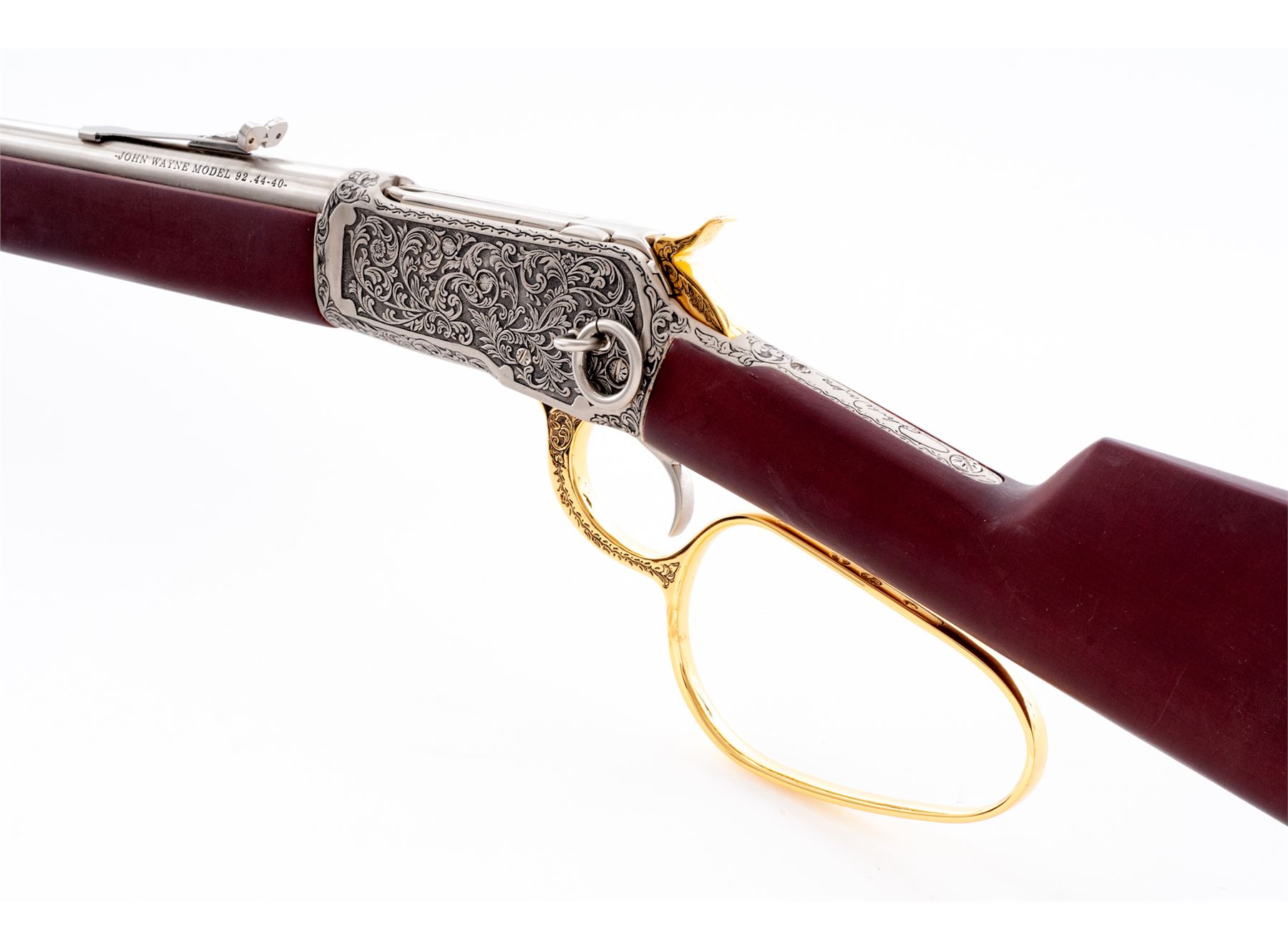 Non-Firing John Wayne Model 92 Western Commemorative Tribute Rifle, by The Franklin Mint, JW#987672, fancy engraved frame, gold embellishments, plastic stock, with large loop lever, and display board. In original box with paperwork. Metal surfaces are in excellent condition. Stock with minor scuffs from handling, small losses at buttplate, and chips around John Wayne emblem in buttstock. Est.: $400-$600. (No FFL Required)