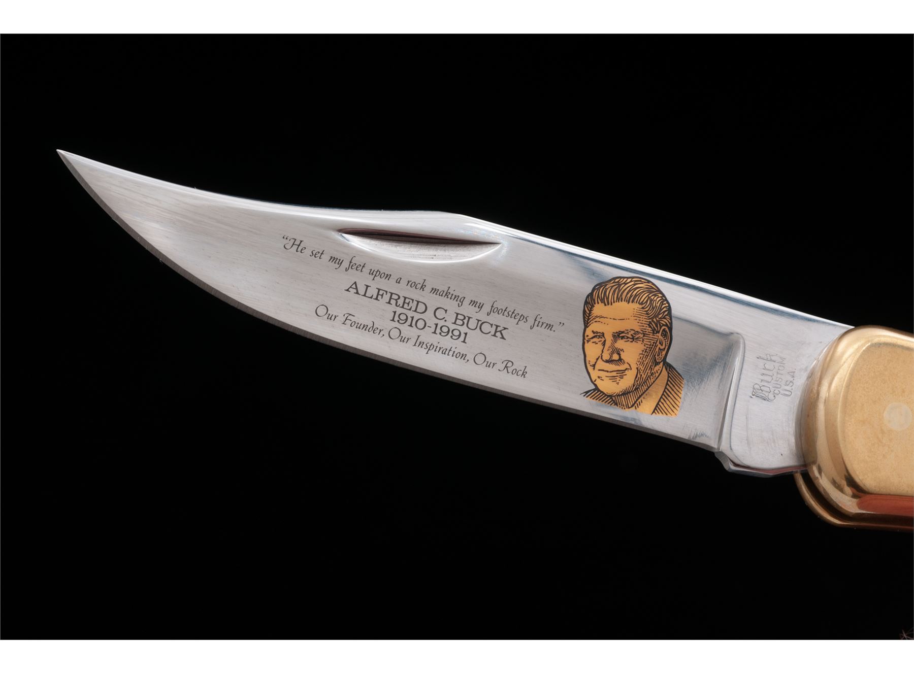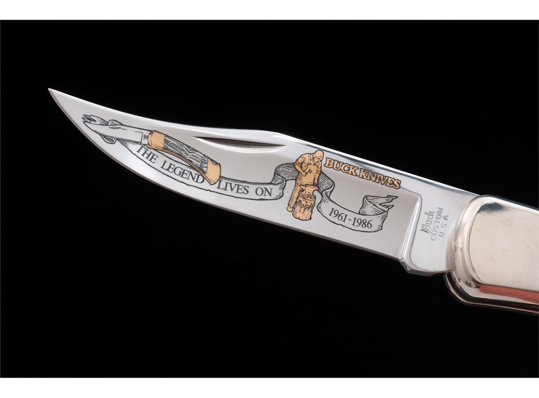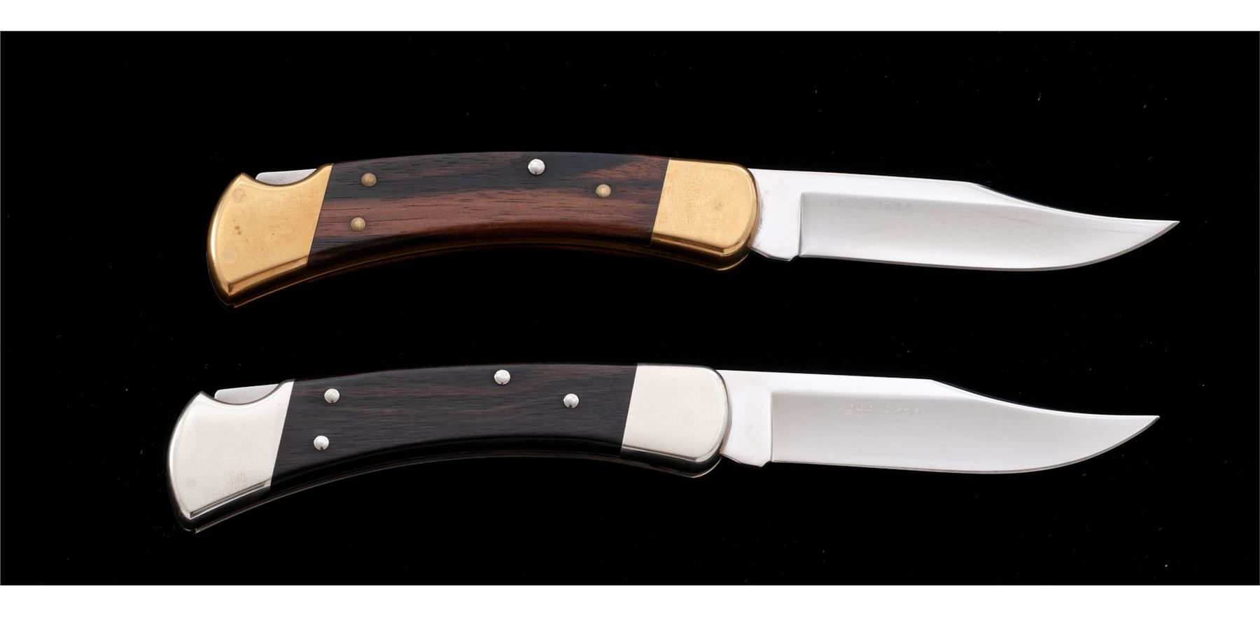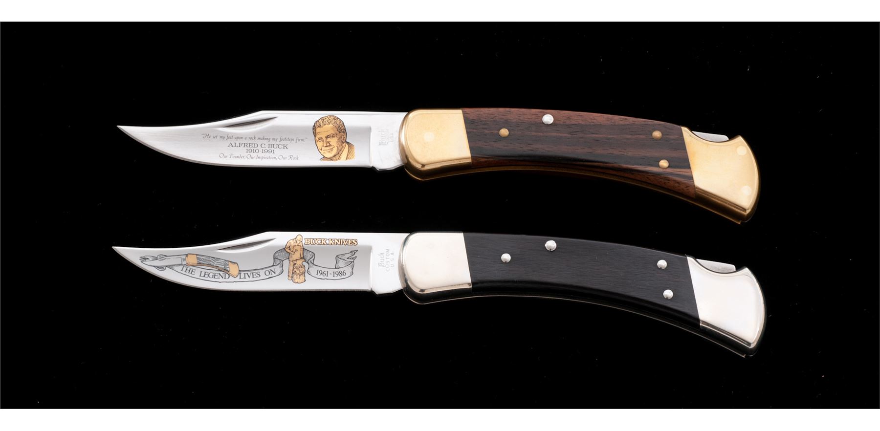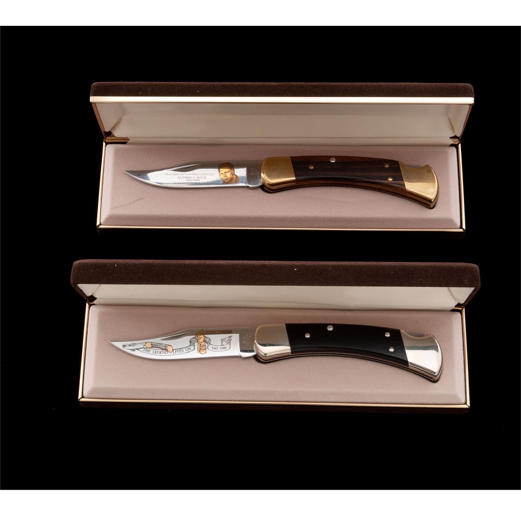 Lot of Two (2) Limited Edition Etched Blade Buck Model 110 Folding Knives: 1.) ''25th Anniversary'' Model 110, etched gold highlighted blade with an image of a 110 knife, blacksmith, and ''The Legend Lives On 1961-1986''. Backside of blade is numbered ''1988/2500''. Wood handles with nickel silver pins and bolsters. Included is a dark brown velvet clamshell case, COA, misc. factory paperwork, and plain cardboard sleeve; inside of lid with the same image that is on the blade. 2.) ''Al Buck Memorial'' Model 110, etched blade with gold image of Al Buck and memorial writing. Backside of blade is numbered ''0111/2500''. Wood handles with brass pins and bolsters. Included is a dark brown velvet clamshell case, COA, misc. factory paperwork, trial size Flitz cleaner, and plain cardboard sleeve. Both knives are in excellent as new condition, never carried or sharpened. Bolsters show mild toning. Est.: $200-$350/lot.