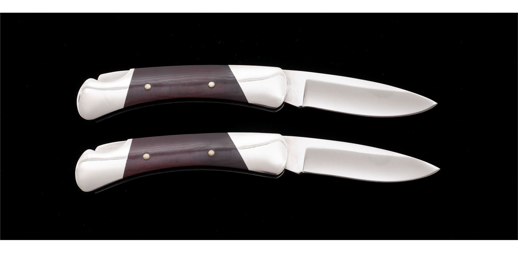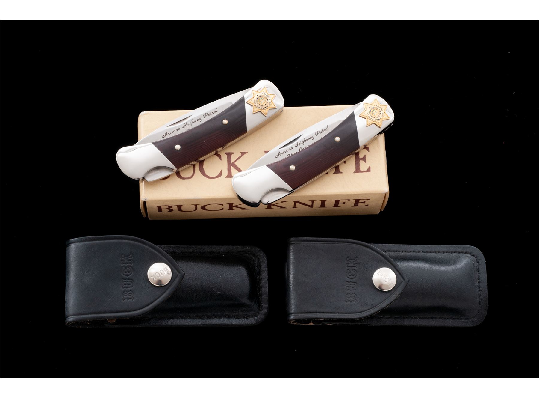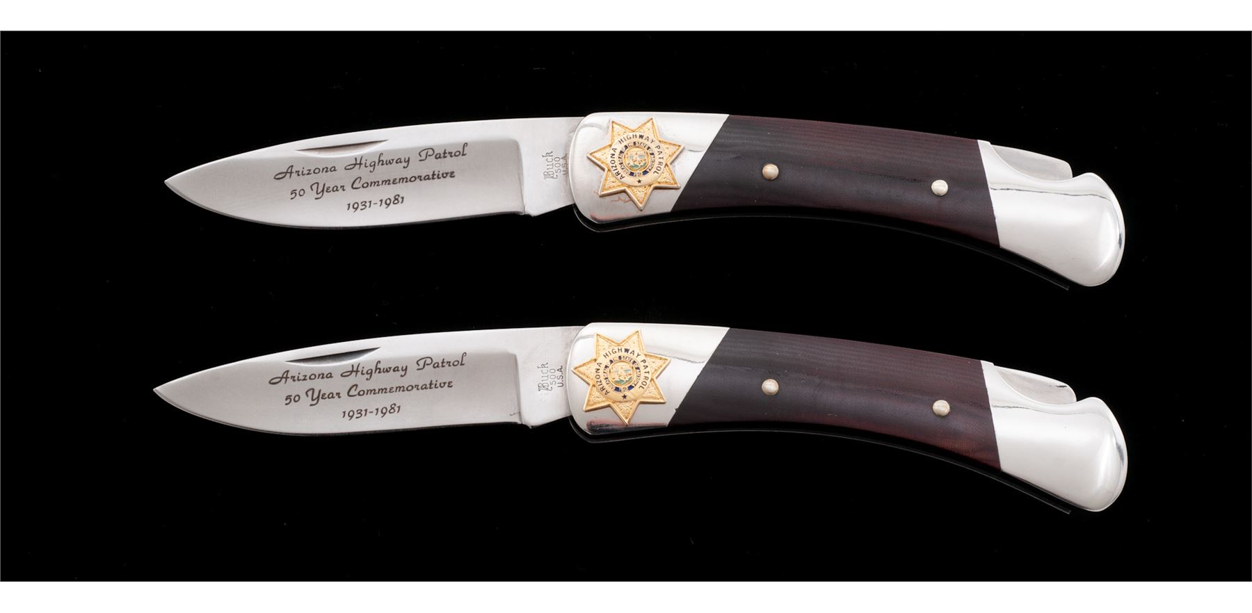 Lot of Two (2) Limited Edition Arizona Highway Patrol Commemorative Buck Model 500 ''Duke'' Lock-Back Folding Knives, blade is marked ''Arizona Highway Patrol/50 Year Commemorative/1931-1981'', maroon colored micarta grips, and features mirror polished bolsters, one with a decorative AZHP badge. Each knife comes with a black leather Buck sheath. Also included is one box with misc. factory paperwork. Both of the blades are in excellent as new condition, never carried or sharpened. Bolsters with some fine micro-scratching and small handling marks; one knife with a few more noticeable scratches. Est.: $200-$300/lot.