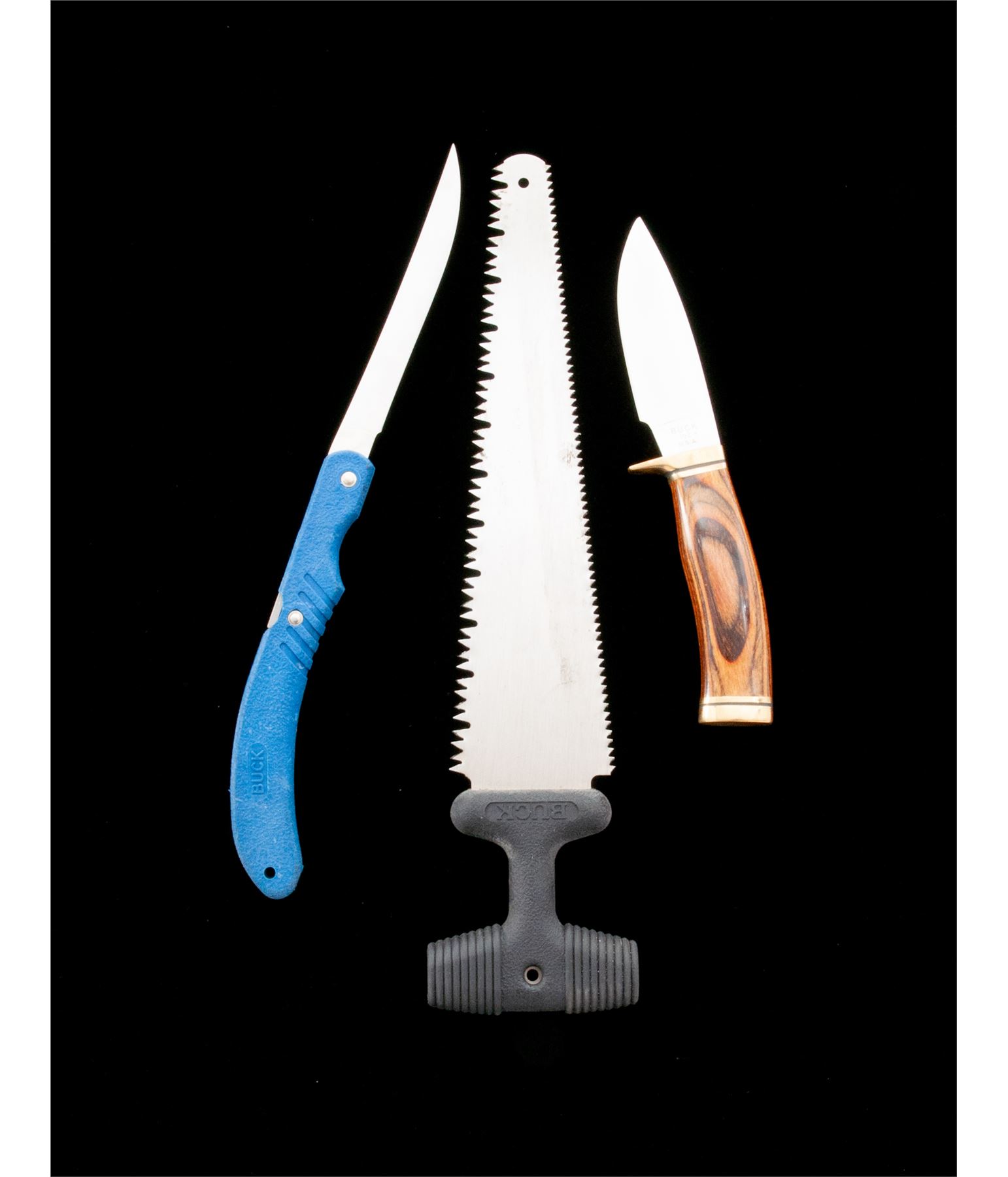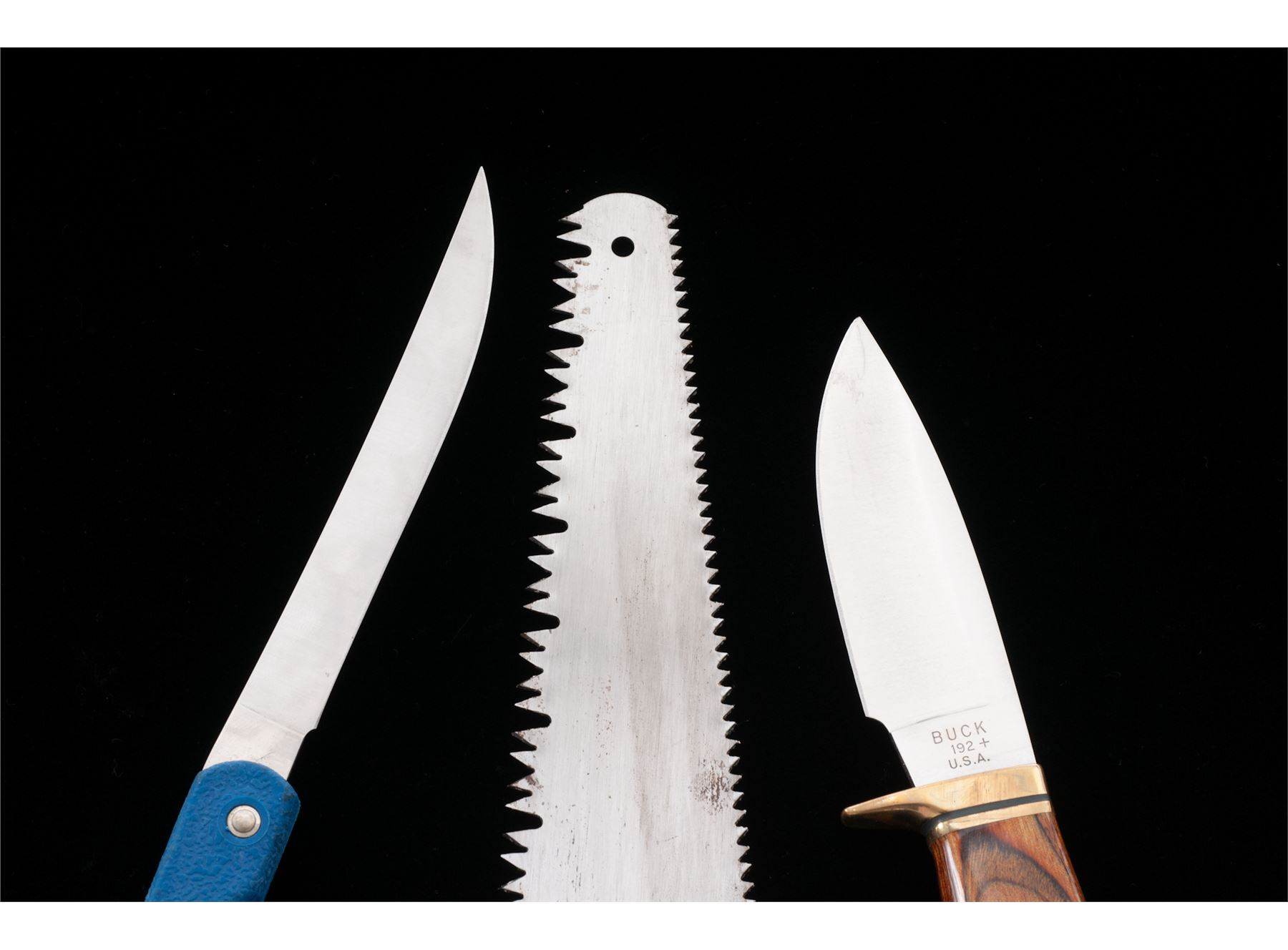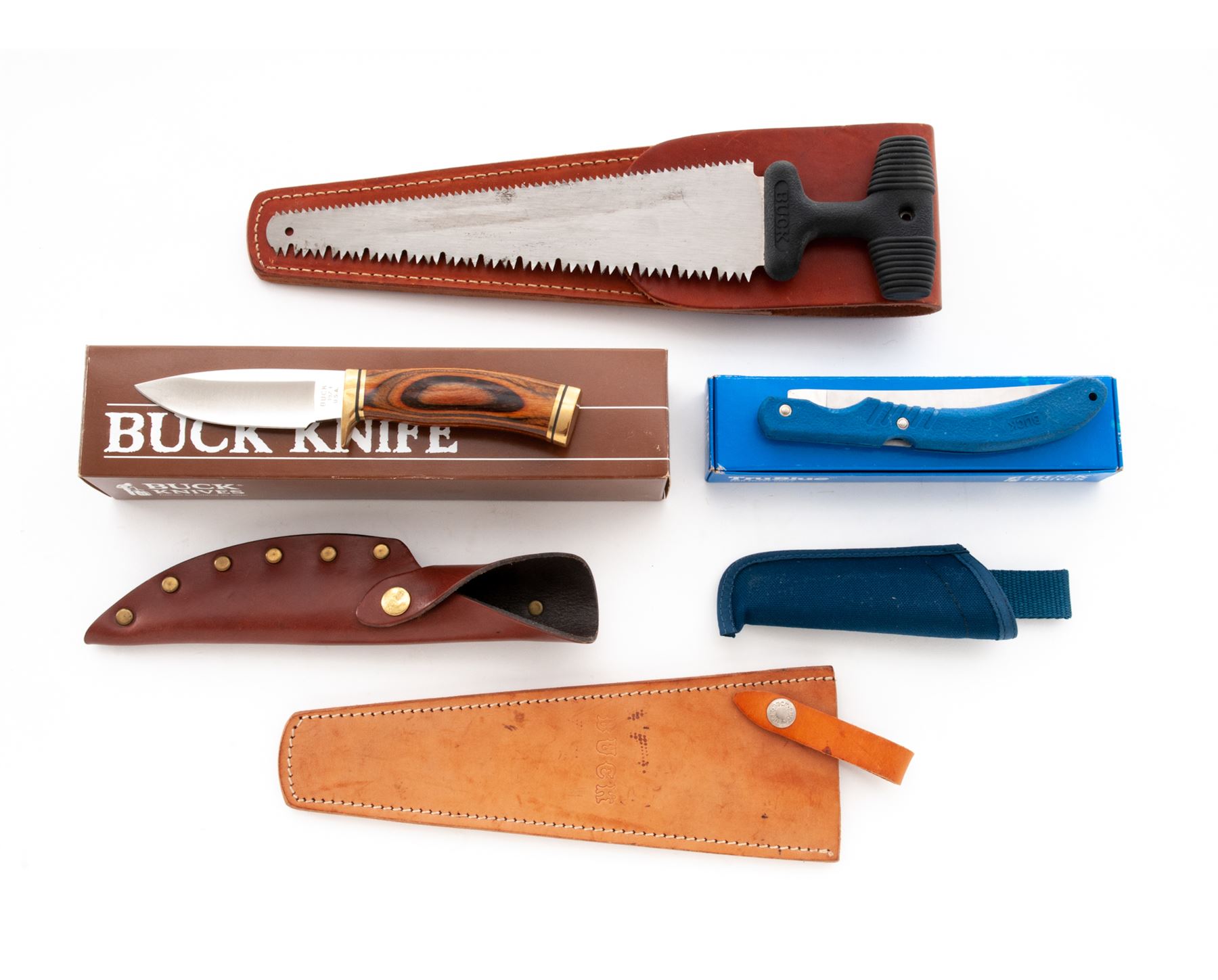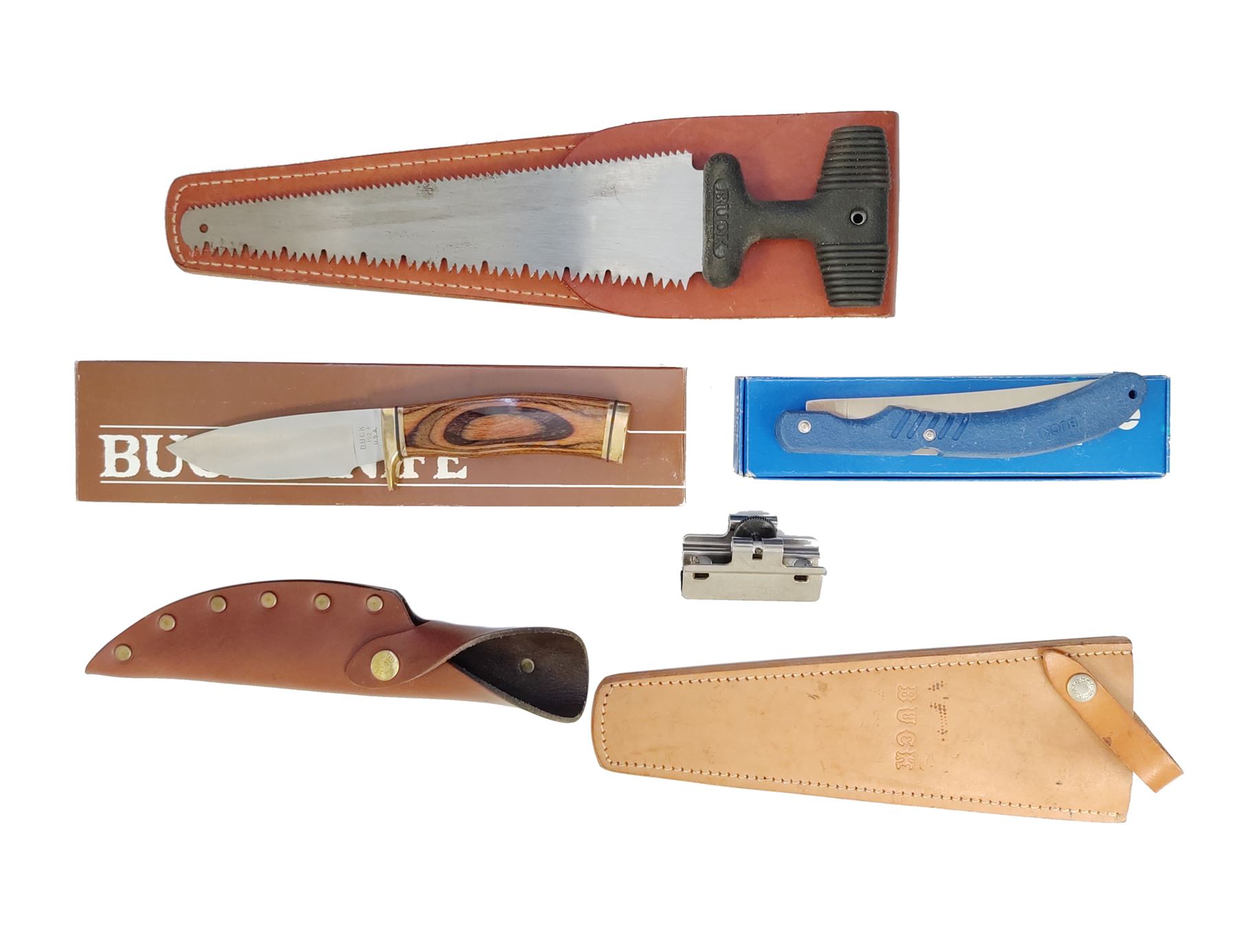 Lot of Six (6) Buck Knives & Related Items: 1.) Model 539 TruBlue Filet Knife, blue handle, with blue nylon sheath and box. Mfg'd 1989. Overall condition is excellent, never carried or sharpened. Hard rubber handle with a few light scuffs and handling marks. 2.) Model 192 Vanguard Fixed Blade Knife, 4'' blade, laminate wood handle, single brass hilt and brass pommel. In the original box with misc. factory paperwork. Mfg'd 1991. Overall condition is excellent appearing as new. 3.) Original brown leather Buck sheath for the fixed blade ''Akonua'' knife. Condition overall is excellent with a few slight rub marks. 4.) Model 154 Camp/Hunting Saw with brown leather sheath, 10-1/2'' blade, 14'' overall. Condition overall is very good. Teeth are sharp, flat sides of the blade with normal light scuffs and some small spots of dark spotting. A very good lightly used sheath. 5.) Tan leather sheath for Model 154 Camp/Hunting Saw. In very good used condition. 6.) Buck Honemaster sharpening tool. In very good used condition. Est.: $200-$300/lot.