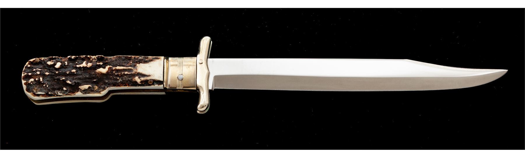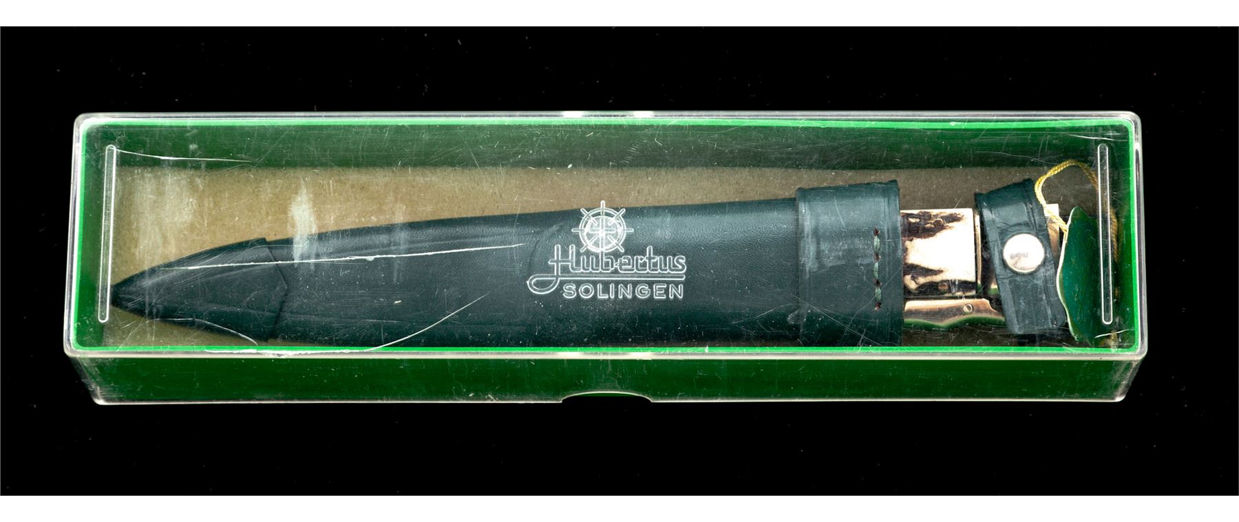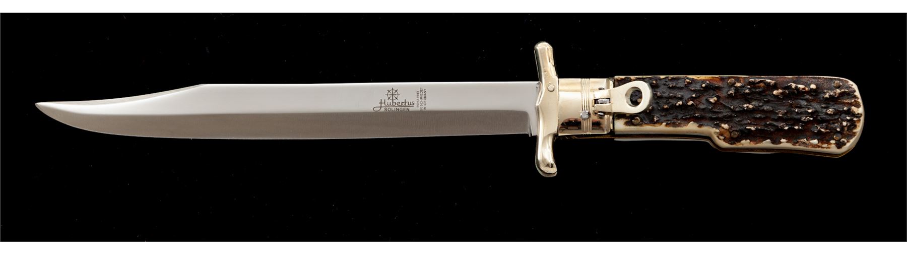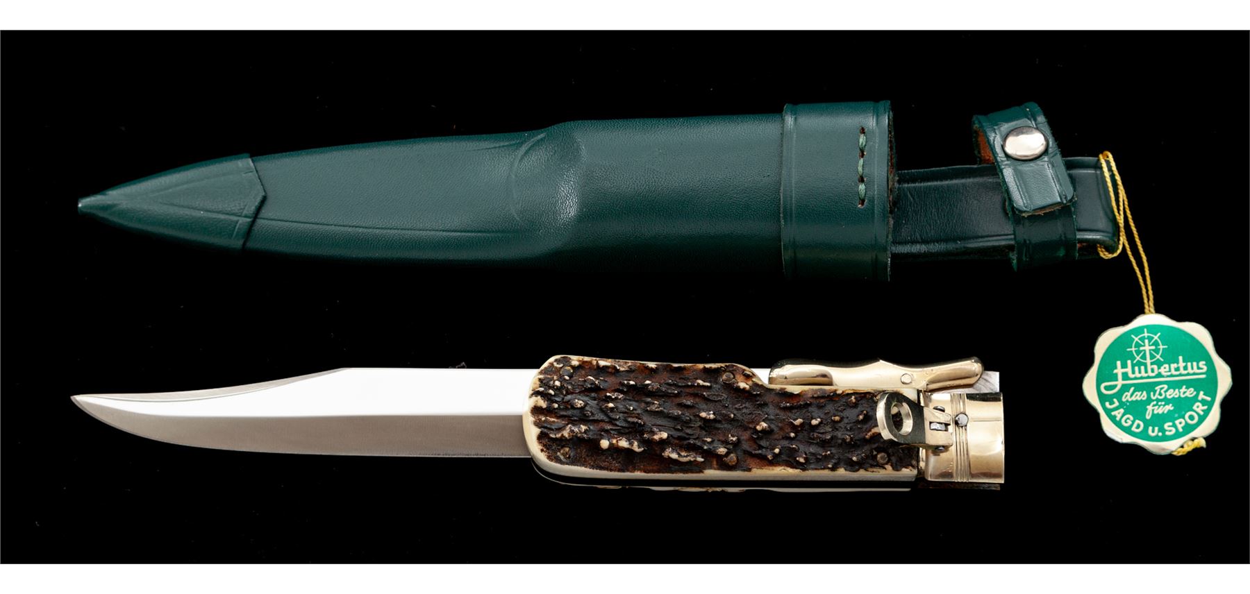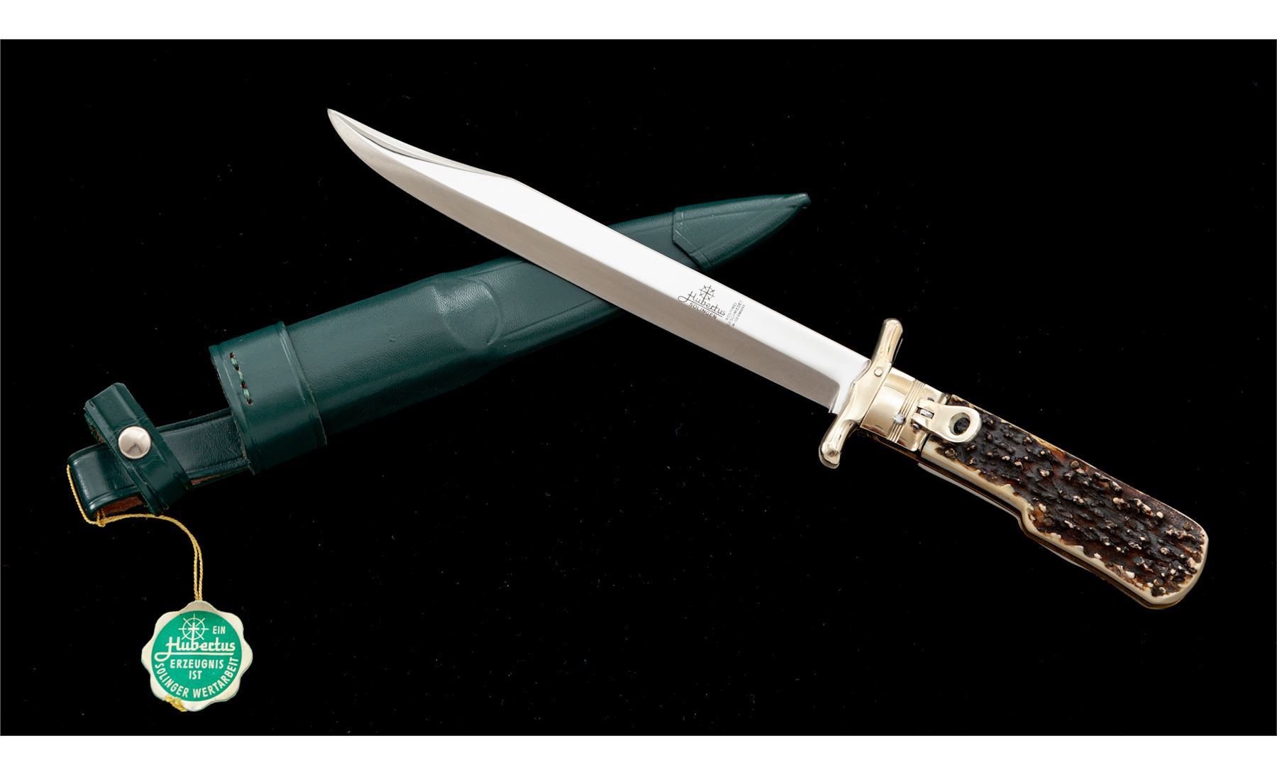 Hubertus ''Saufaenger'' Folding Bowie Knife, 7-1/2'' mirror polished blade, 8-5/8'' overall closed length, stag handles, nickel silver bolsters and locking lever, with green leather sheath; sheath with the original hang tag. In two-piece plastic Hubertus box. Made in West Germany. Condition overall is excellent appearing as new, never carried or sharpened, blade with a few minor handling marks. Est.: $200-$300.