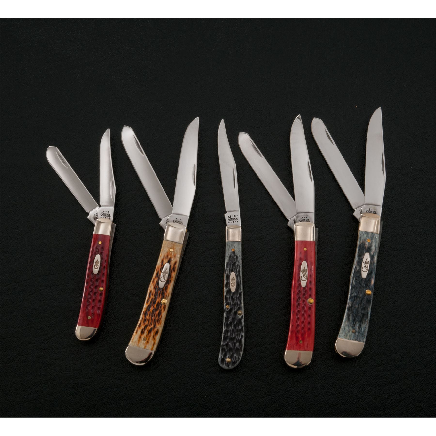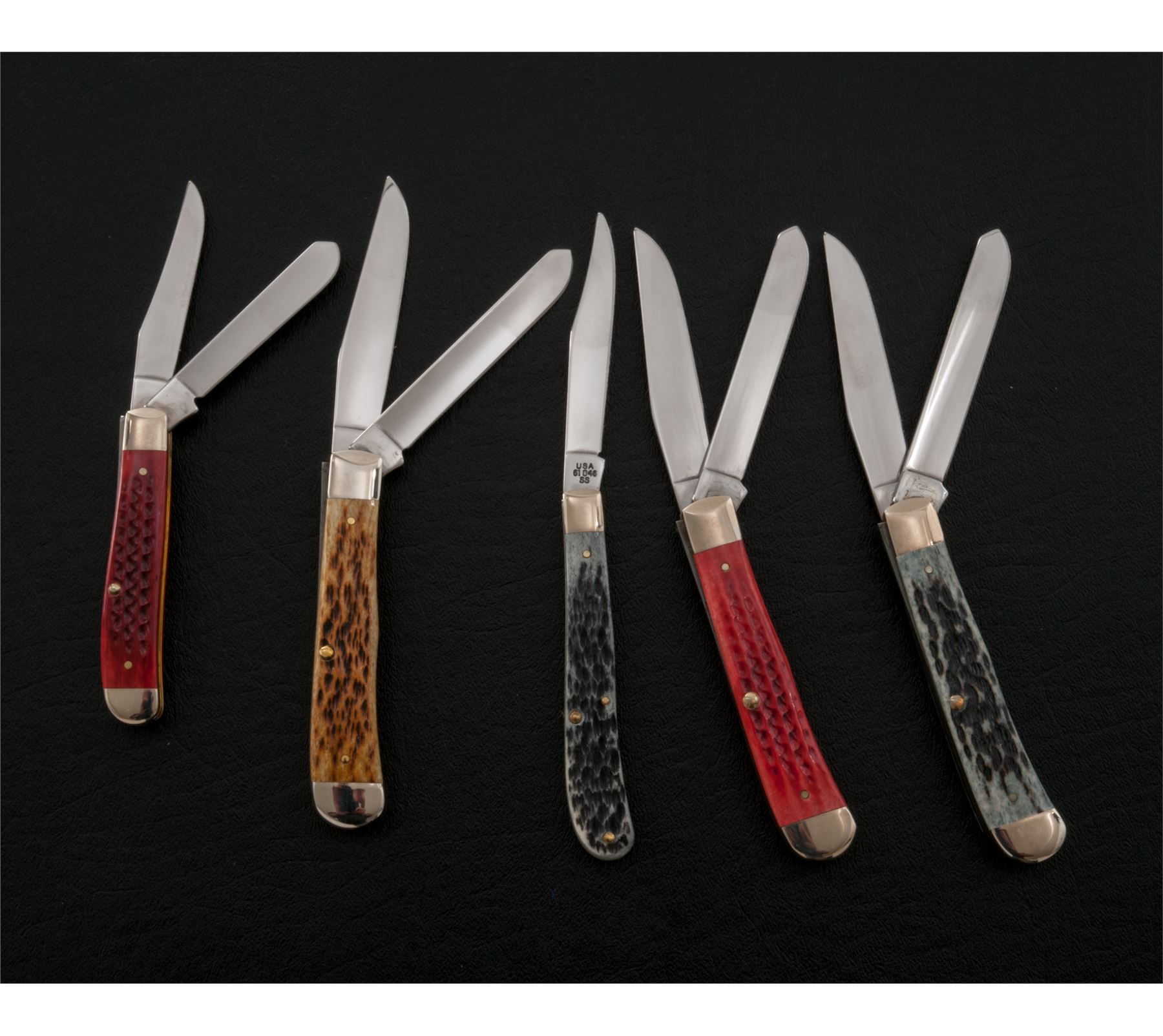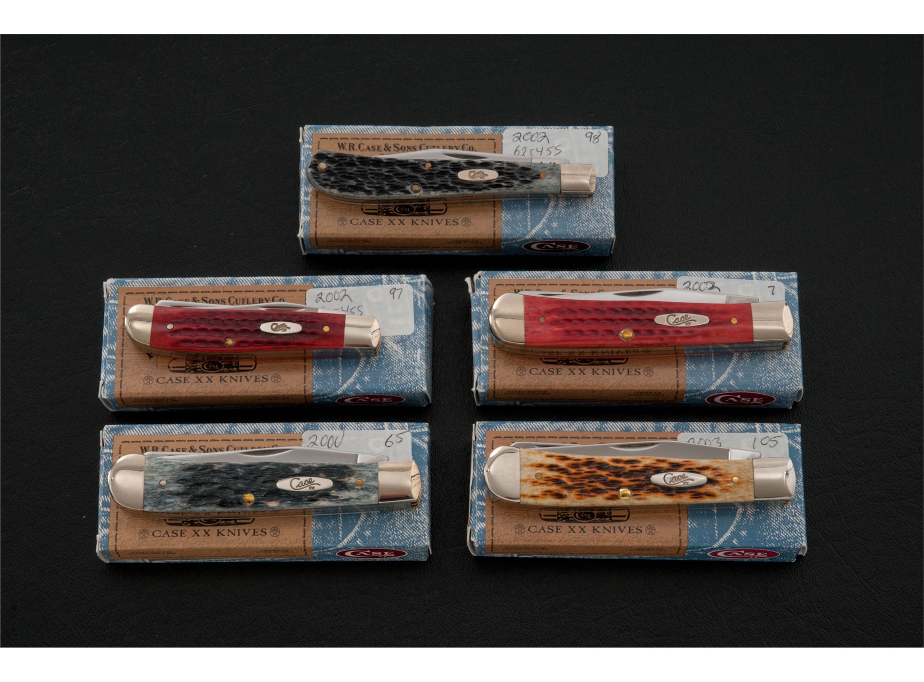 Lot of Five (5) New-in-the-Box Case ''Pocket Worn'' Series ''Trapper'' Folding Knives, including the following models and handle material: Model #6207 SS, ''Old Red'' bone; #61048 SS, black bone; #6254 SS, ''Old Red'' bone; #6254 SS, black bone; #6254 SS, antique bone. Each knife comes in its original box with folding pamphlet and brown tissue paper. Mfg'd ca. 2000-2003. All are in excellent as new condition, never carried or sharpened. Est.: $150-$250/lot.