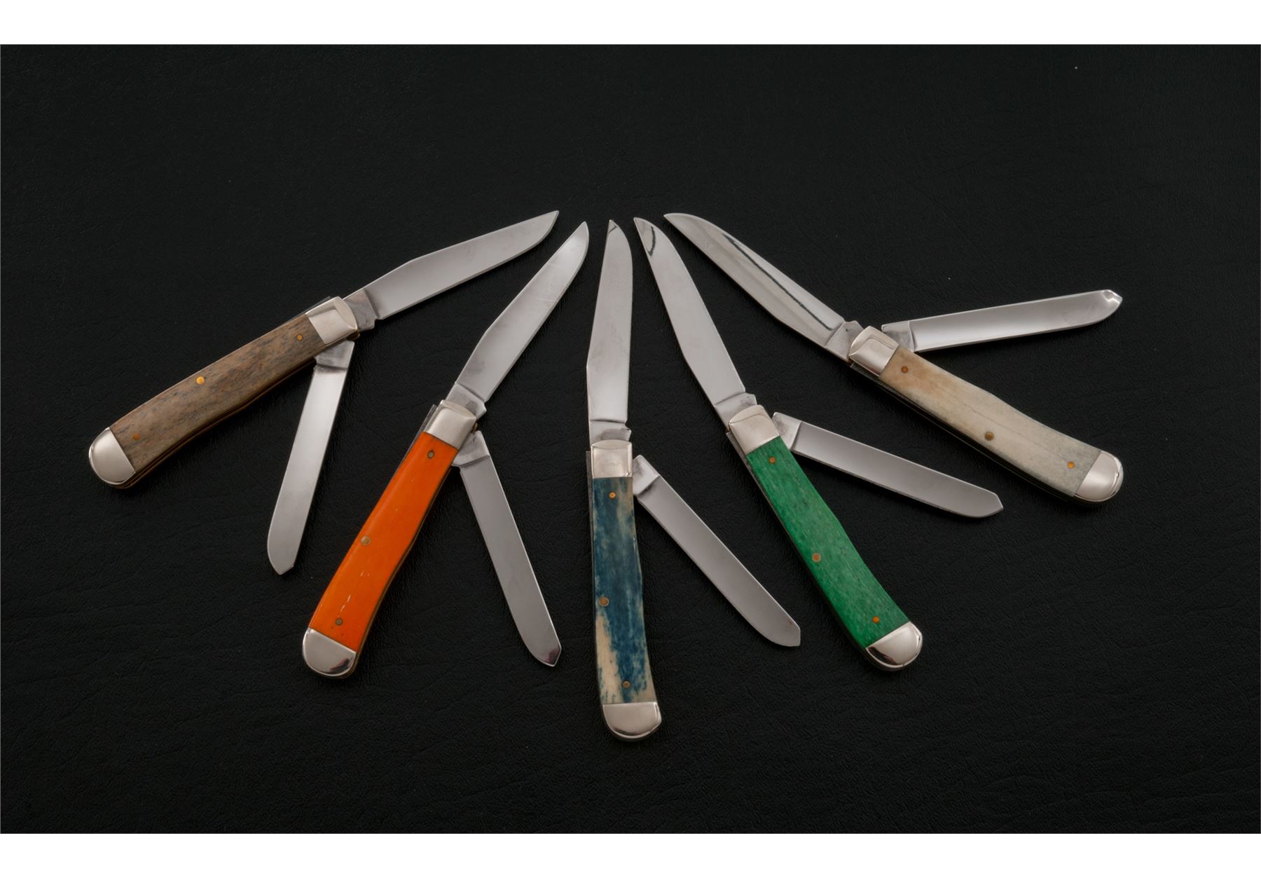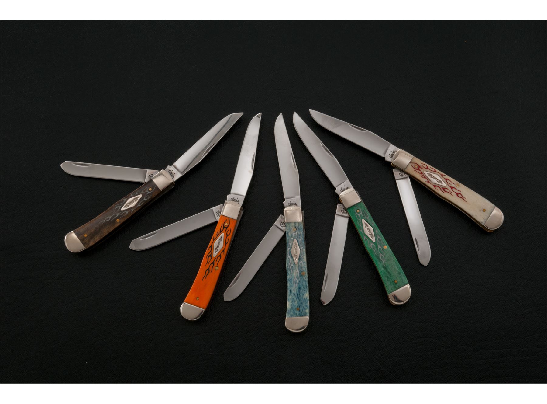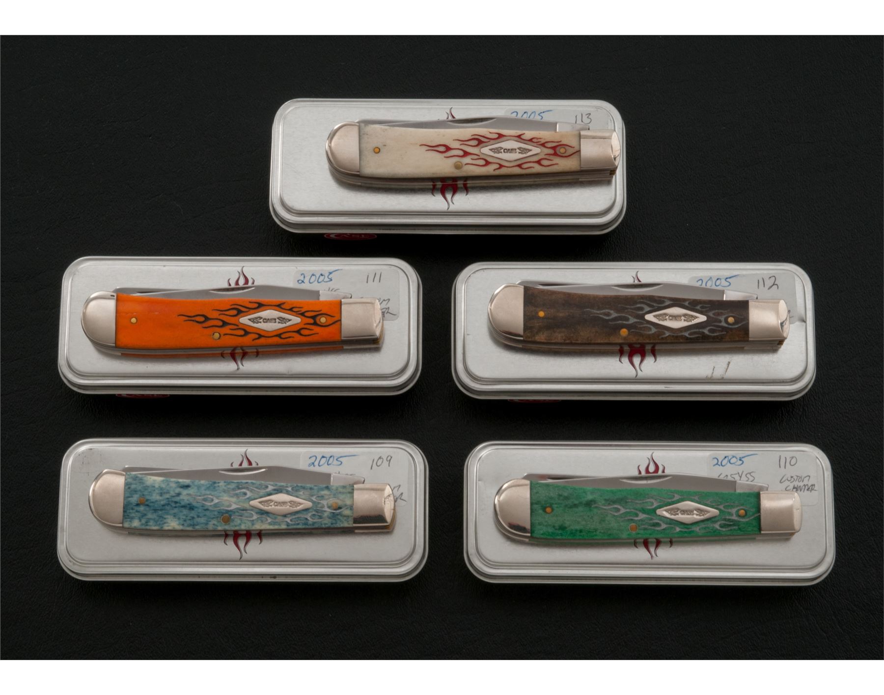 Lot of Five (5) New-in-the-Box Case Custom Chopper Series ''Trapper'' Folding Knives, including the following models and handle material: Model #6254 SS, blue bone; #6254 SS, bur green bone; #6254 SS, orange bone; #6254 SS, ''New'' black bone; #6254 SS, natural bone. All of the knives with laser engraved flames around a silver Case shield inlaid into one of the grips. Each knife comes in its original metal tin with Case ''Custom Chopper'' logo, fitted insert, and folding pamphlet. Mfg'd in 2005. All are in near excellent to excellent condition, with some slight scratching to some of the bolsters; blades are as new, never used or sharpened. Est.: $125-$250/lot.