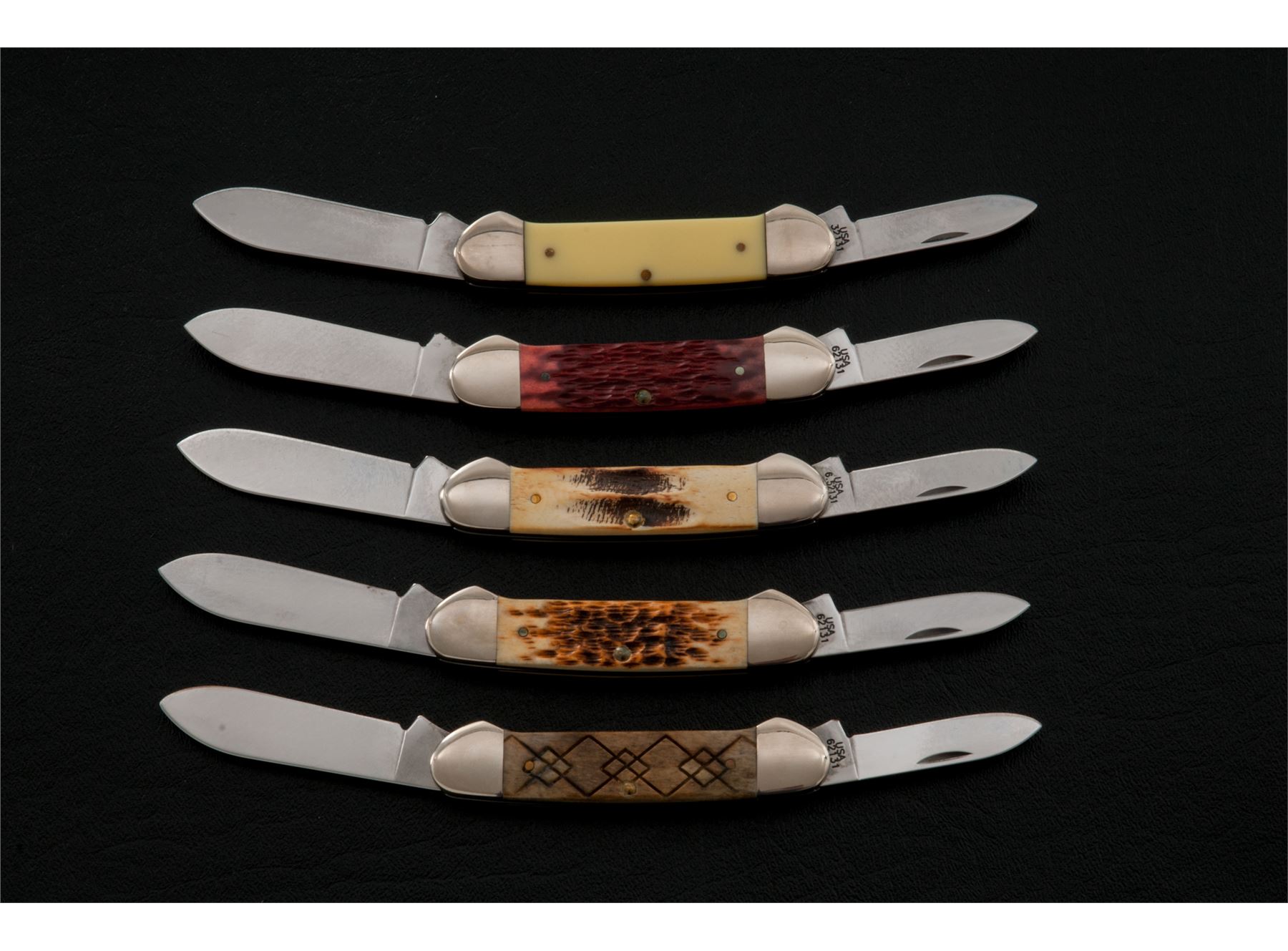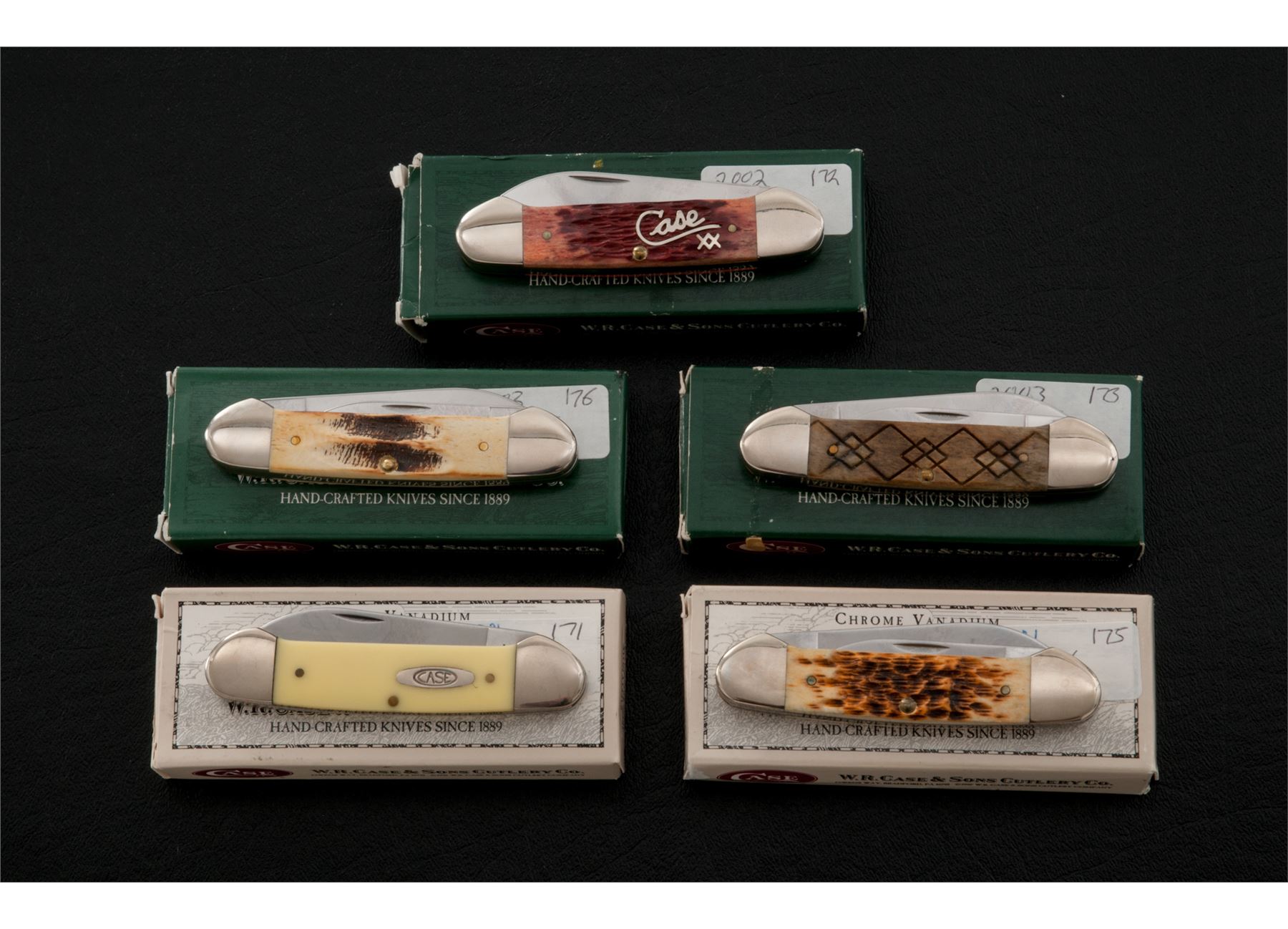 Lot of Five (5) New-in-the-Box Case ''Canoe'' Folding Knives, including the following models and handle material: Model #32131 CV, Chrome Vanadium Series, yellow composite handle; #62131 SS, cranberry bone; #62131 SS, black bone; #62131 CV, amber bone, with etched ''Indian in canoe'' blade; #6.52131 SS, bonestag. Each knife comes in its original box with folding pamphlet and brown tissue paper. Mfg'd ca. 2001-2003. All are in excellent as new condition, never carried or sharpened. Est.: $200-$300/lot.