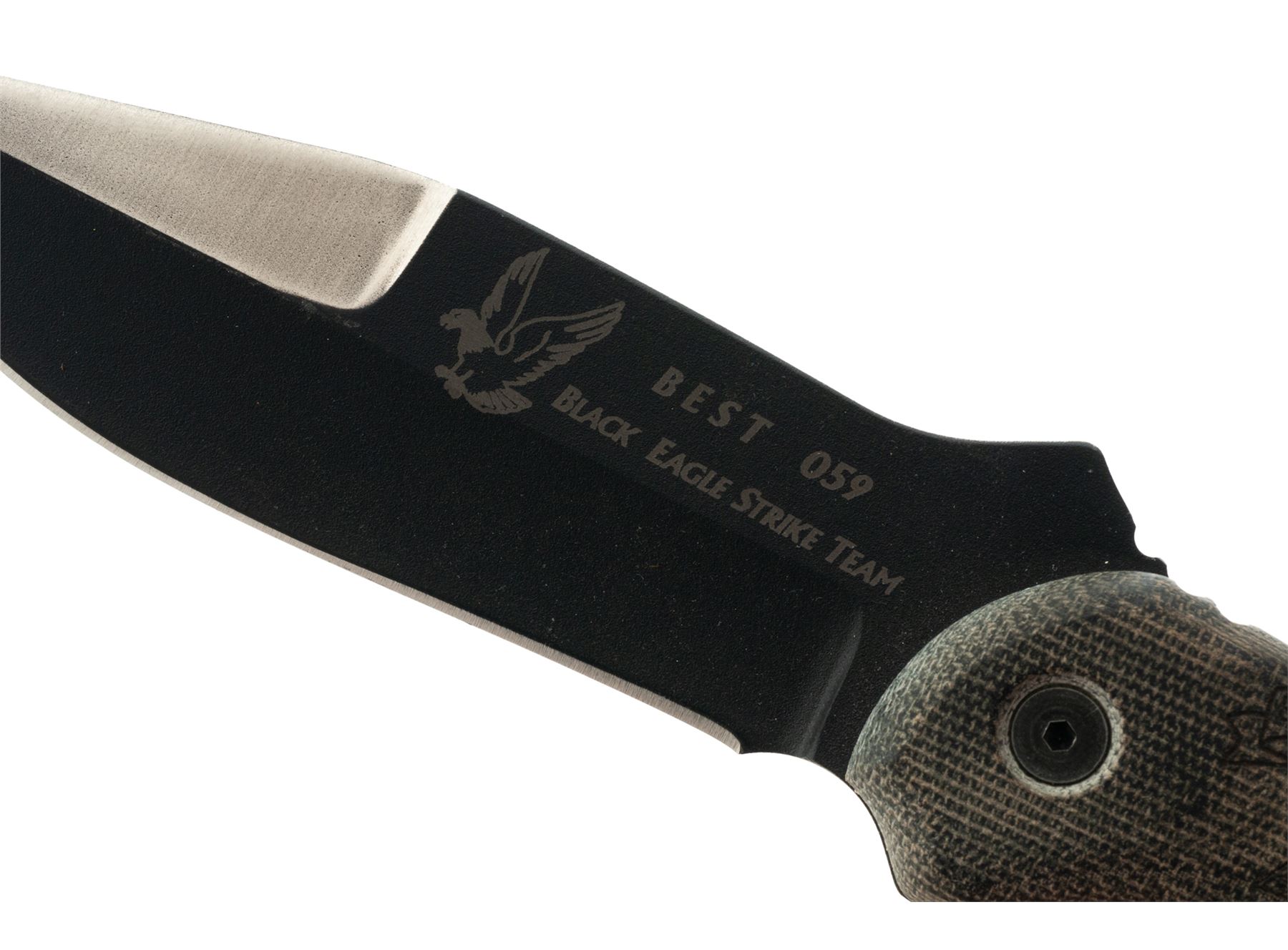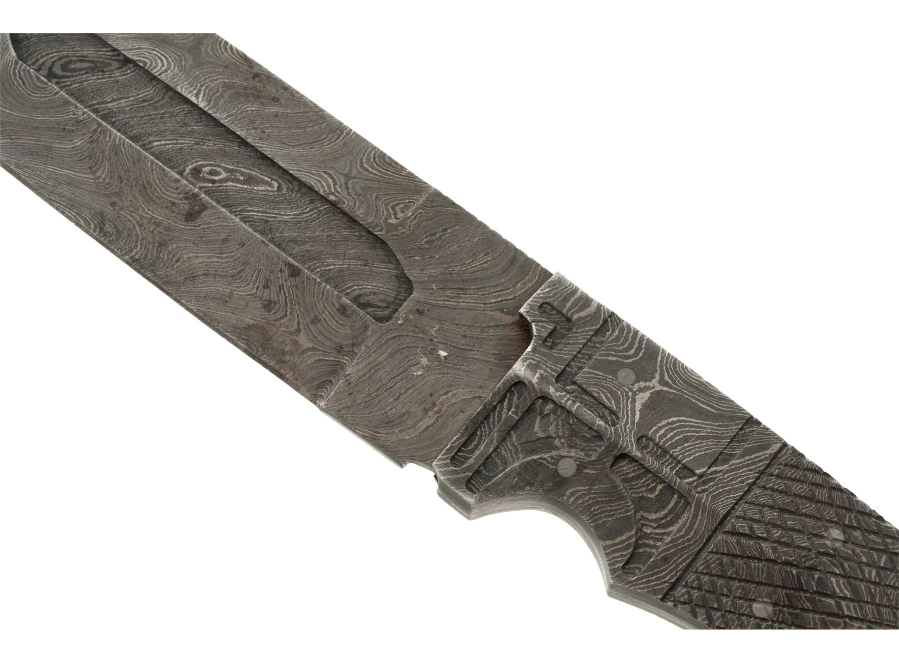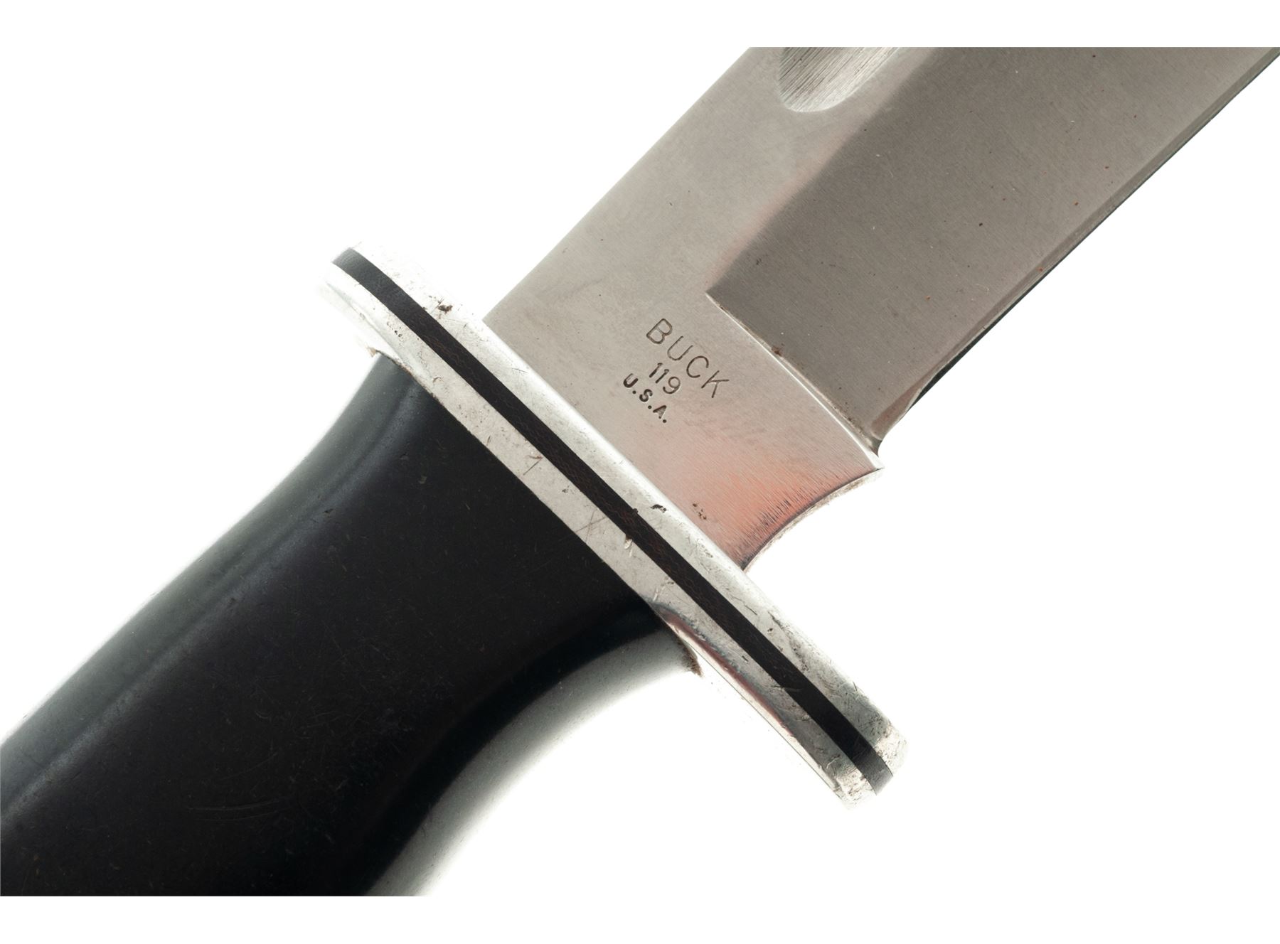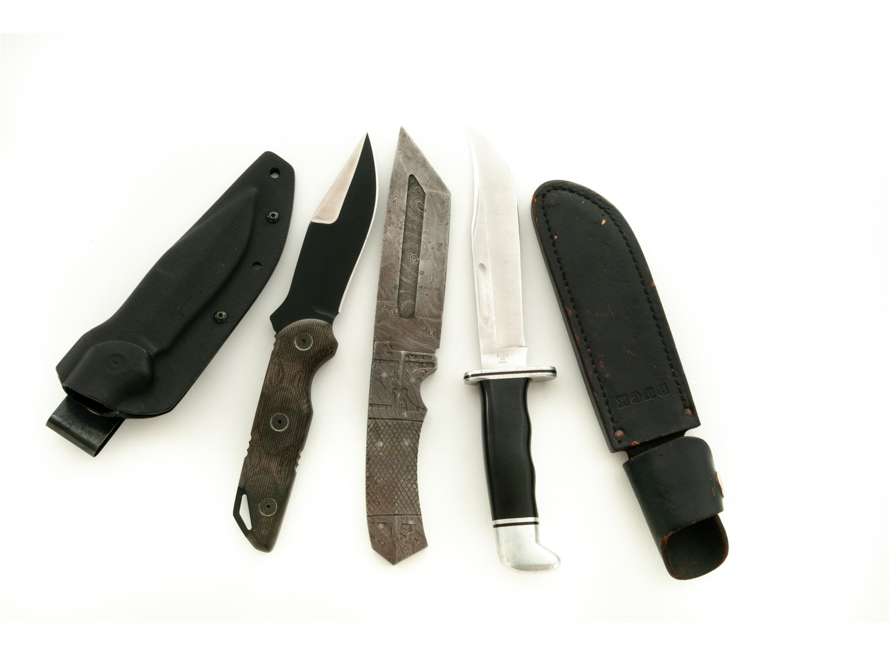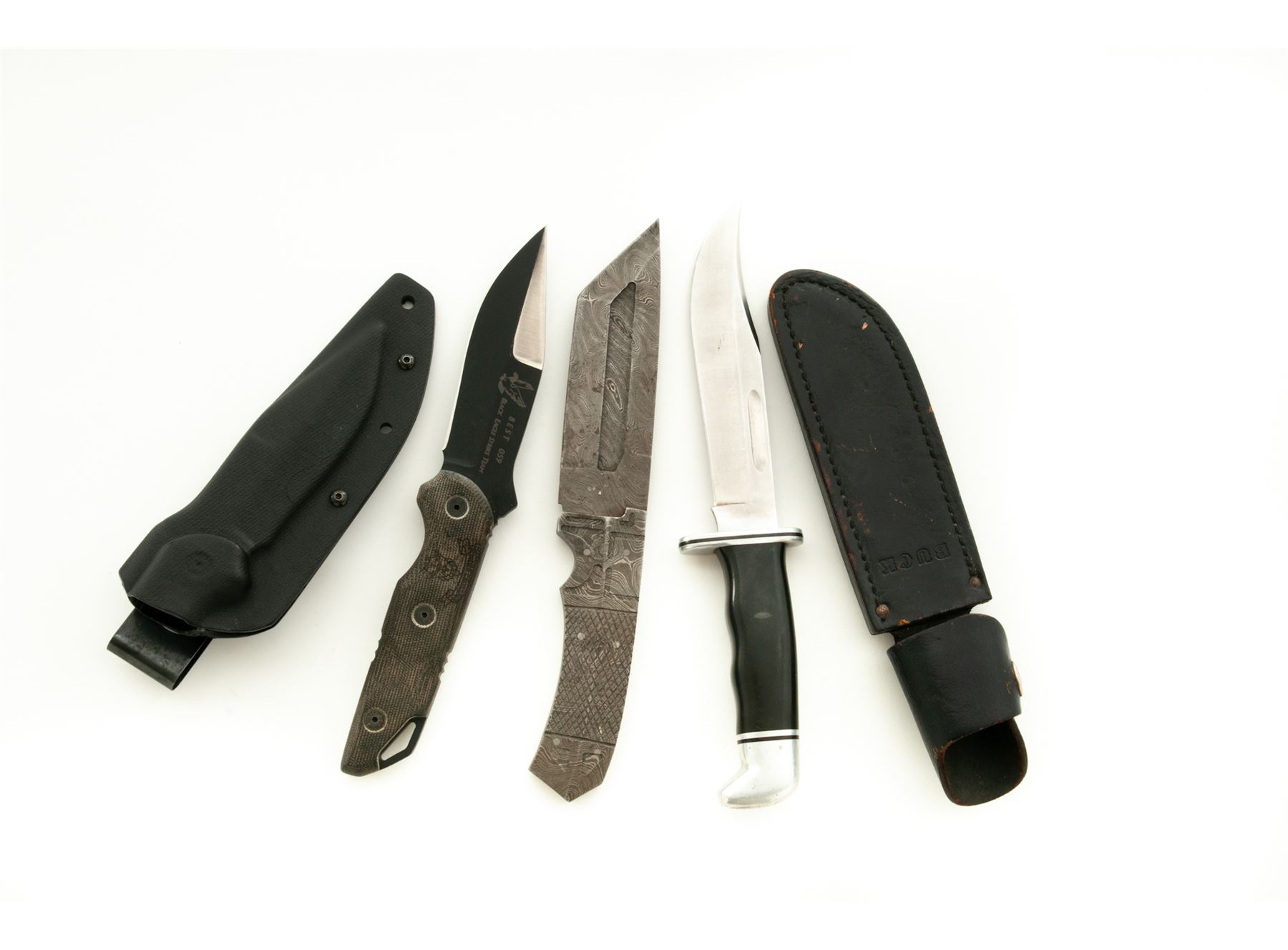 Lot of Three (3) Fixed Blades Knives by TOPS, Buck, and Unknown Maker: 1.) TOPS B.E.S.T. (Black Eagle Strike Team) Border Crossing Fixed Blade Knife, 4.5'' blade with black finish, 9-7/8'' overall, black canvas micarta handles with ''TOPS Border Crossing'' logo. Included is a black Kydex sheath with belt clip. Knife is in excellent as new condition. Sheath with a few scratches to the exterior. 2.) Buck #119 Special Model Fixed Blade Knife, 6'' blade with 3-line Buck stamp, 10.5'' overall, with black leather Model 119 sheath. In good used condition the blade and handle with general light scratching and handling marks; cutting edge appears factory. Sheath shows age and wear consistent with the knife including scuffs and scratches, stitching is excellent. 3.) Unmarked All Damascus Steel Knife, 5-1/8'' tanto blade, 10'' overall, checkered Damascus steel handles. Condition is good. Blade appears unused but does have some spots of light surface must. A thorough cleaning should improve the overall condition. Est.: $200-$300/lot.