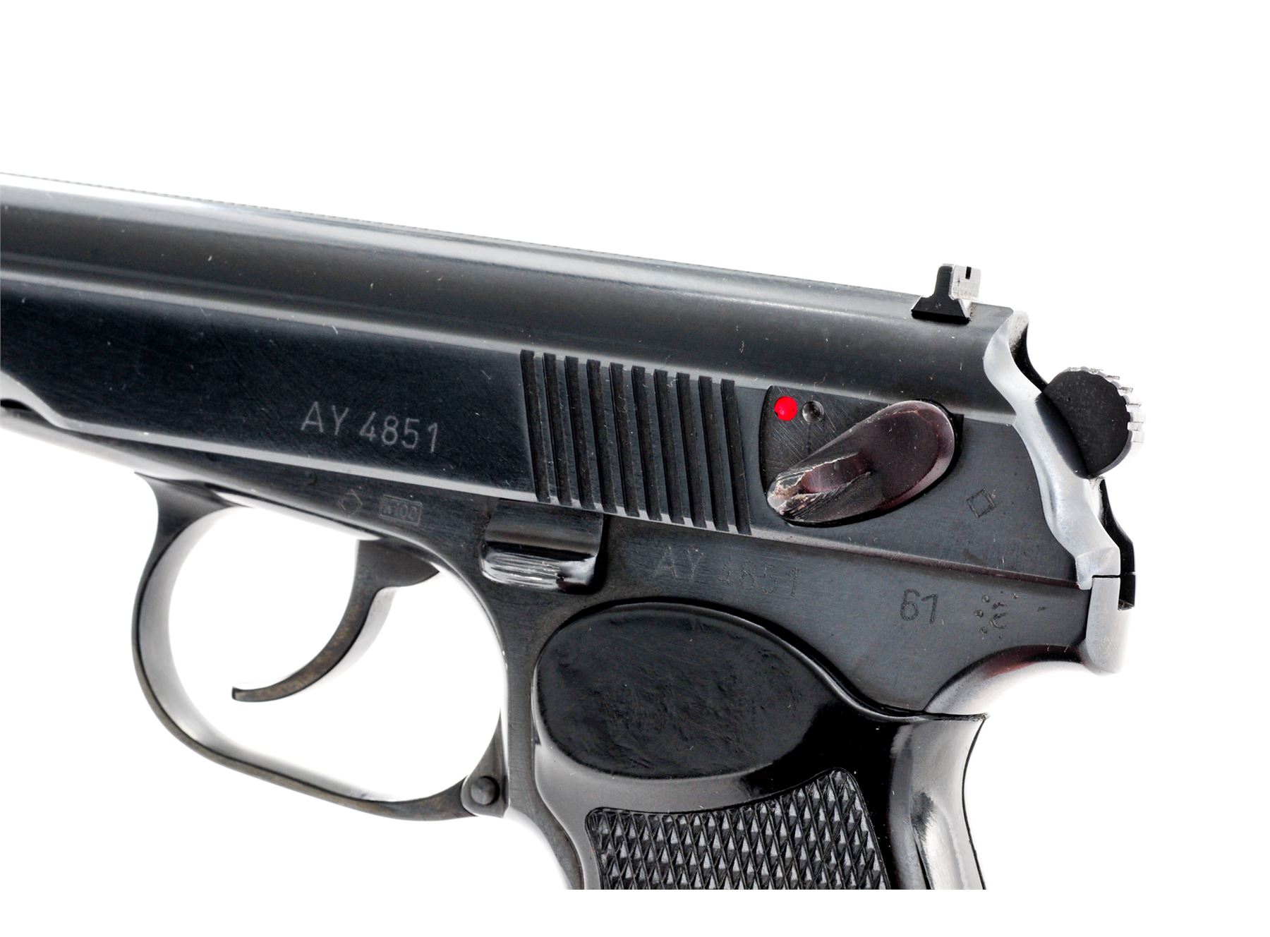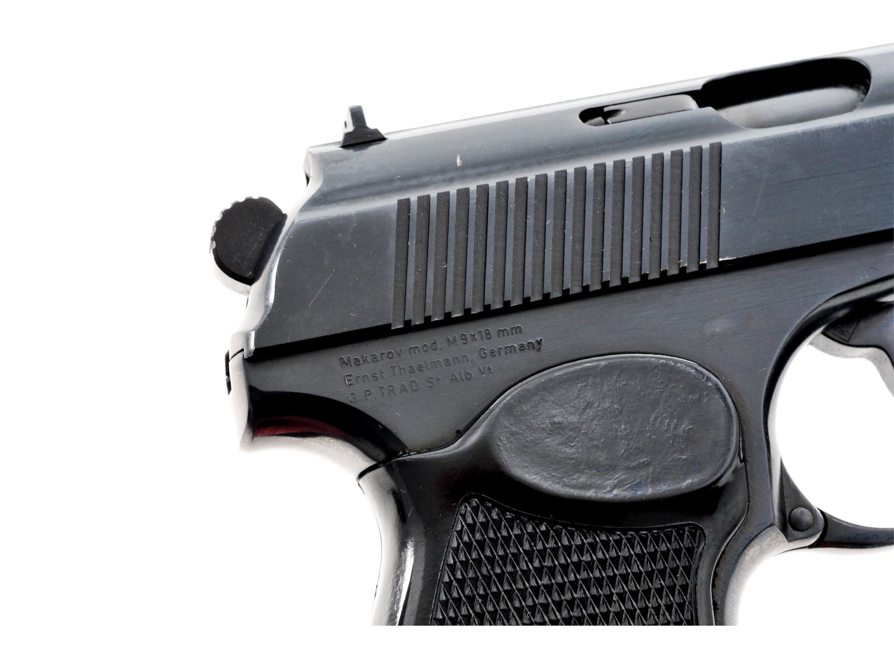 East German Makarov Semi-Automatic Pistol, by Ernst-Thalmann, #AY4851, 9mm Makarov cal., 3.75'' barrel, dark blue finish, black checkered plastic grips, standard fixed sights, with one magazine. Mfg. date is 1961. Frame and slide with visible matching numbers. Right side of frame is import marked; left side of frame with ''K100'' and ''(dotted circle)/a''. Metal surfaces retain approx. 98% blue finish and are in fine condition; slide with general fine micro-scratching to the flat sides. Grips are excellent with sharp checkering. All factory stamps are clear. Tight action, excellent bore. Est.: $300-$450. (C&R)