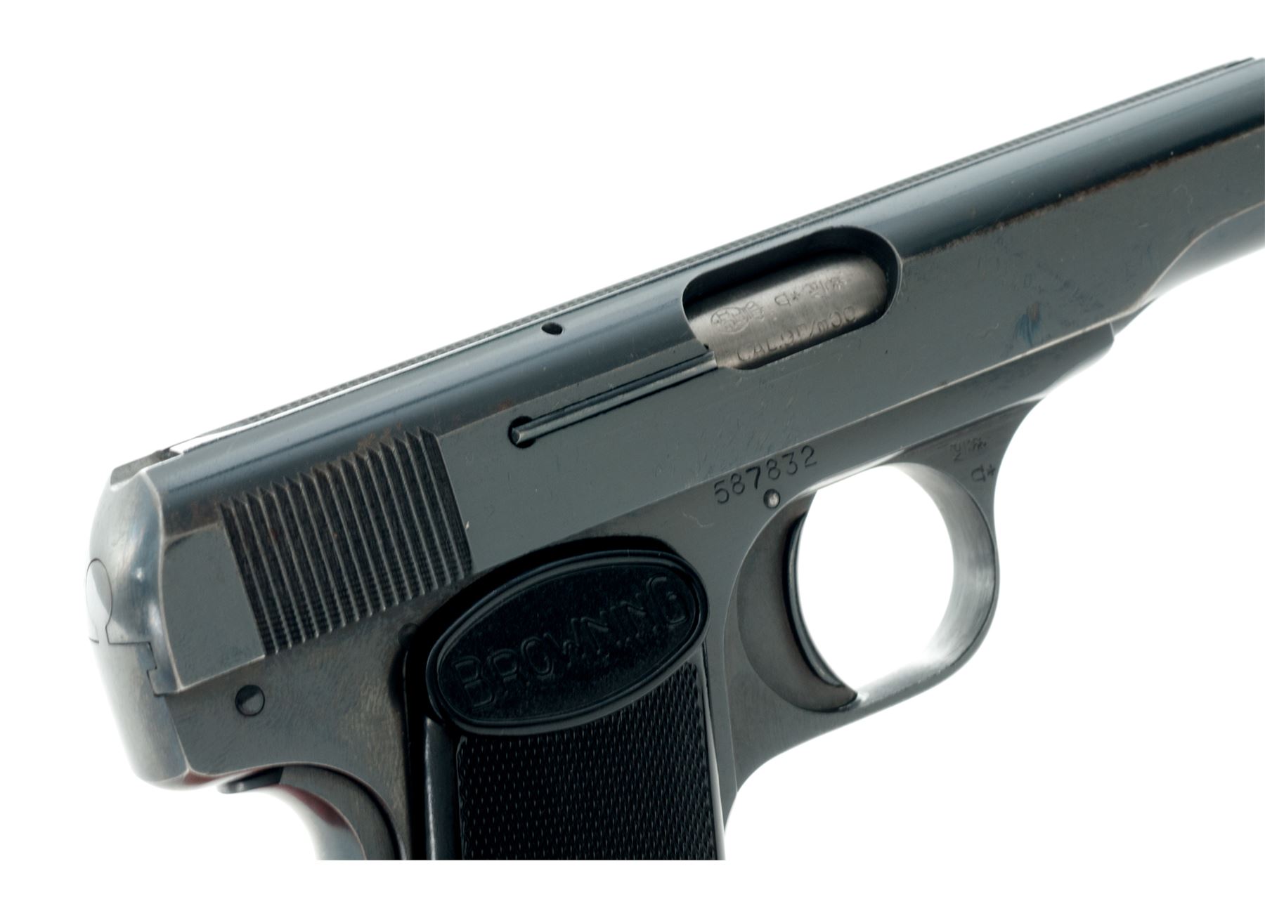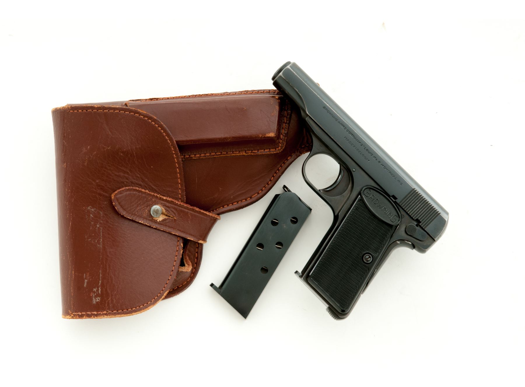 Browning Model 1910 Semi-Automatic Pistol, #587832, .380 cal., 3.5'' barrel, blue finish factory checkered black plastic grips, with two (2) factory magazines, in post-war East German brown leather flap holster. Mfg'd late '50s to 1960s. Condition is near excellent retaining approx. 97% thinning blue to high edges of slide. Grips are excellent, bore is bright. Both magazines appear as new. Holster with just light scuffing. Est.: $450-$650. (C&R/PPT)