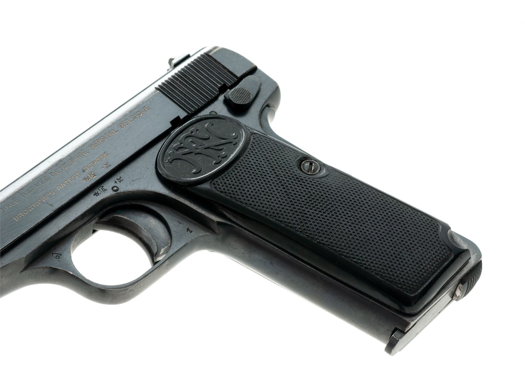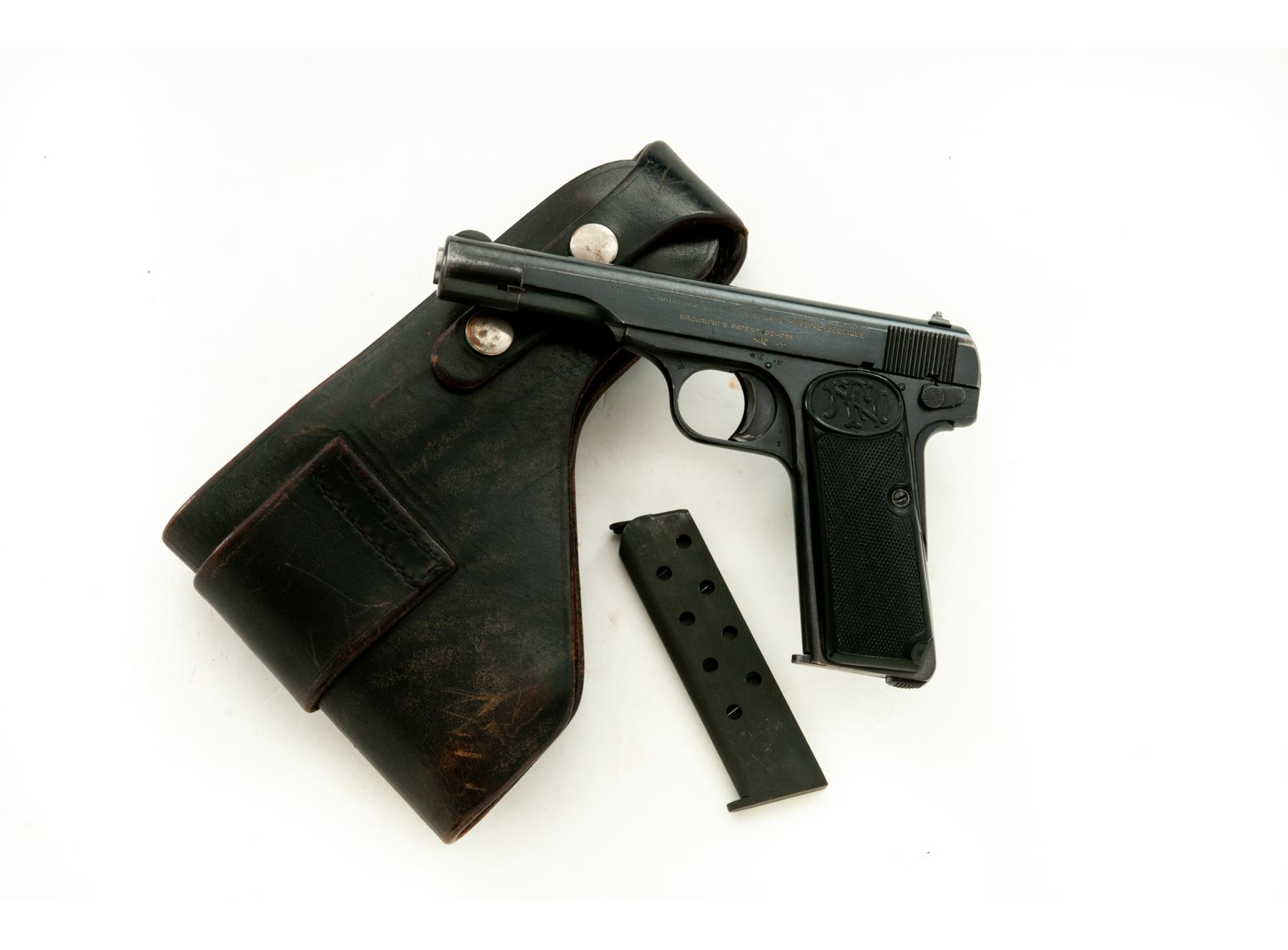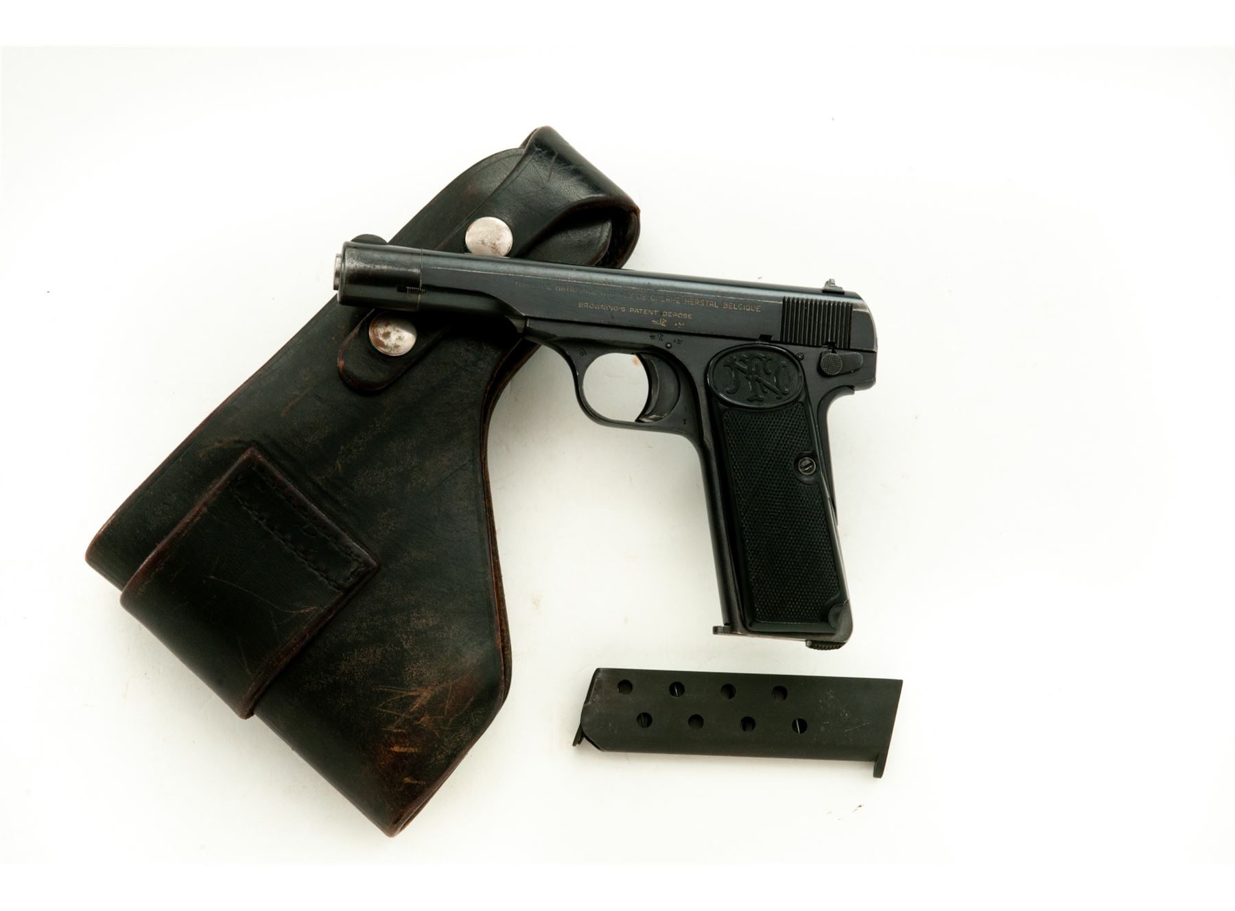 FN Model 1922 Semi-Automatic Pistol, with holster and one extra magazine, #35969, .32 Auto cal., 4-3/8'' barrel, blue finish, checkered black FN marked grips. Condition is fine retaining approx. 90% thinning blue, with most of the losses at forward portion of slide. Grips are excellent made reproductions. Action is good, bore is bright. Extra magazine is parkerized and not blue. Black leather holster is marked ''Corbisier''; flap is retained with two nickel-plated snaps. Est.: $250-$450. (C&R/PPT)