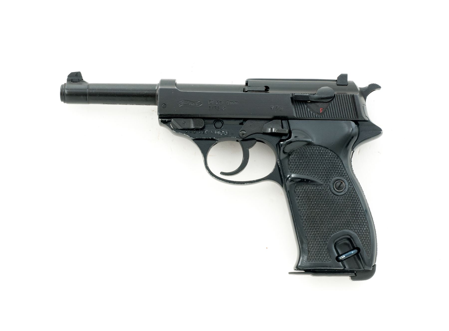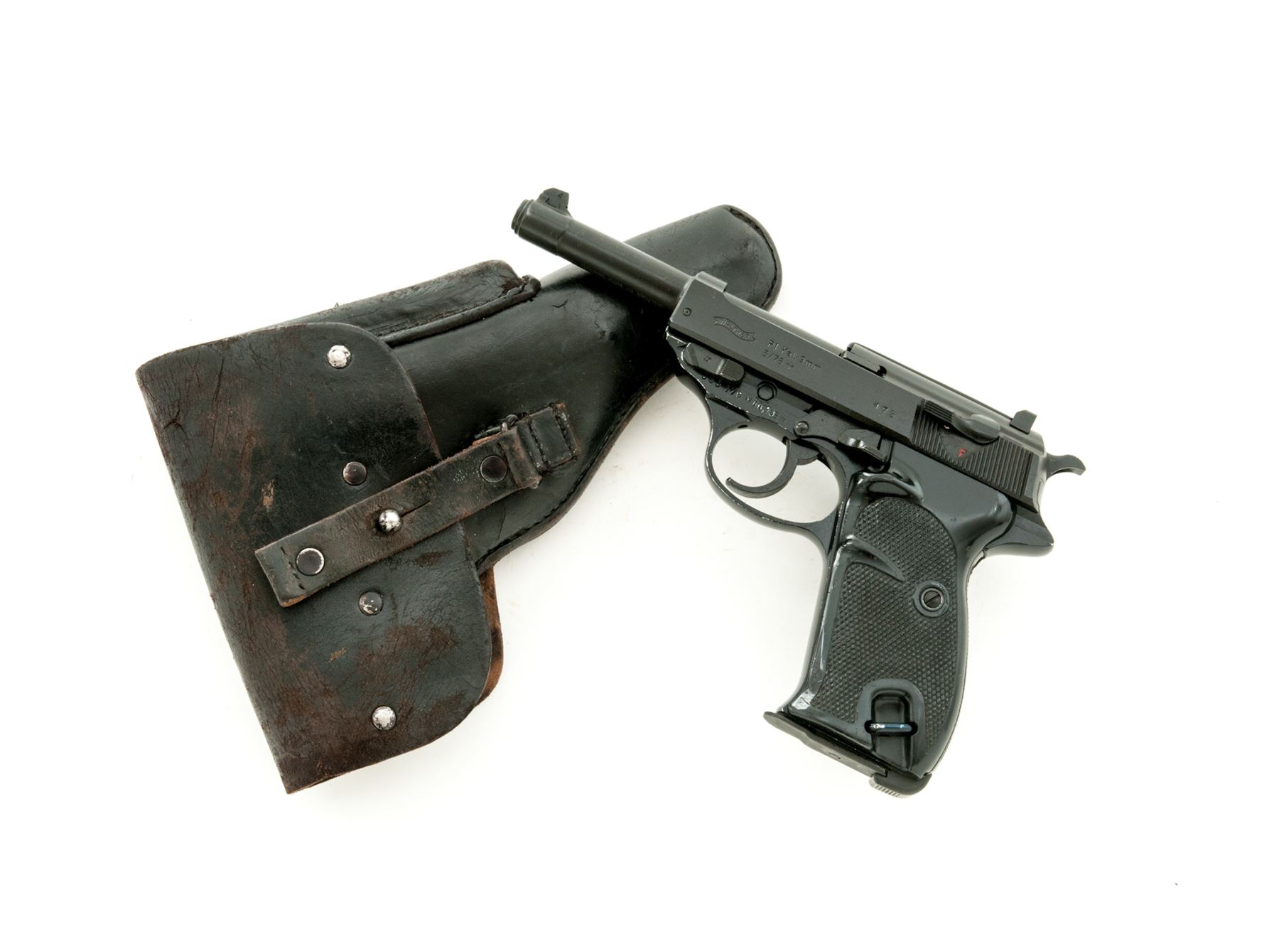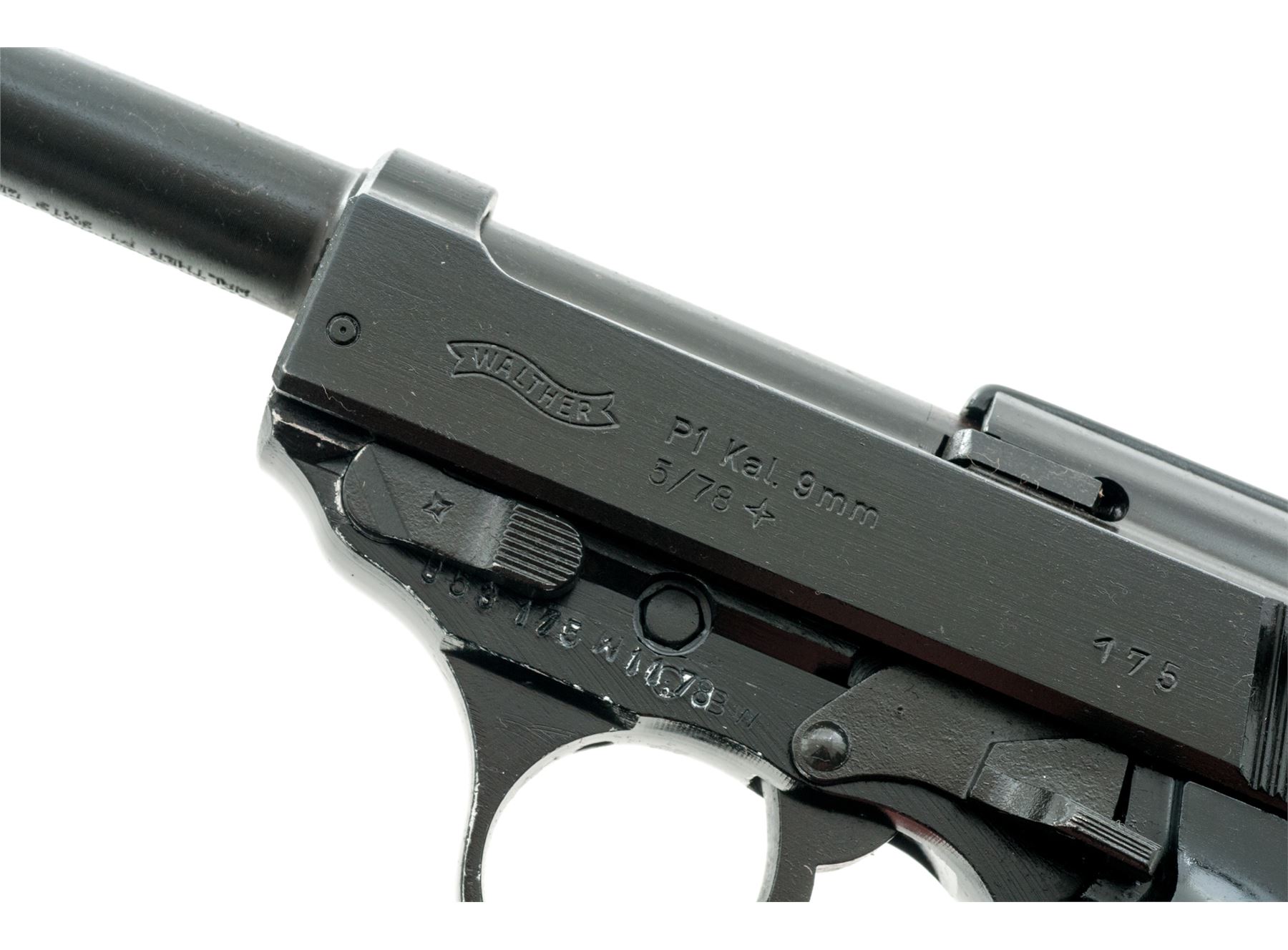 Walther P1 Semi-Automatic Pistol, with holster, #053175W11.78, 9mm, 5'' matte barrel and slide, aluminum frame with black finish, checkered black plastic grips, standard fixed sights, with one ''P38'' marked magazine and a second magazine that is still wrapped and sealed by the importer. Barrel, frame, and slide with visible matching numbers. Left side of slide is dated 05/78. Bottom of barrel is import marked. Left side of frame is marked ''BW'' with ''11.78'' rework date. Includes post-war holster that is dated 7/60 on the backside. In import box that is numbered to the gun with manual and other misc. paperwork. Approx. 96% matte and black finishes remain and metal surfaces rate as very good overall, with scattered rub marks to the matte finish and some edgewear on the frame. Grips are good; right grip with flattening to the lower portion of the checkering. Action is smooth with an excellent bore. Holster with solid stitching and seams; flap and magazine holder with cracking from age and wear. Est.: $350-$550. (C&R/PPT)