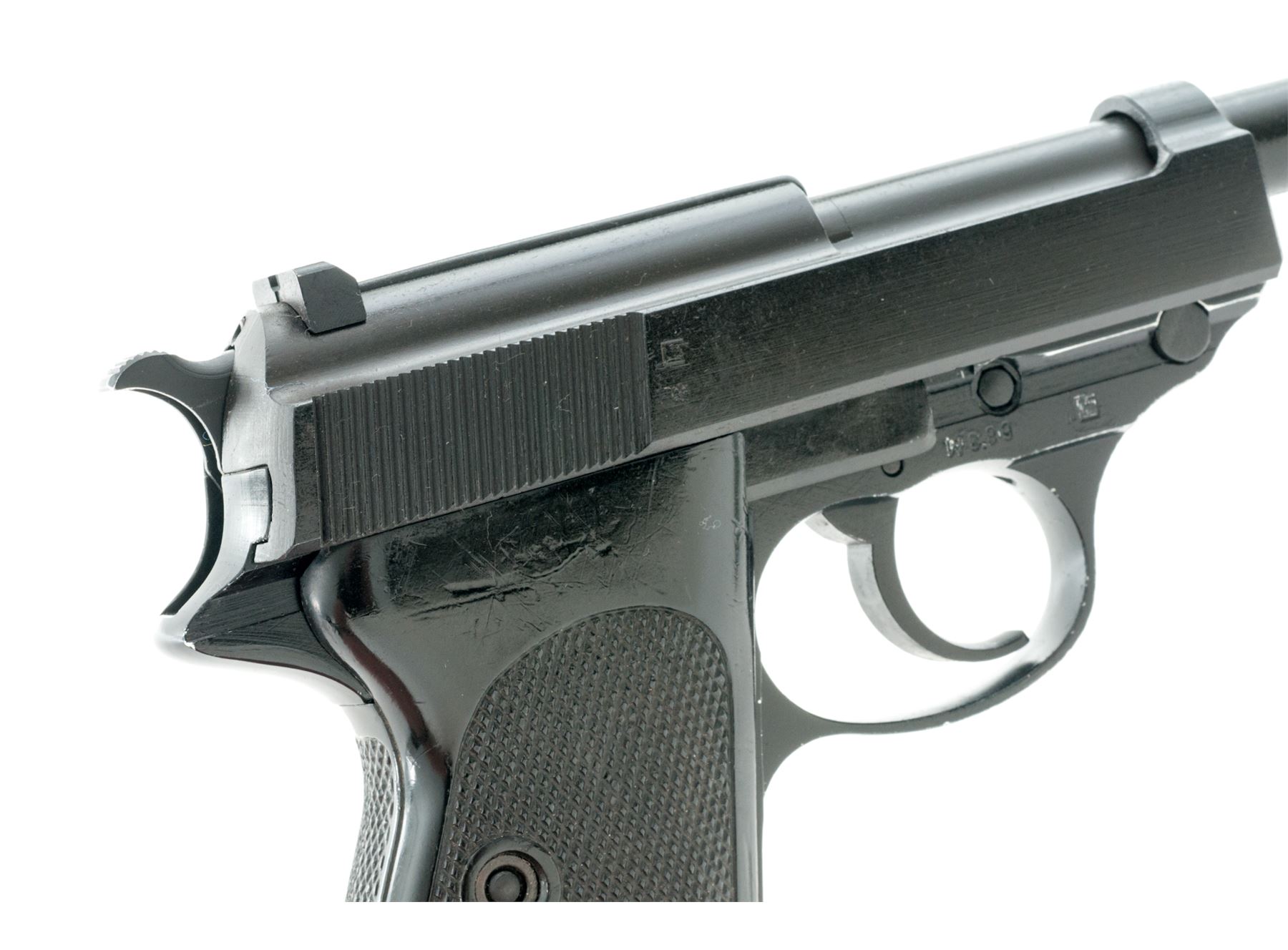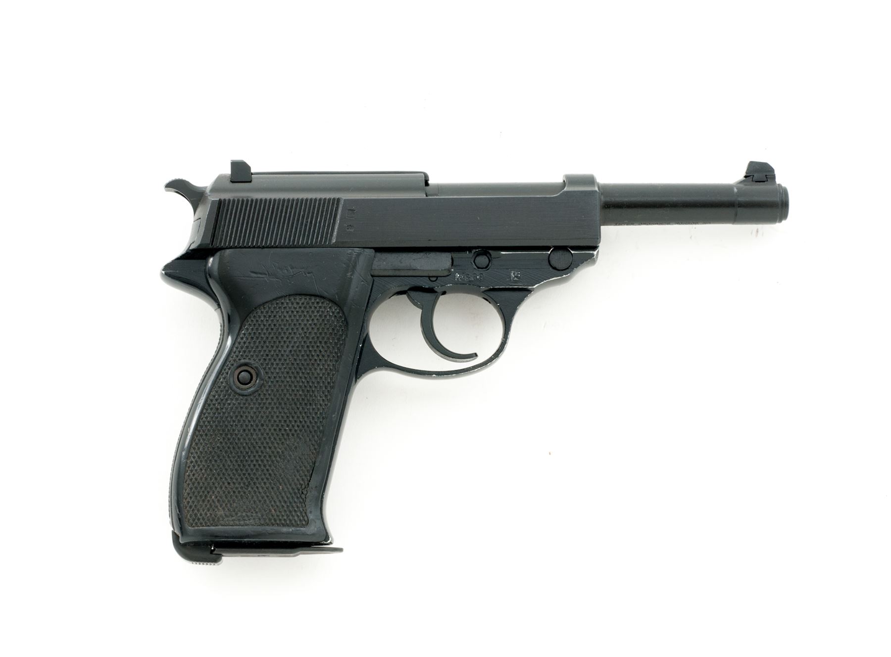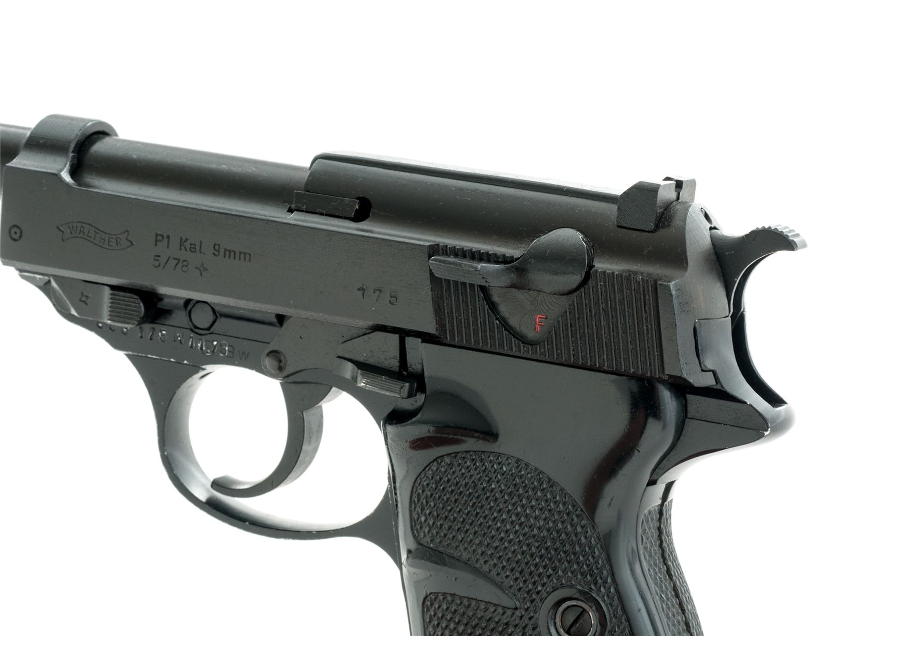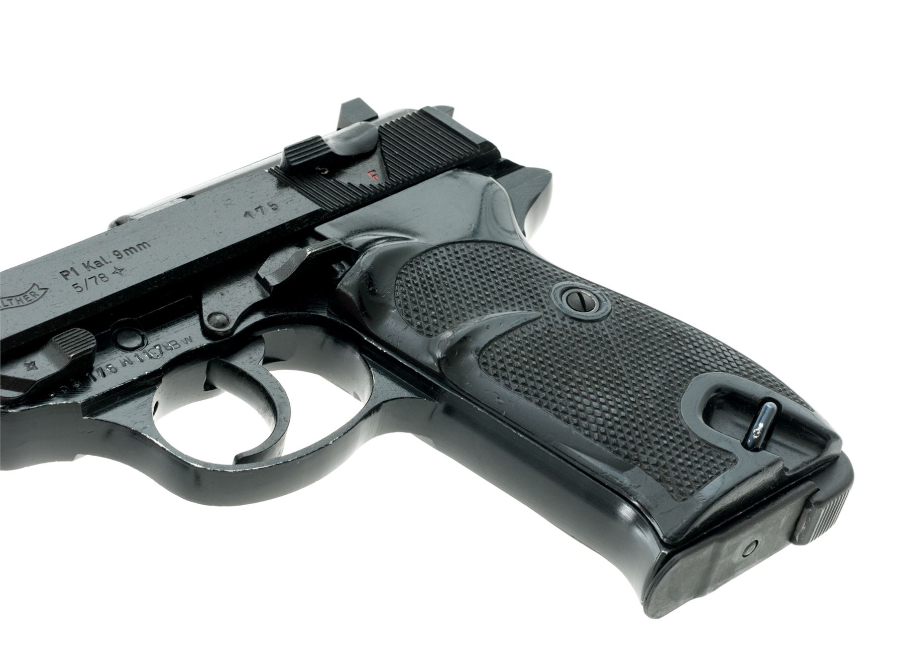 Walther P1 Semi-Automatic Pistol, with holster, #053175W11.78, 9mm, 5'' matte barrel and slide, aluminum frame with black finish, checkered black plastic grips, standard fixed sights, with one ''P38'' marked magazine and a second magazine that is still wrapped and sealed by the importer. Barrel, frame, and slide with visible matching numbers. Left side of slide is dated 05/78. Bottom of barrel is import marked. Left side of frame is marked ''BW'' with ''11.78'' rework date. Includes post-war holster that is dated 7/60 on the backside. In import box that is numbered to the gun with manual and other misc. paperwork. Approx. 96% matte and black finishes remain and metal surfaces rate as very good overall, with scattered rub marks to the matte finish and some edgewear on the frame. Grips are good; right grip with flattening to the lower portion of the checkering. Action is smooth with an excellent bore. Holster with solid stitching and seams; flap and magazine holder with cracking from age and wear. Est.: $350-$550. (C&R/PPT)
