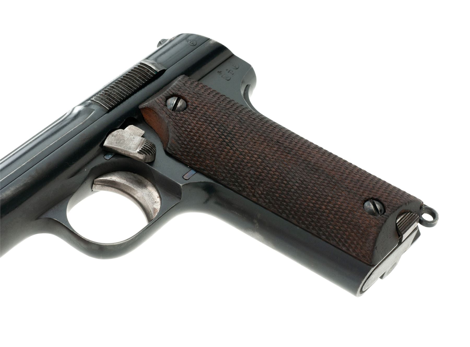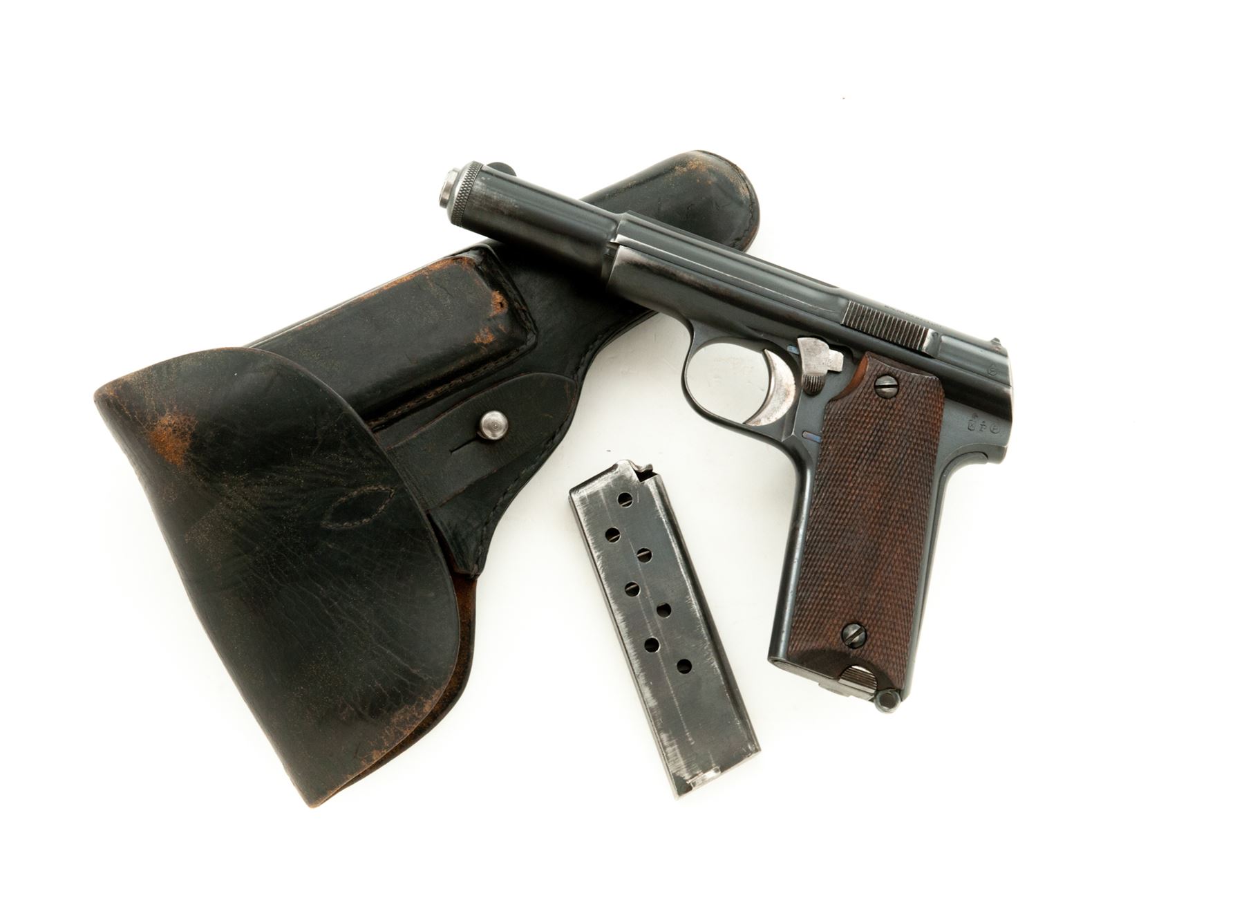 Astra Model 600/43 Semi-Automatic Pistol, in brown leather holster with two magazines, #47834, 9mm, 5.2'' barrel, blue finish, checkered walnut grips. Condition is fine to near excellent. This post-war example retains approx. 92% original factory blue. Grips with just moderate flattening to both panels. Good action, bright bore. One of the two magazines has had an old serial number crossed out at bottom of floorplate. Black flap holster is consistent with those used by the post-war West German police forces and shows moderate use. Many of these Astras were ordered by German police forces from the late '40s to the mid-1950s. Est.: $300-$500. (C&R/PPT)