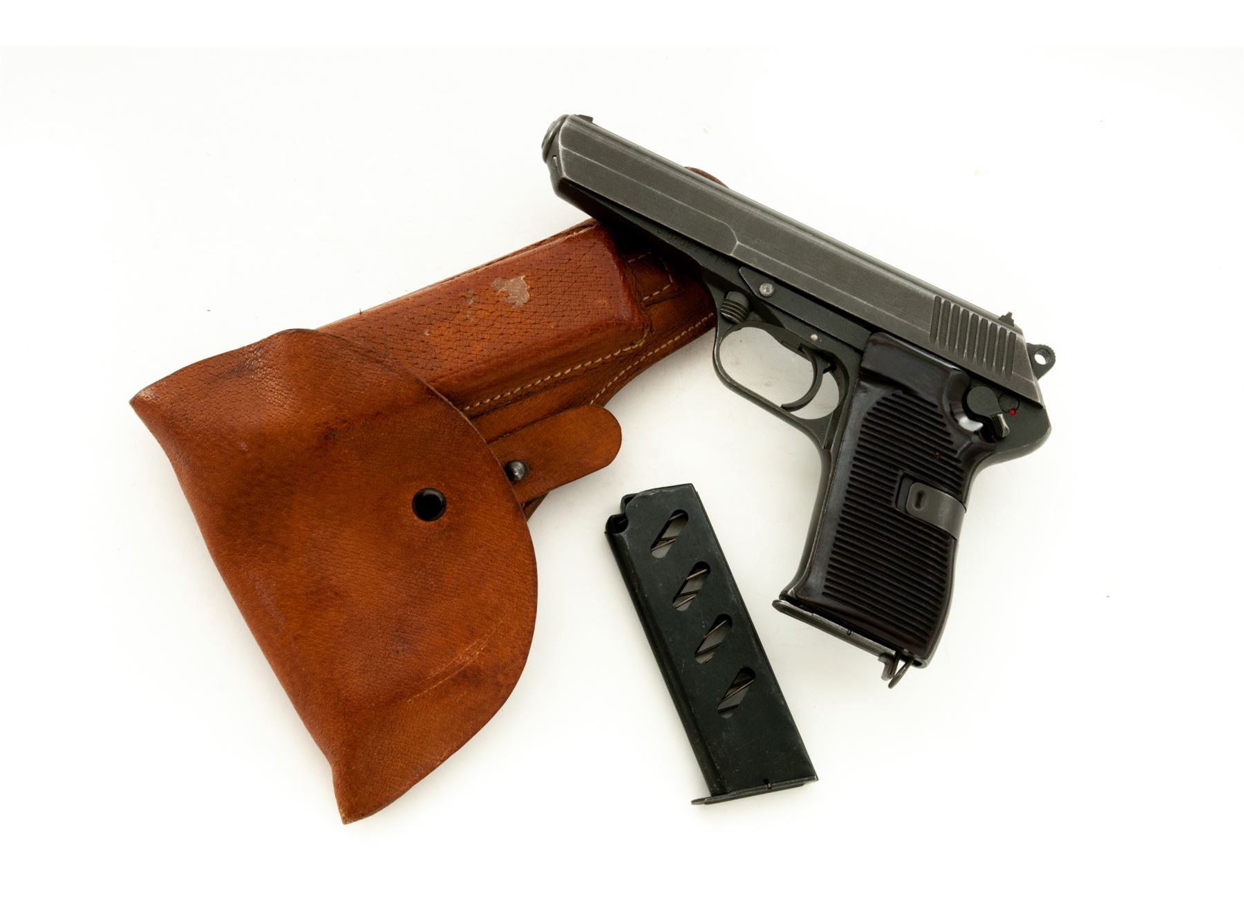 CZ vz/52 Semi-Automatic Pistol, #C04027, 7.62x25 cal., 4.5'' barrel, phosphate finish, brown phenolic grips, with pigskin holster, two (2) magazines, and cleaning rod. Matching numbered slide. Mfg'd 1953, with ''RIB'' mfg. code. Condition is near excellent as lightly import marked, with approx. 92%-94% original thinning finish. Grips and action are excellent, bore is bright. Holster is near excellent and dated 1953. Est.: $400-$600. (C&R/PPT)