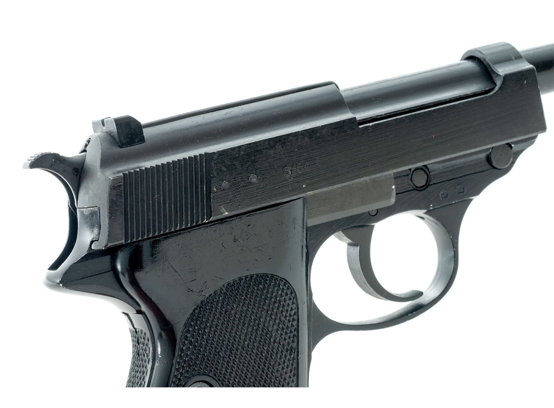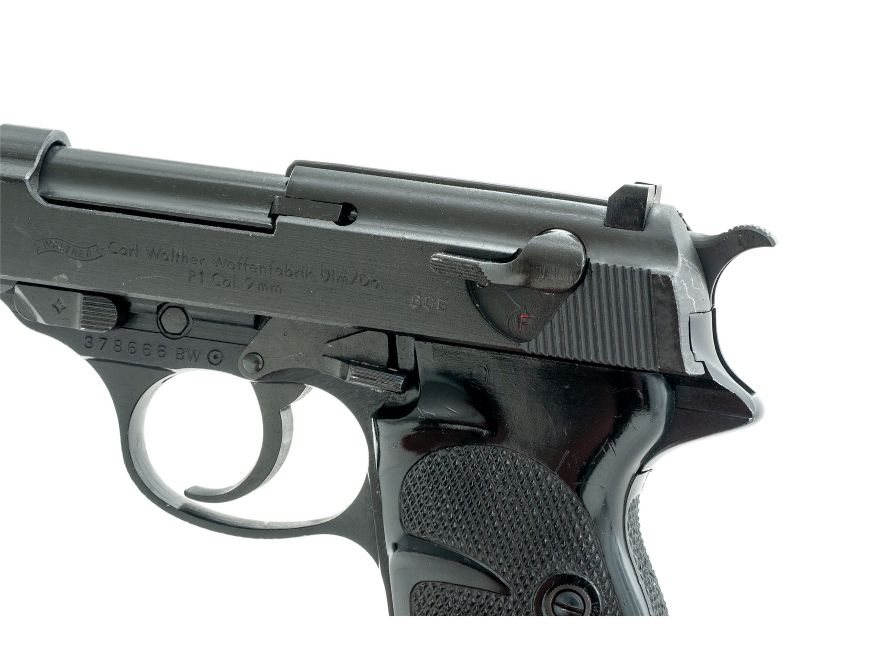 Walther P1 Semi-Automatic Pistol, #378666, 9mm, 4-7/8'' barrel, phosphate finish, factory checkered black plastic grips, with one Walther P1 marked magazine. Slide dated ''8/64''. Condition is excellent showing just light marks from arsenal and holster use. Good action, bright bore. Est.: $300-$500. (C&R/PPT)