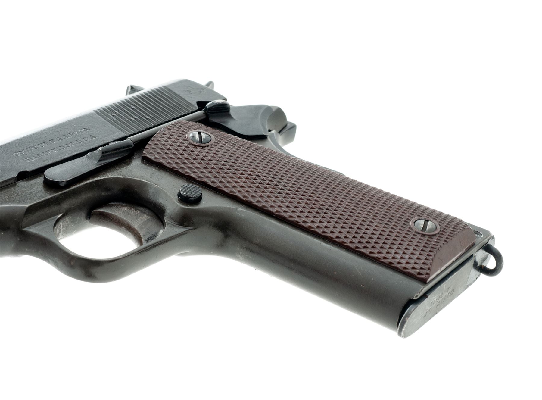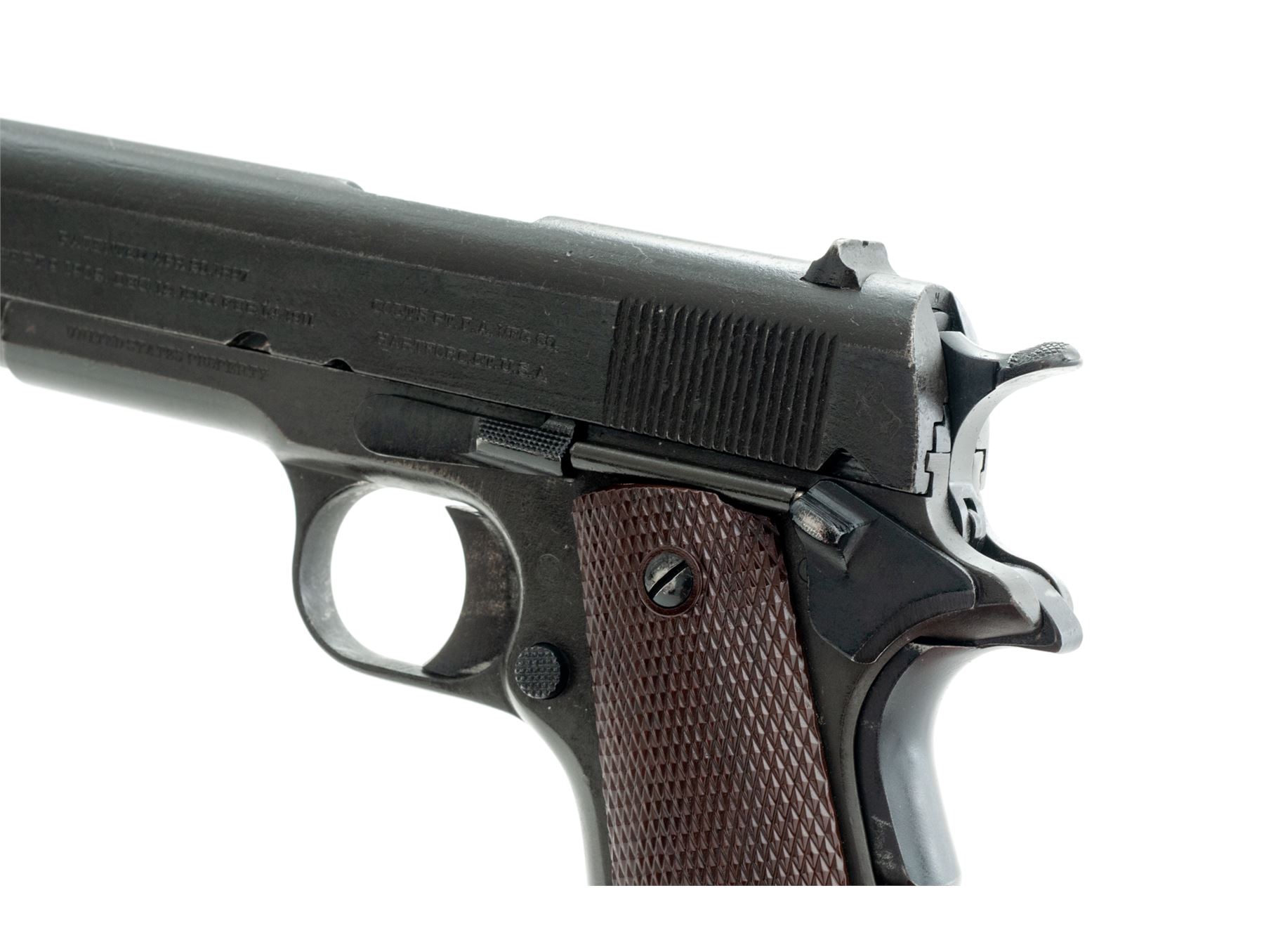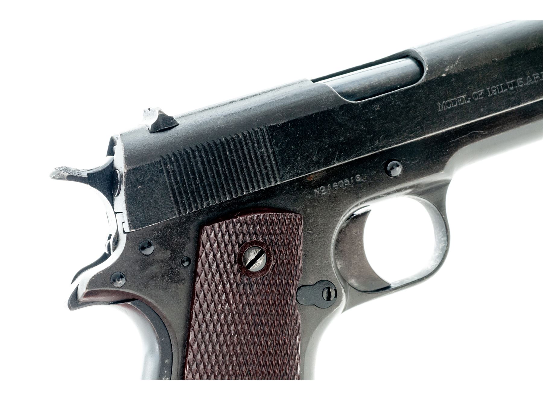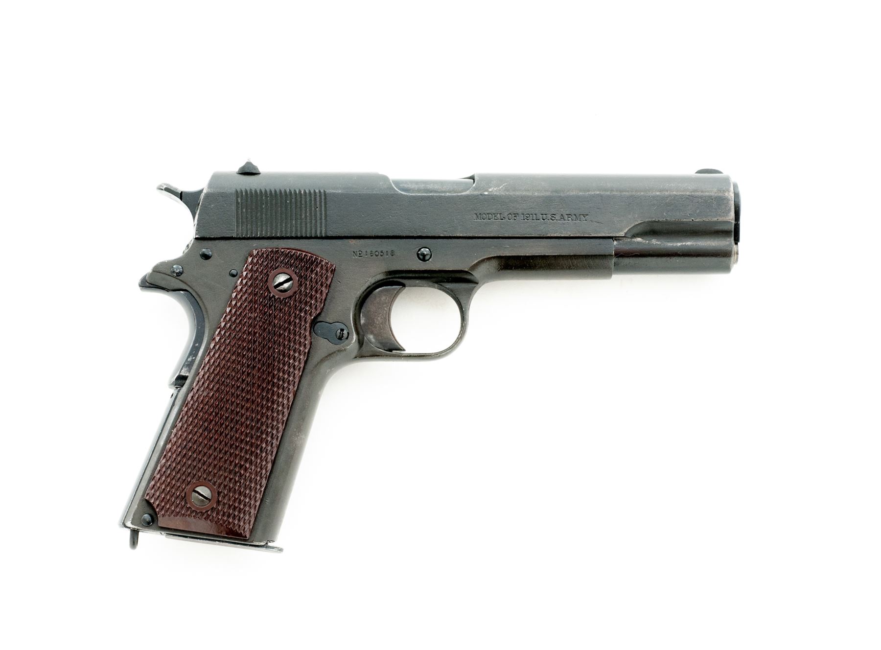 Colt Model 1911 Semi-Automatic Pistol, #160518, .45 ACP cal., 5'' barrel, parkerized finish, WWII era mismatched brown plastic checkered grips, with one post-war Colt magazine. Mfg'd 1917. Overhauled for WWII using mismatched WWI parts, as four-patent date slide is from an earlier pistol. Condition is excellent for this type firearm, retaining approx. 92% arsenal finish. Grips, action and bore are good. Est.: $800-$1,200. (C&R/PPT)