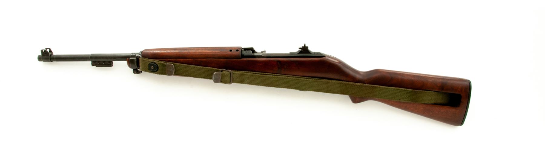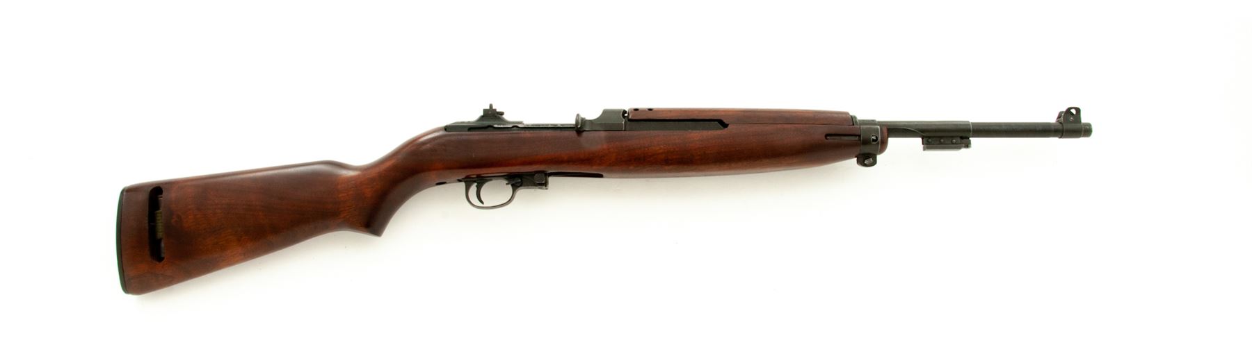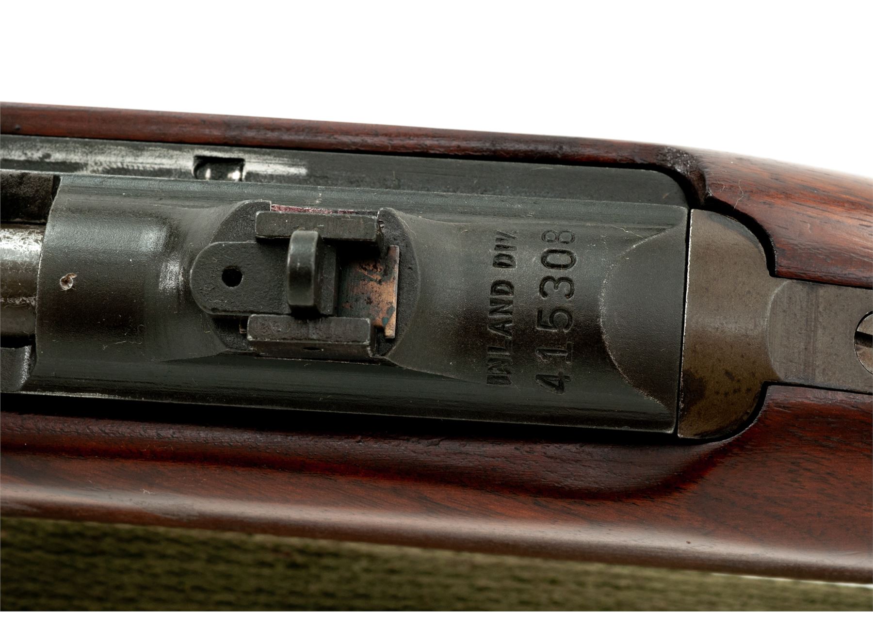 Inland M1 Semi-Automatic Carbine, #415308, .30 Carbine cal., 18'' barrel, parkerized finish, walnut stock, blade front sight with early two-position flip rear sight. Marked on chamber ''U.S.CARBINE CAL. 30 M1'' and on rear of receiver ''INLAND DIV.'' Barrel behind front sight is marked ''INLAND MFG DIV. GENERAL MOTORS 4-43''. No markings on stock. Round bolt. No magazine is included. Condition overall is very good with approx. 85% finish remaining on the metal with thinning on the bolt and receiver area. Stock has a wood putty repaired crack on the left side of the magazine well and has been sanded and refinished with a semi-gloss stain. Action is smooth, bore has darkening in the grooves, otherwise very good. Includes a U.S.G.I. sling marked ''MRT'' and an oiler marked ''IS''. Est.: $750-$950. (C&R)