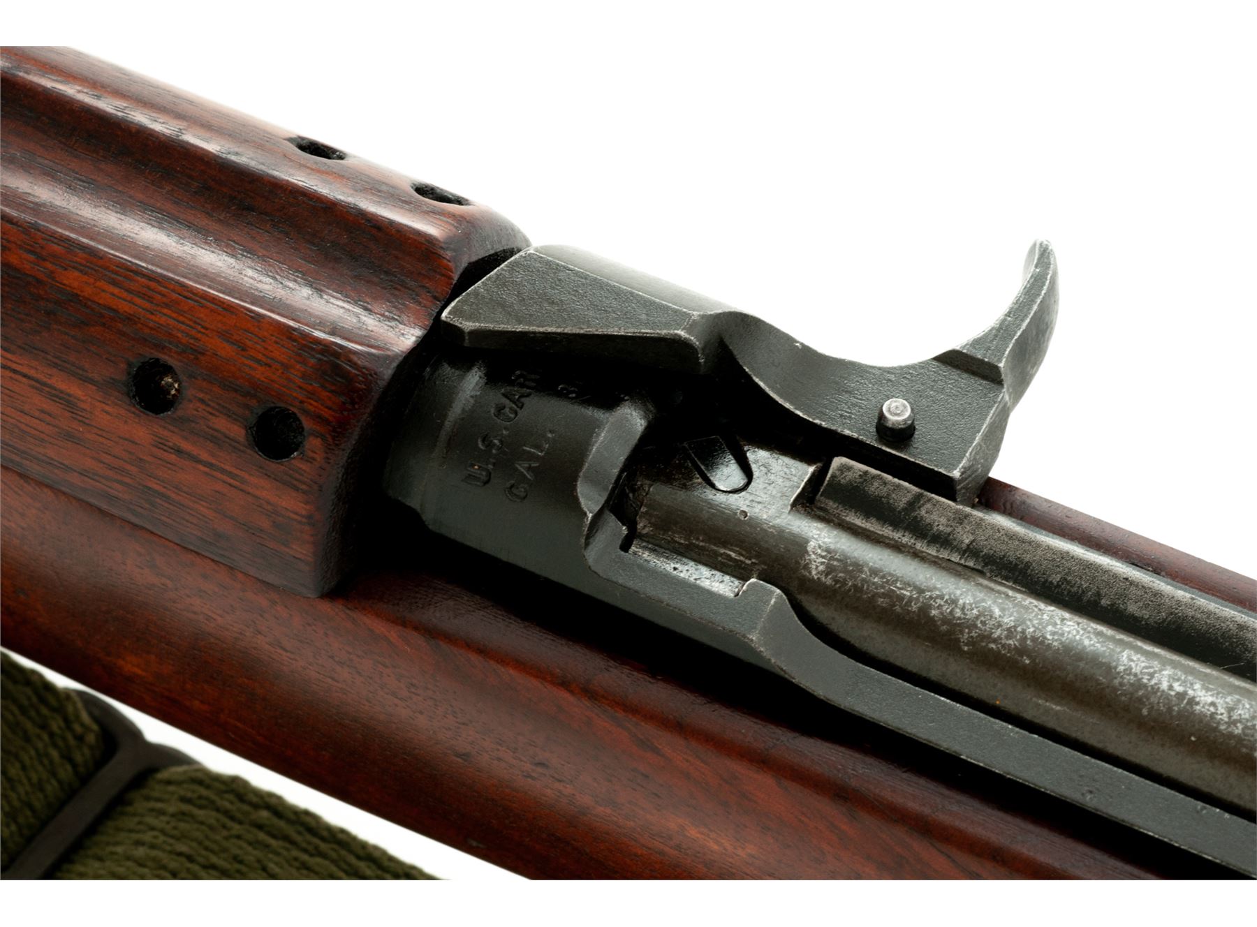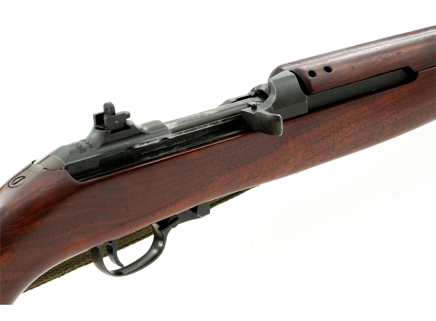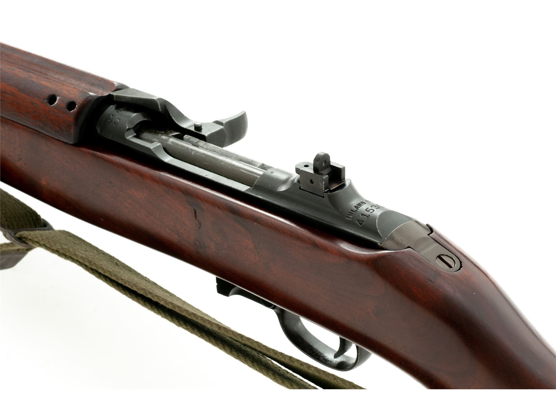 Inland M1 Semi-Automatic Carbine, #415308, .30 Carbine cal., 18'' barrel, parkerized finish, walnut stock, blade front sight with early two-position flip rear sight. Marked on chamber ''U.S.CARBINE CAL. 30 M1'' and on rear of receiver ''INLAND DIV.'' Barrel behind front sight is marked ''INLAND MFG DIV. GENERAL MOTORS 4-43''. No markings on stock. Round bolt. No magazine is included. Condition overall is very good with approx. 85% finish remaining on the metal with thinning on the bolt and receiver area. Stock has a wood putty repaired crack on the left side of the magazine well and has been sanded and refinished with a semi-gloss stain. Action is smooth, bore has darkening in the grooves, otherwise very good. Includes a U.S.G.I. sling marked ''MRT'' and an oiler marked ''IS''. Est.: $750-$950. (C&R)