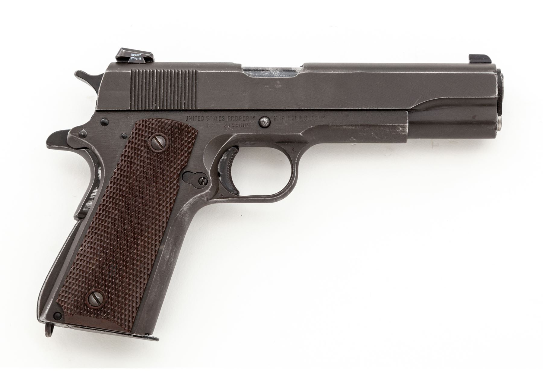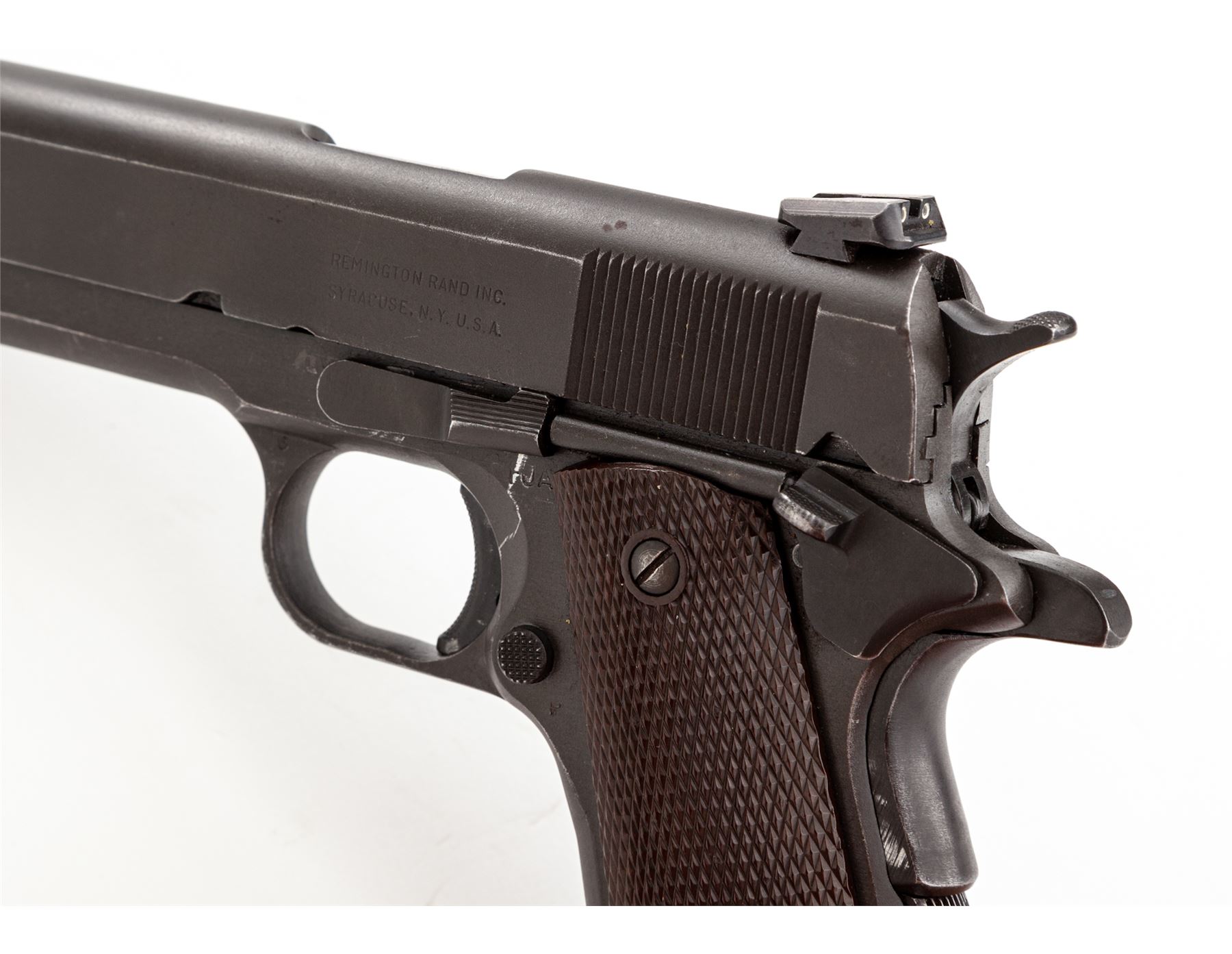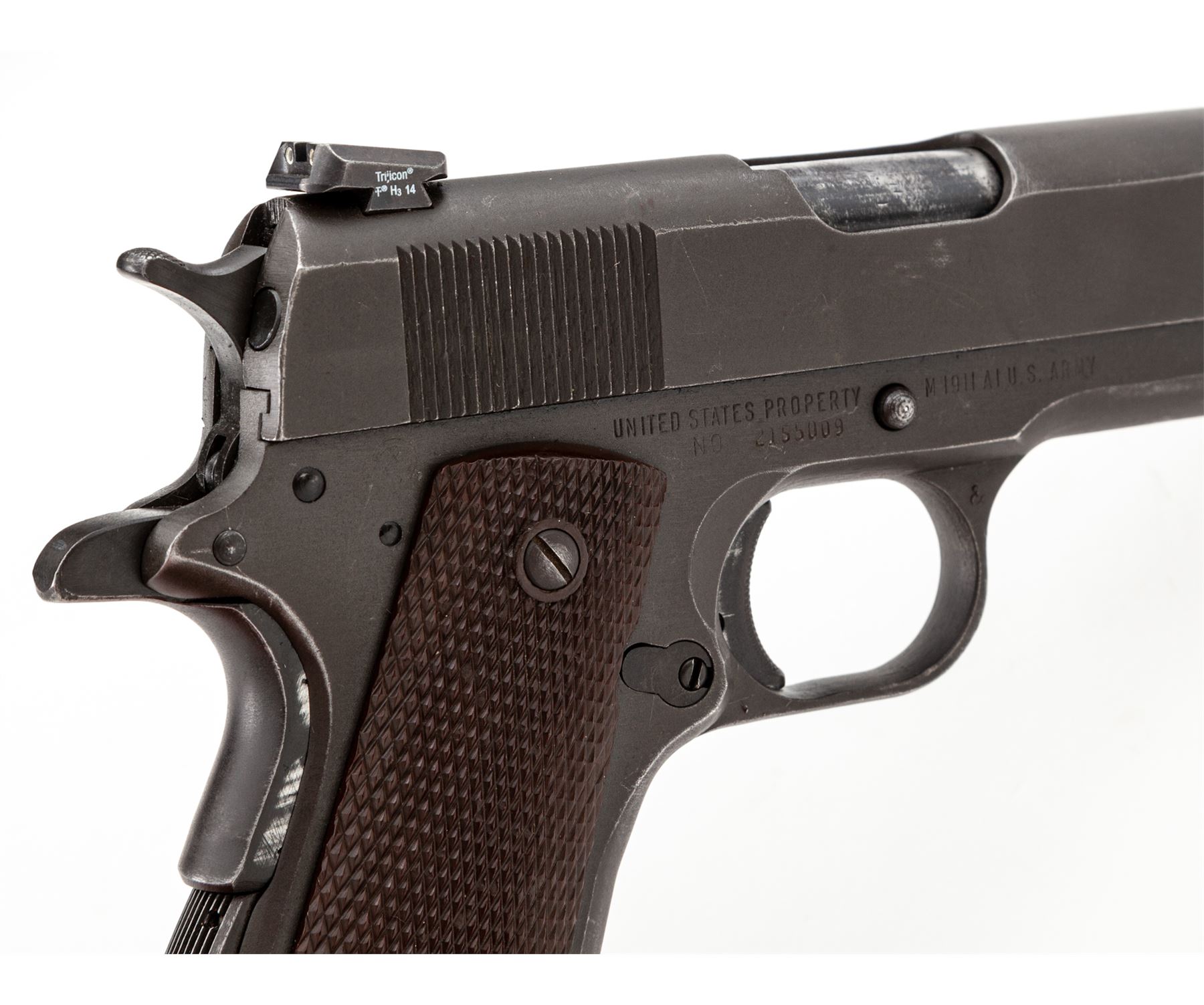 Customized Remington-Rand Model 1911-A1 Semi-Automatic Pistol, #2155009, .45 cal., 5'' barrel, parkerized finish, brown checkered plastic grips with small reinforcing rings, and three (3) magazines (2 WWII contract mags and one aftermarket bright mag.) Mfg'd 1944. Condition is about fine retaining approx. 92% original parkerized finish. Trijicon sights have been added. Grips show very light wear, predominantly to right panel. Good action, bright bore. Est.: $500-$750. (C&R/PPT)