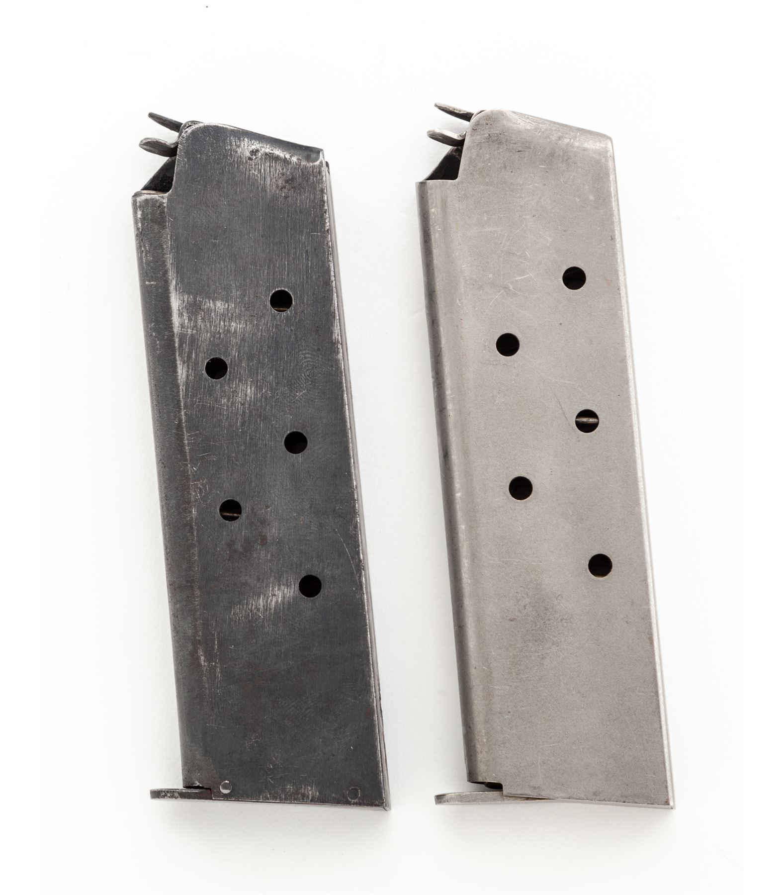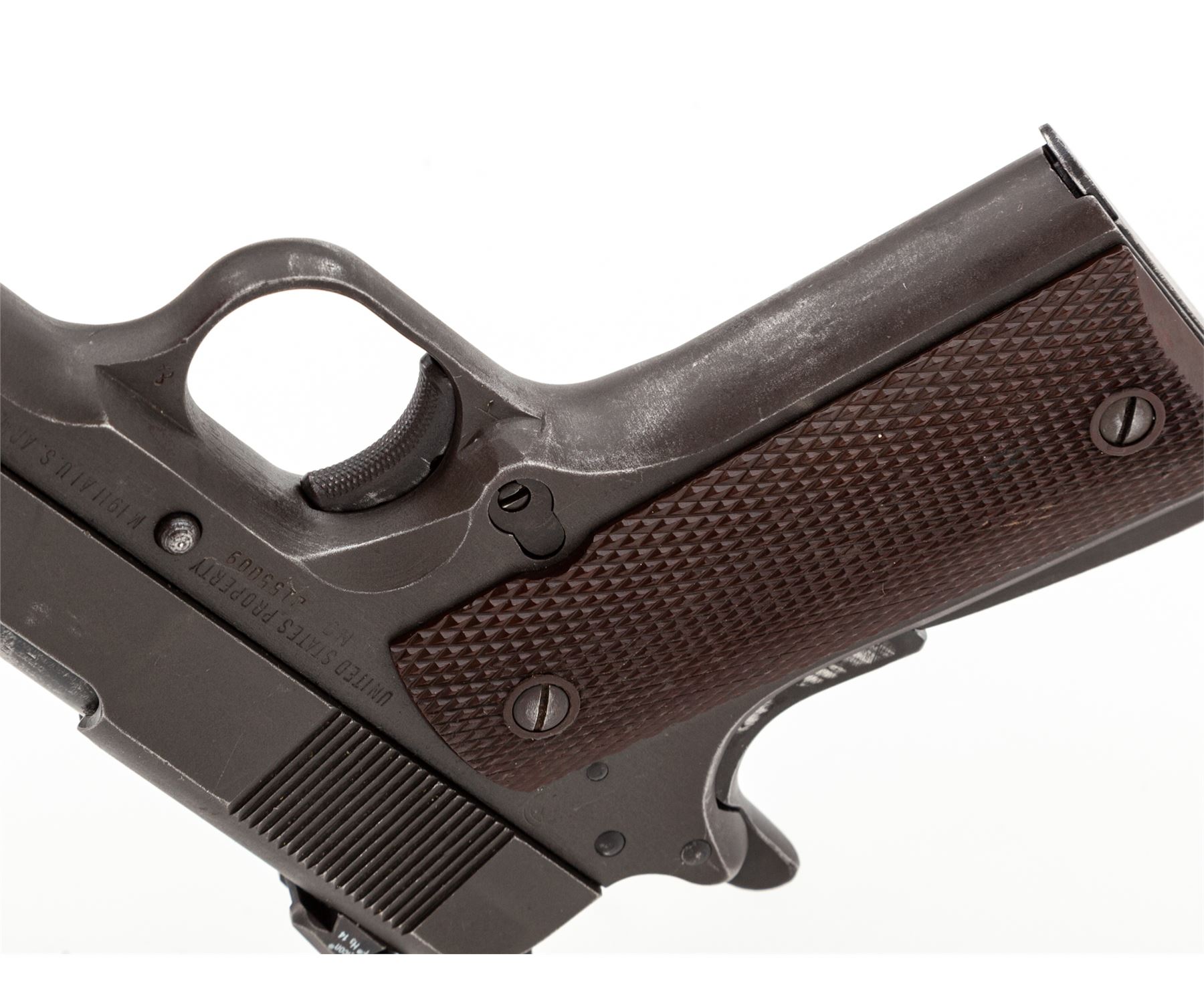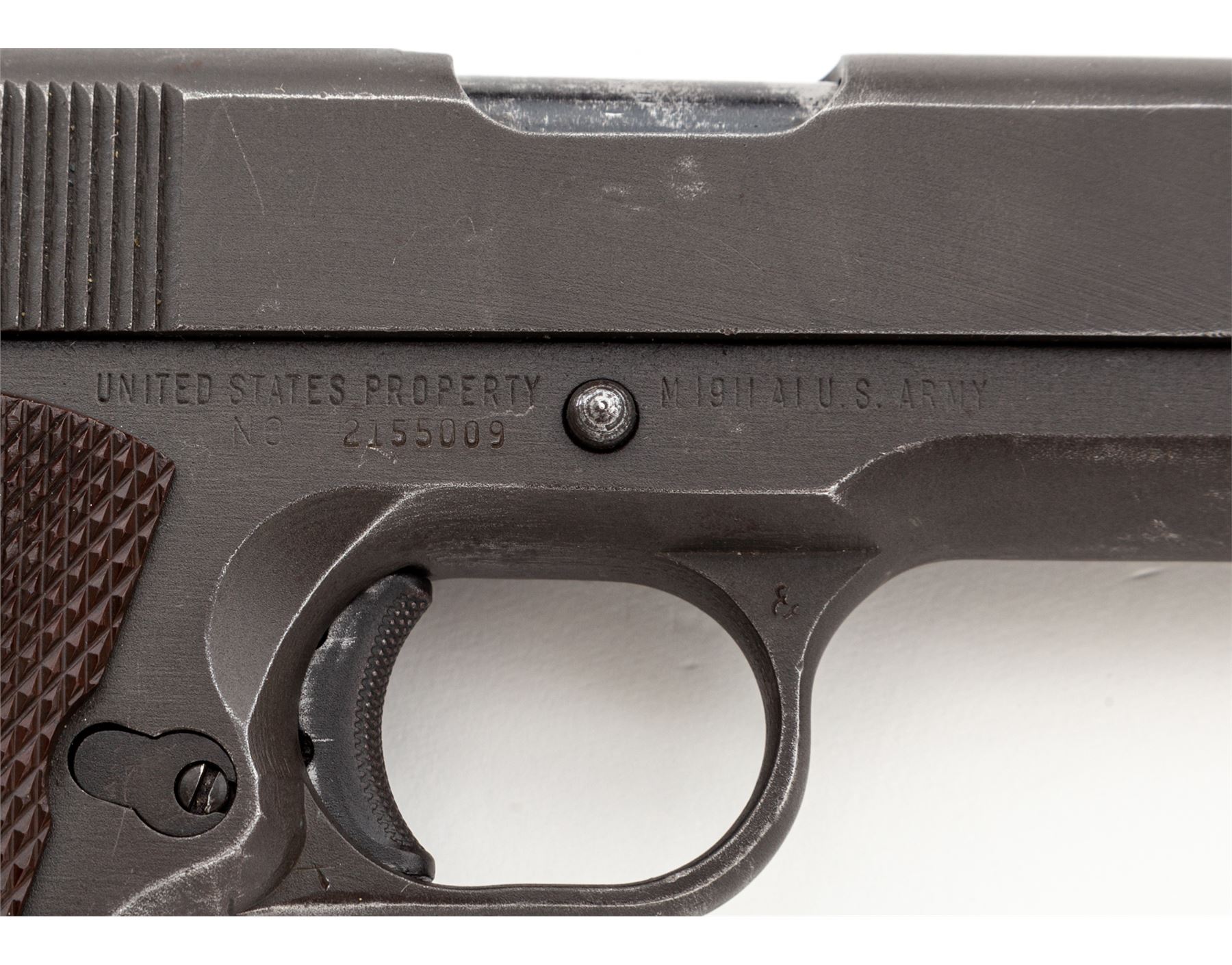 Customized Remington-Rand Model 1911-A1 Semi-Automatic Pistol, #2155009, .45 cal., 5'' barrel, parkerized finish, brown checkered plastic grips with small reinforcing rings, and three (3) magazines (2 WWII contract mags and one aftermarket bright mag.) Mfg'd 1944. Condition is about fine retaining approx. 92% original parkerized finish. Trijicon sights have been added. Grips show very light wear, predominantly to right panel. Good action, bright bore. Est.: $500-$750. (C&R/PPT)