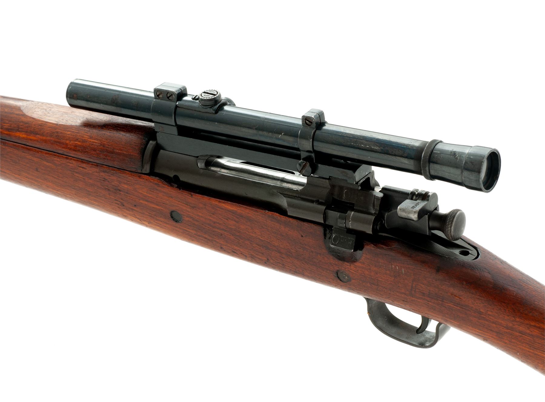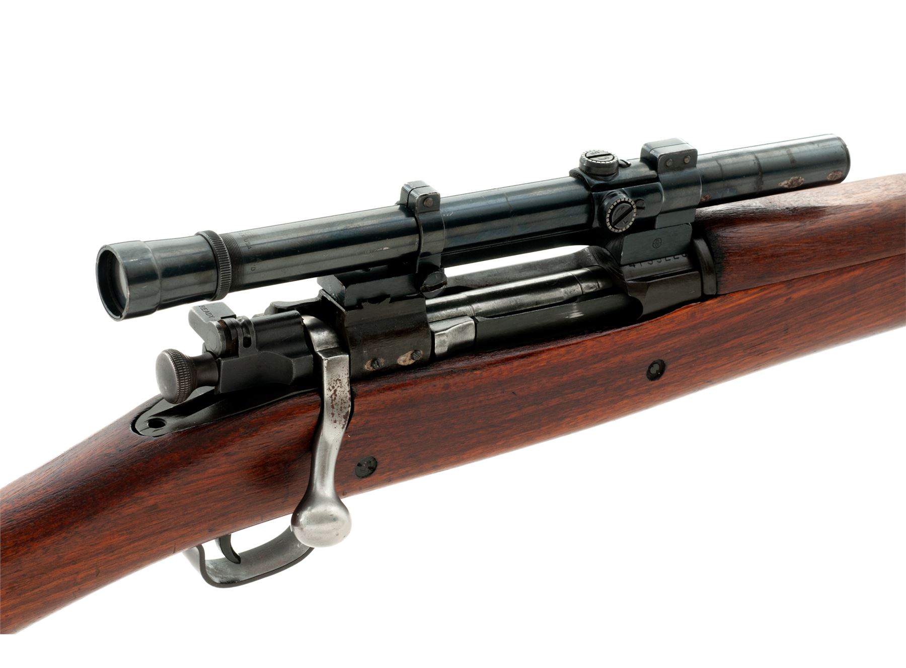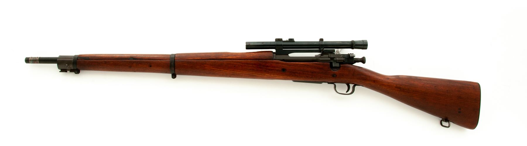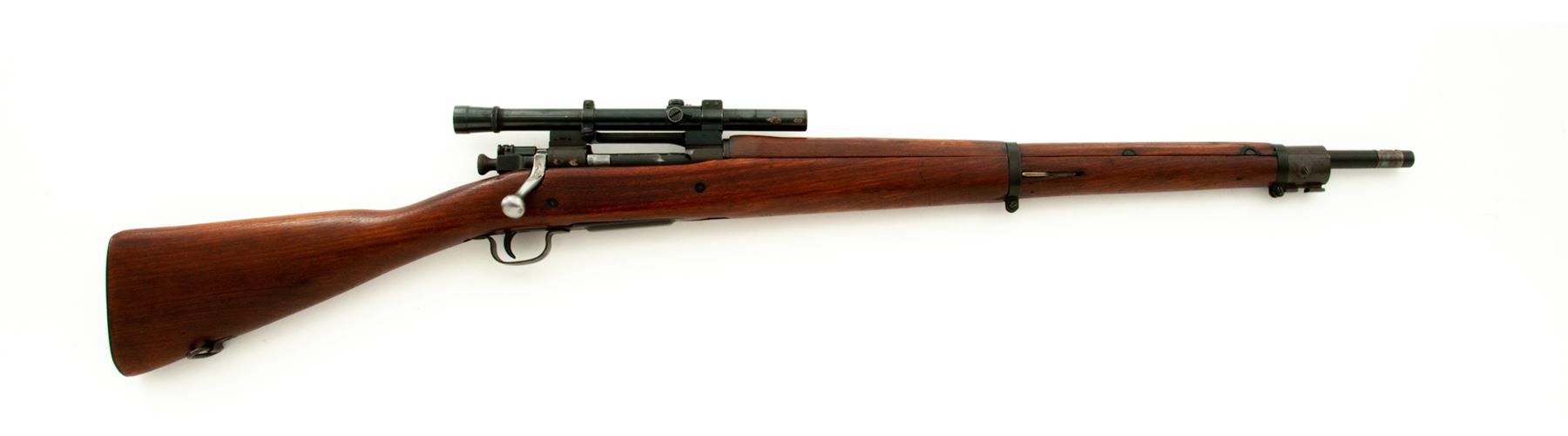 Smith-Corona Model 03-A3 Bolt Action Rifle, #4795220, .30-06 cal., 24'' barrel, parkerized finish, polished bluebolt with clearance cut to handle for scope, walnut stock and forend. Topped with a Weaver B4 scope on Redfield rings and mounts. Condition is fine as modified to resemble a 03-A4 sniper rifle. Front sight has been removed. Rifle retains approx. 95% original finish. A non-factory receiver sight has been removed from frame and two plug screws have been added. Stock shows light sanding and an additional coat of linseed oil. Good action and bore, scope optics are clear. Est.: $450-$650. (C&R)