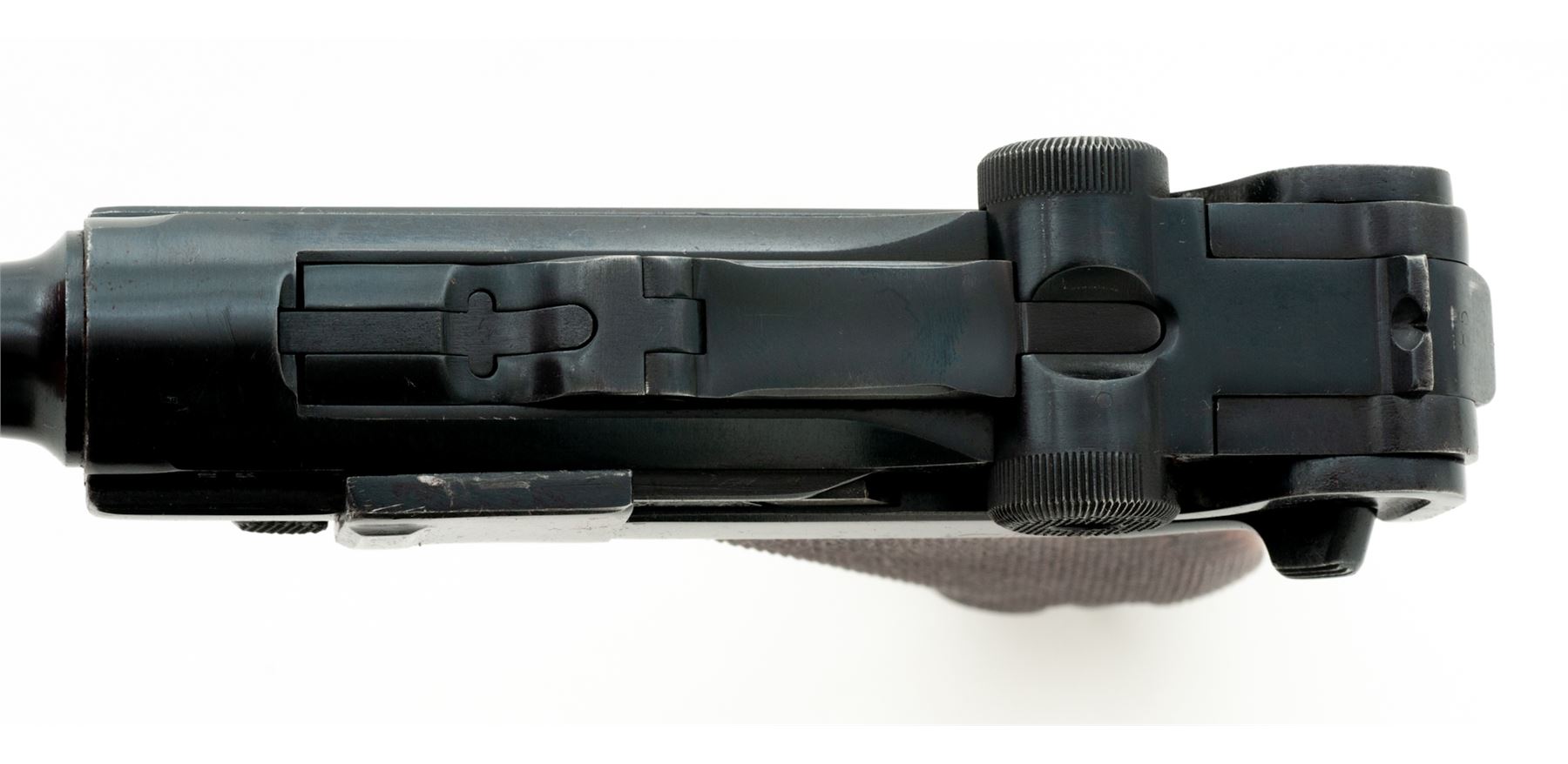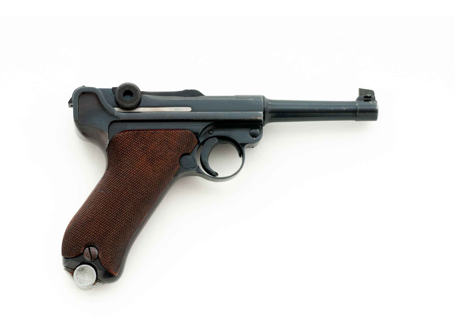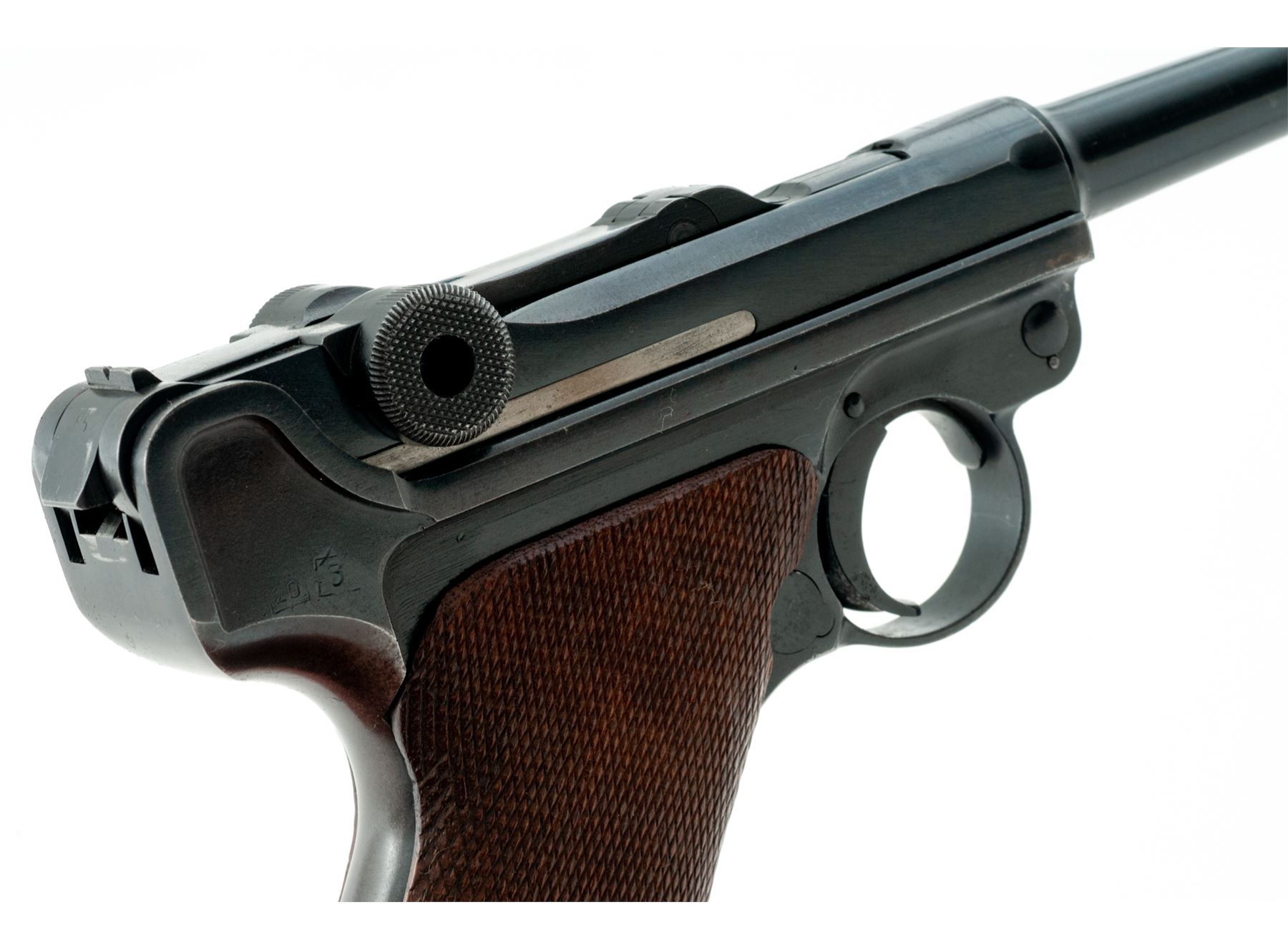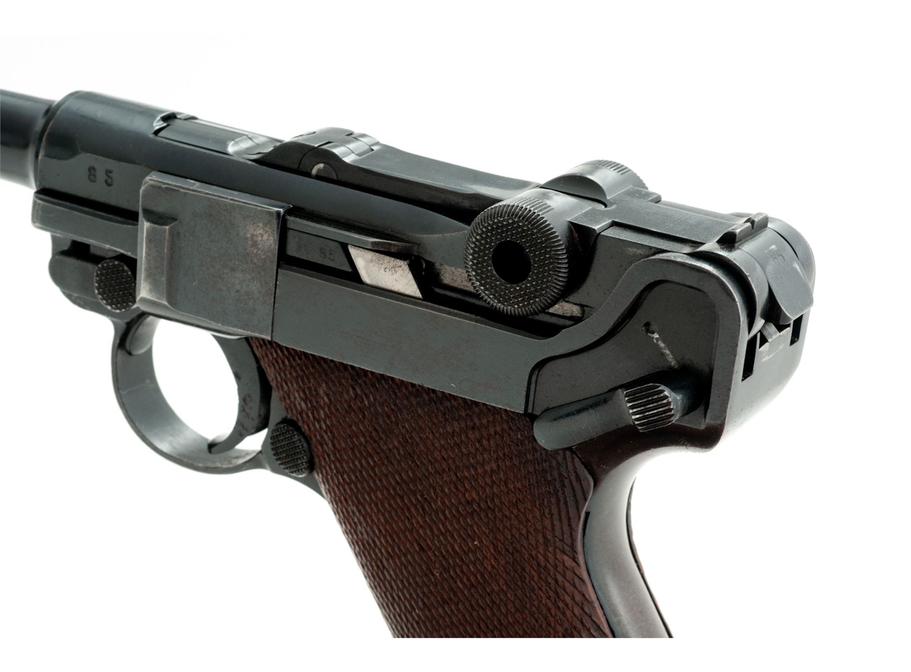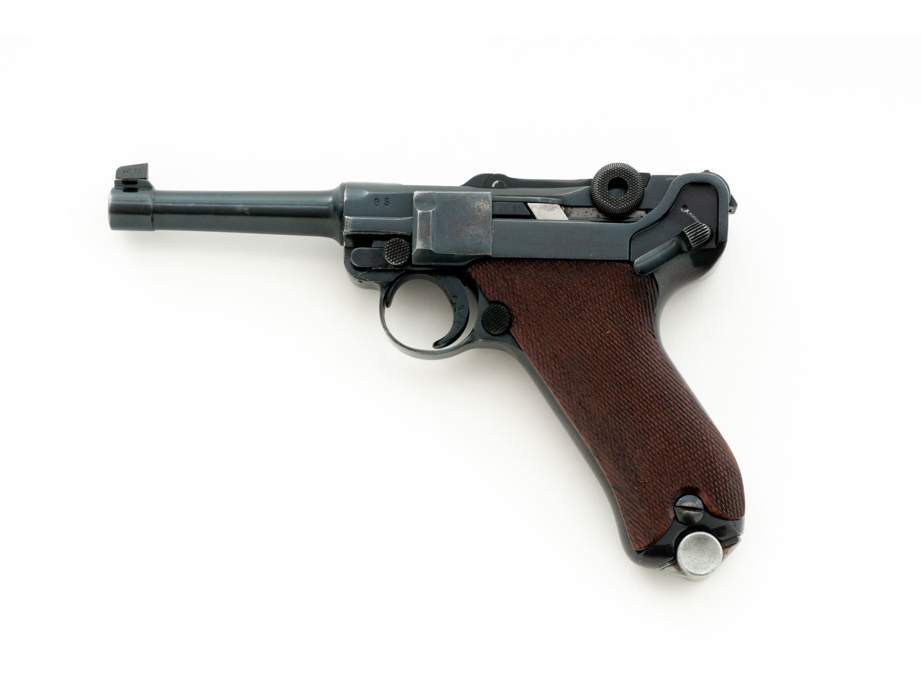 Post-War VOPO Luger, #85C, 9mm, 4'' barrel, blue finish, checkered walnut grips, with one late-war extruded body steel magazine with unmarked aluminum base. Unmarked chamber and toggle, ''85'' to left side of chamber area, as well as front of frame; right rear portion of lower frame behind toggle knob marked with boxed ''20'' and partially boxed ''3''. Slightly higher than original front sight blade marked ''+0.75''; unmarked thumb safety with plunge mill marks in lower position. Extractor marked in Cyrillic. Condition is excellent retaining approx. 90% of a lightly thinning and flaking salt blue. Trigger exhibits some light to just moderate pitting. Front and back strap have thinned and toned. Grips with moderate overall flattening and no losses. Action is good, bore is bright. Est.: $750-$1,000. (C&R)