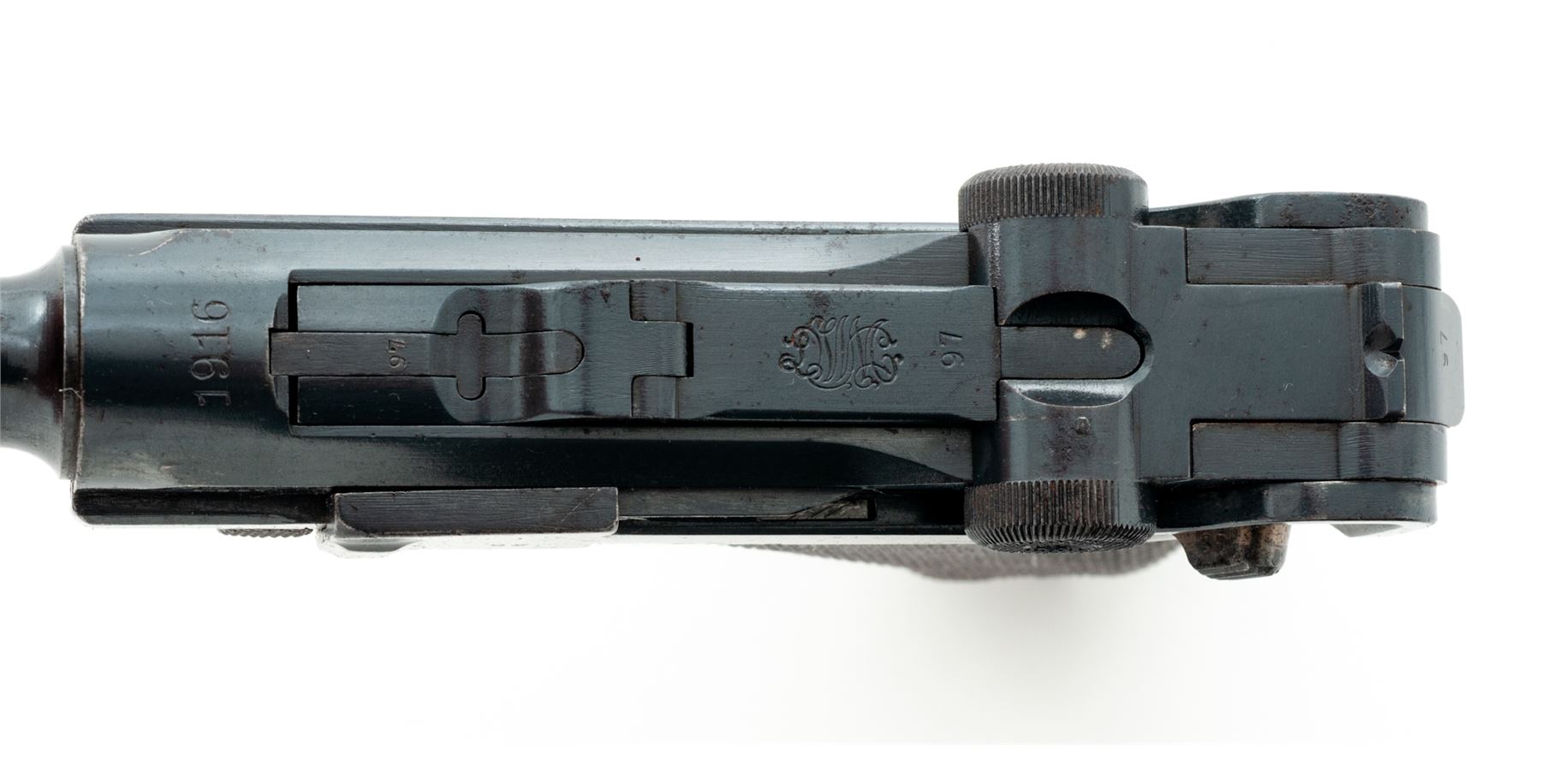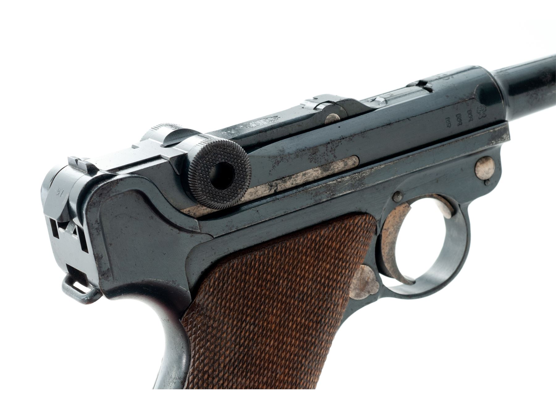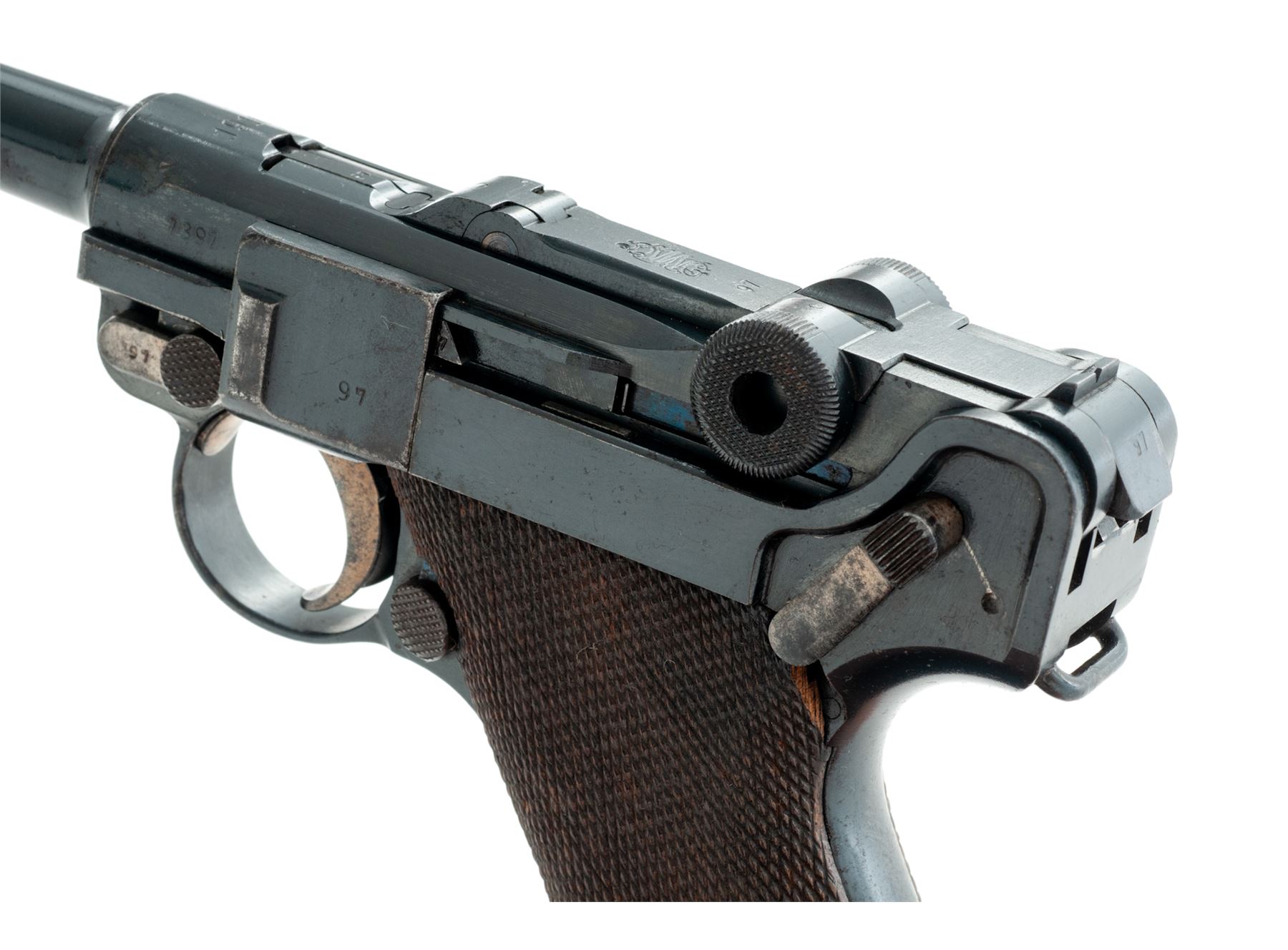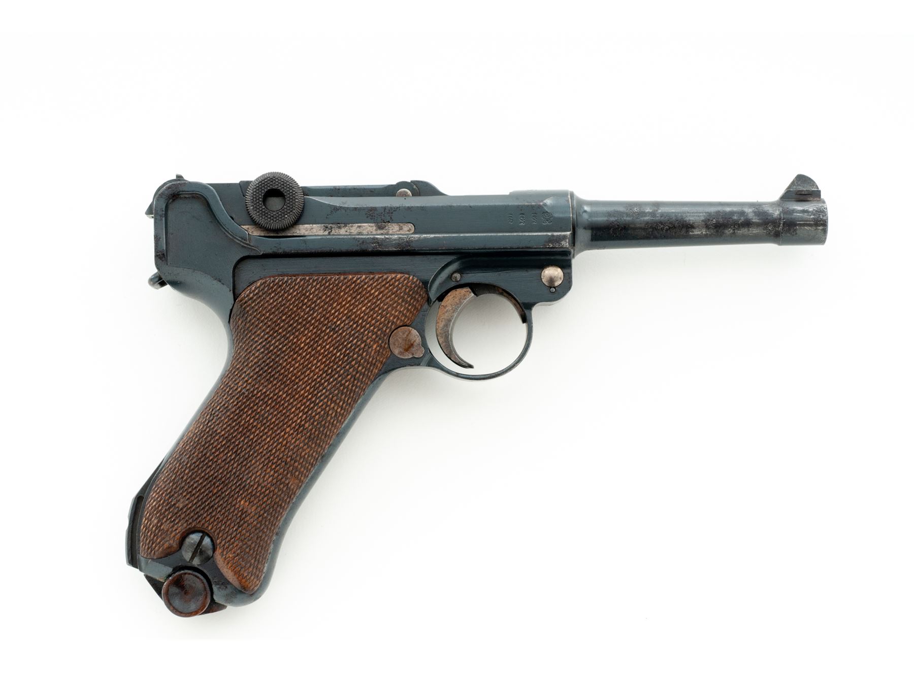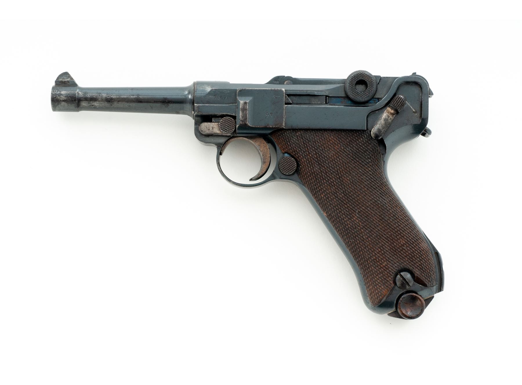 WWI Era P.08 Luger, #7397i, 9mm, 4'' barrel, blue finish, straw small parts, checkered walnut grips, with tin-plated wood based magazine with non-matching serial number. 1916 to chamber area, DWM to toggle link, ''Gesichert'' marked thumb safety, ''Geladen'' to extractor. All visible matching numbers, except magazine. Condition is fine retaining approx. 90% lightly thinning blue with light general pitting to barrel and most of the losses at highpoint of sideplate. Grips fit well with small sliver missing just below thumb safety, showing only light thinning to checks. Action is crisp, bore is bright. Est.: $800-$1,200. (C&R/PPT)