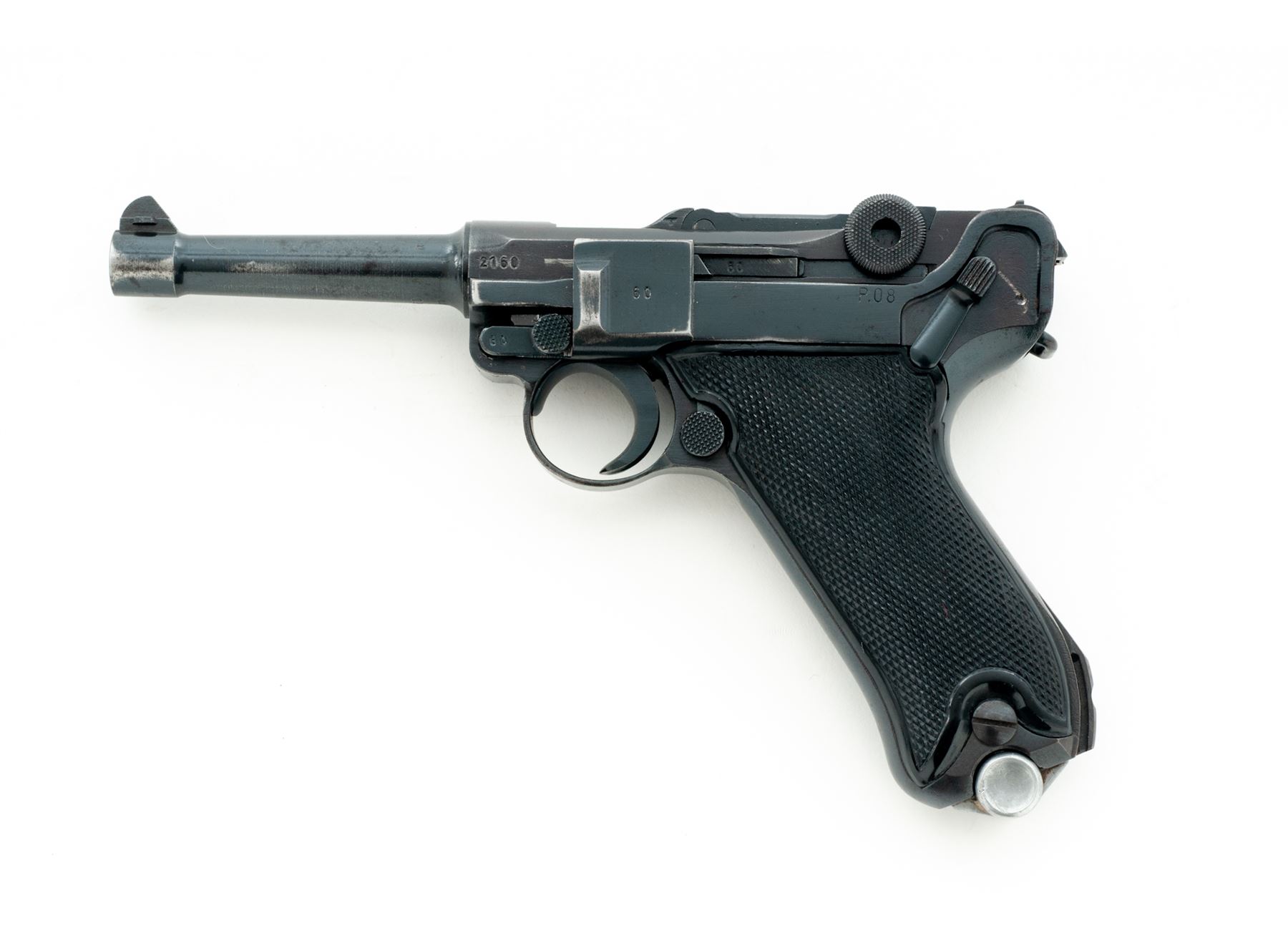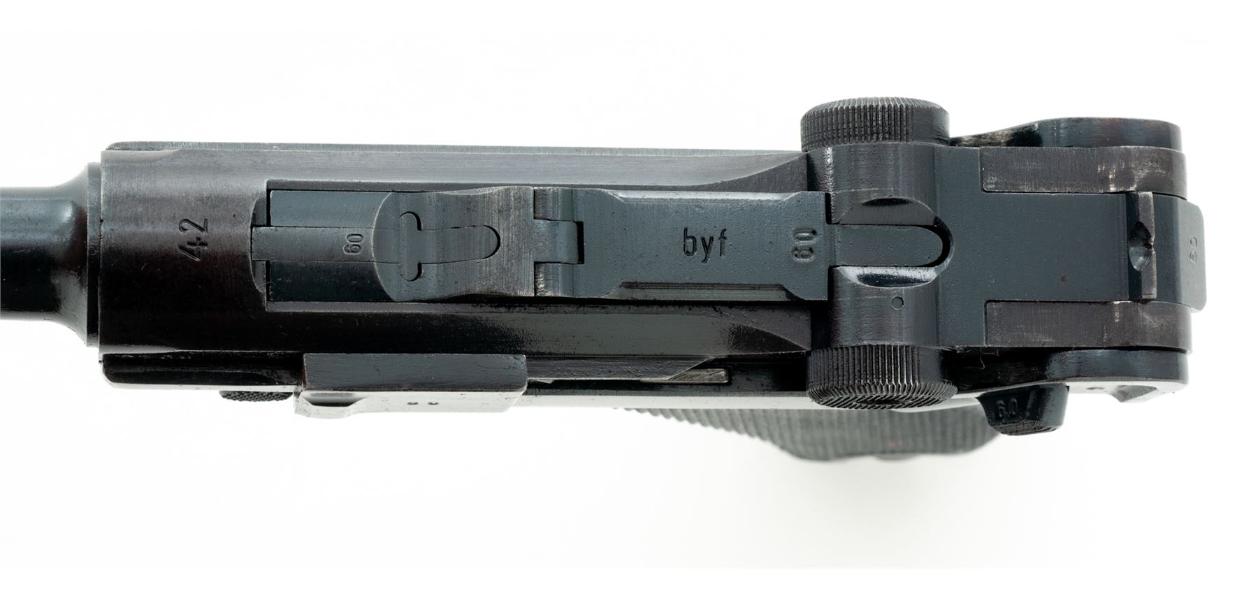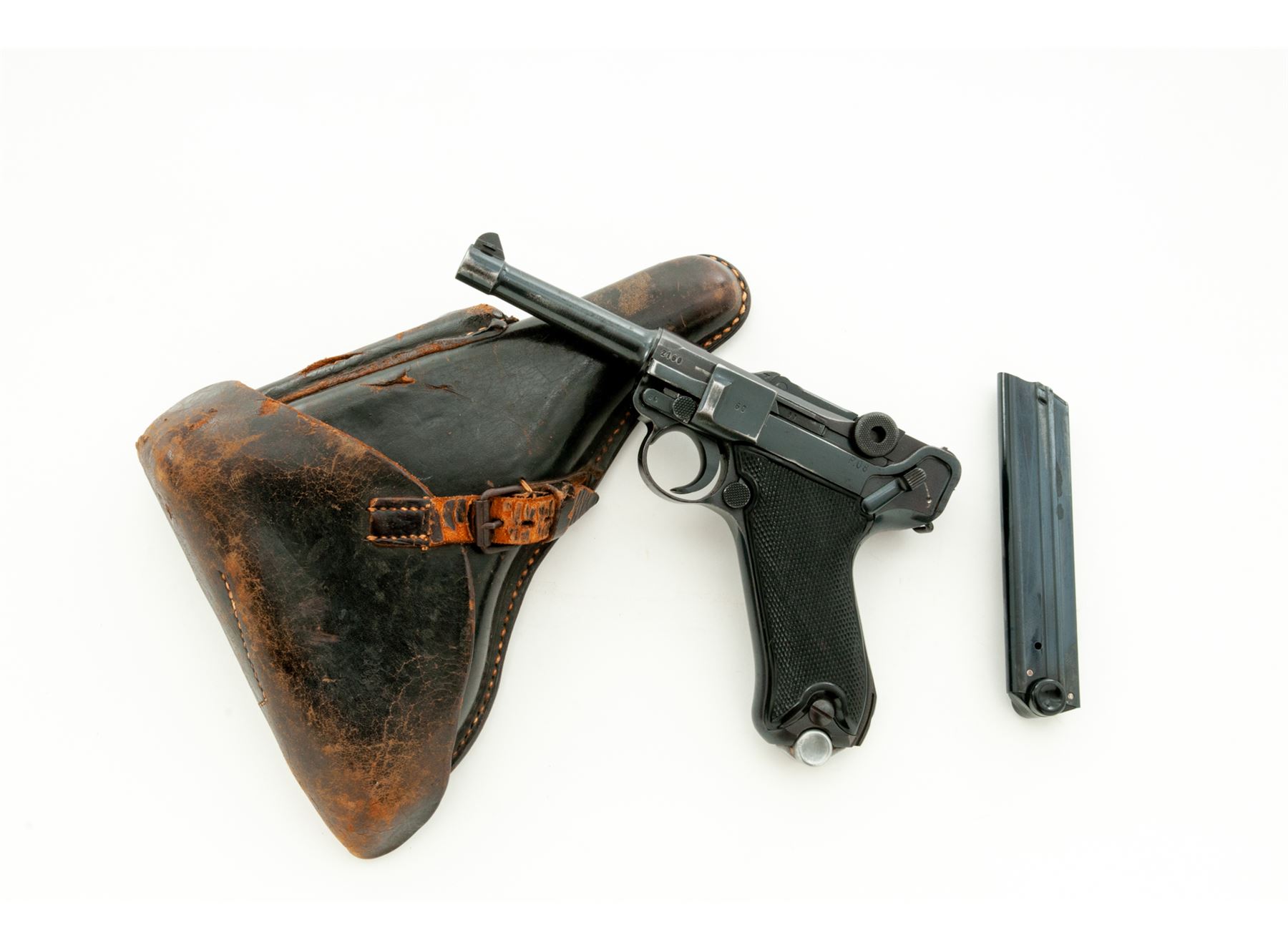 WWII Black Widow Luger, by Mauser, #2160c, 9mm, 4'' barrel, blue finish, checkered black plastic grips, with one mismatched WWII era magazine and one post-war mfg'd magazine, in black leather holster. Chamber area dated ''42'', toggle link marked ''byf'', all visible matching numbers. Condition is near excellent retaining approx. 90%-92% thinning blue. Grips with only very light wear. Action is good, bore is bright. Holster marked ''bml/42'', with WaA 26 ampt, showing moderate scuffing, and thinning and wear to strap area. Est.: $1,000-$1,500. (C&R/PPT)