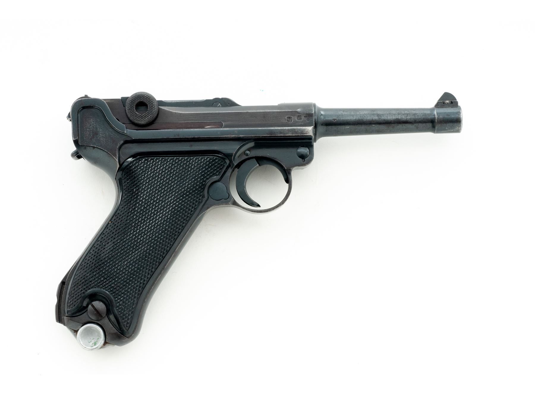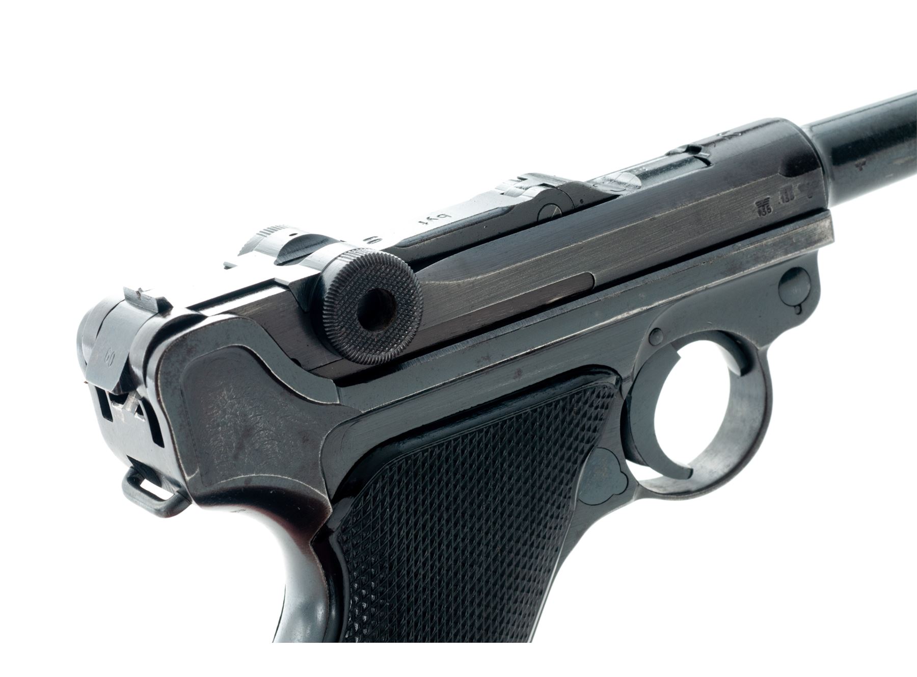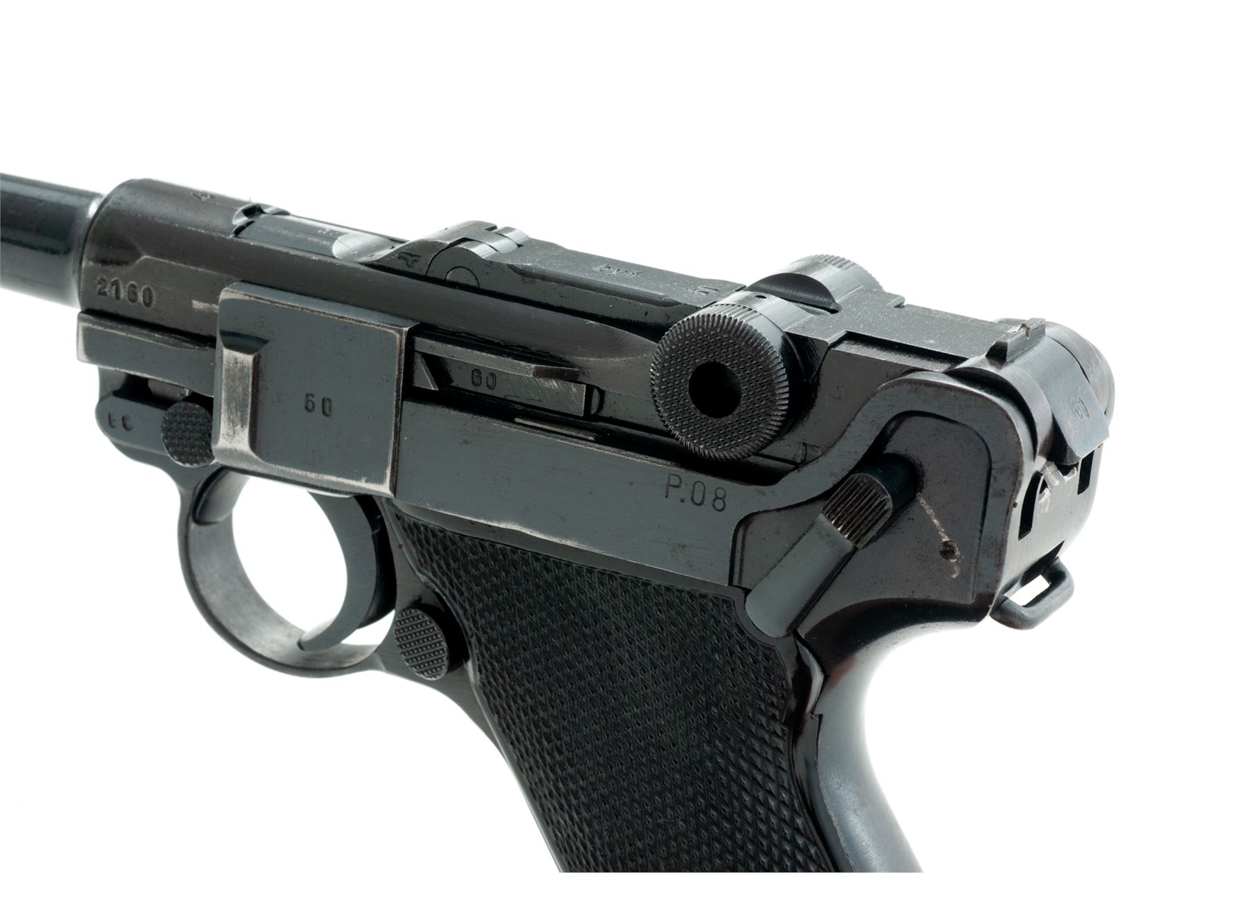 WWII Black Widow Luger, by Mauser, #2160c, 9mm, 4'' barrel, blue finish, checkered black plastic grips, with one mismatched WWII era magazine and one post-war mfg'd magazine, in black leather holster. Chamber area dated ''42'', toggle link marked ''byf'', all visible matching numbers. Condition is near excellent retaining approx. 90%-92% thinning blue. Grips with only very light wear. Action is good, bore is bright. Holster marked ''bml/42'', with WaA 26 ampt, showing moderate scuffing, and thinning and wear to strap area. Est.: $1,000-$1,500. (C&R/PPT)