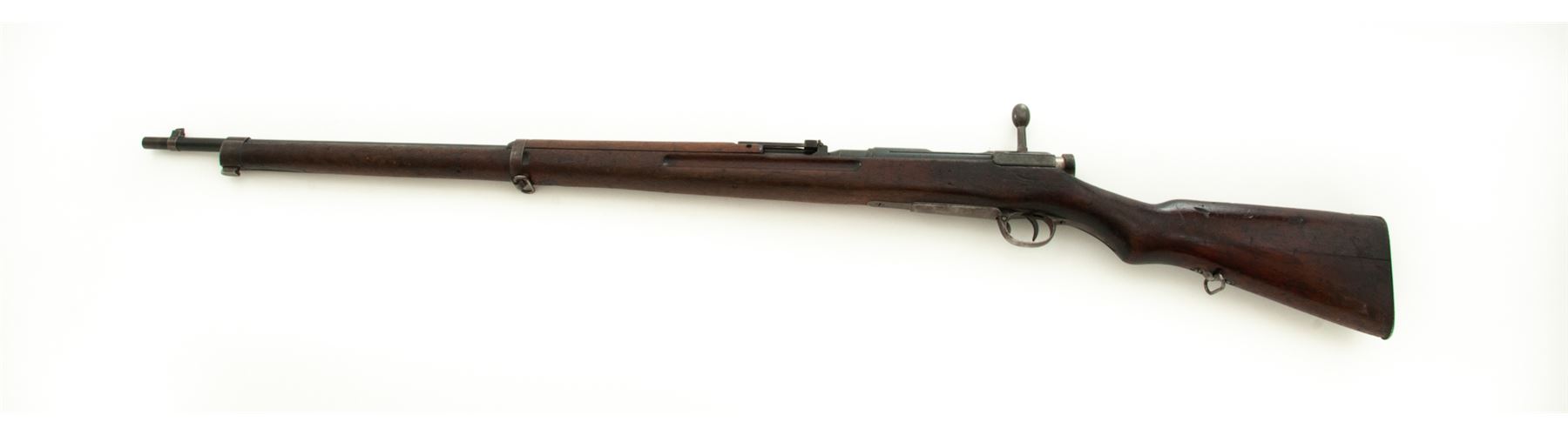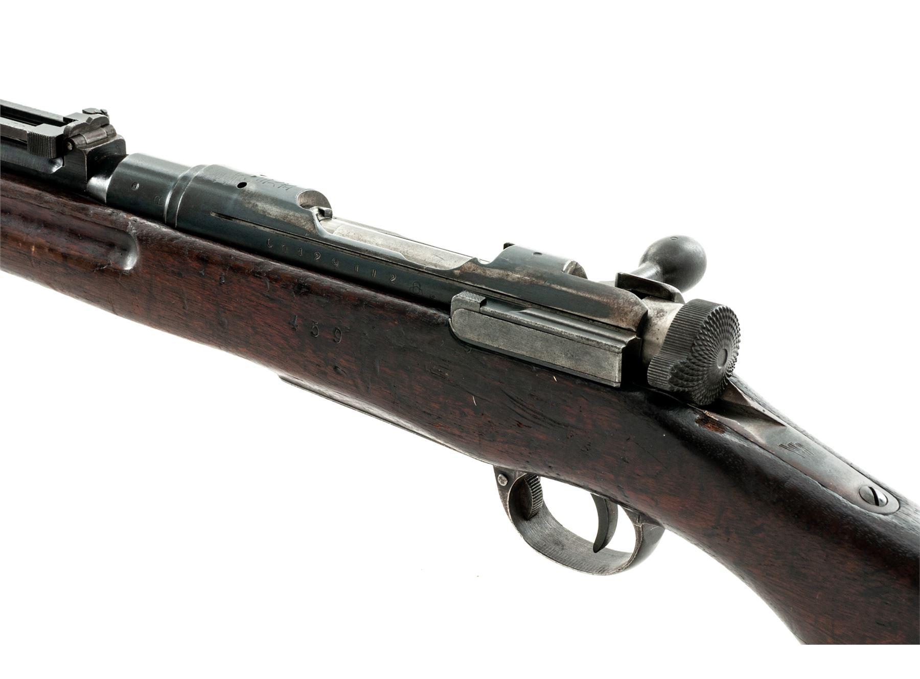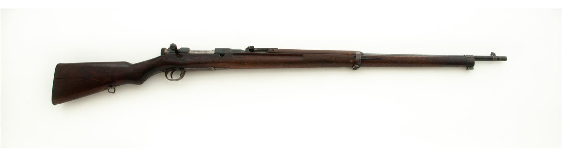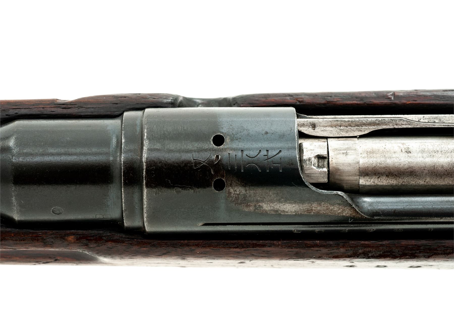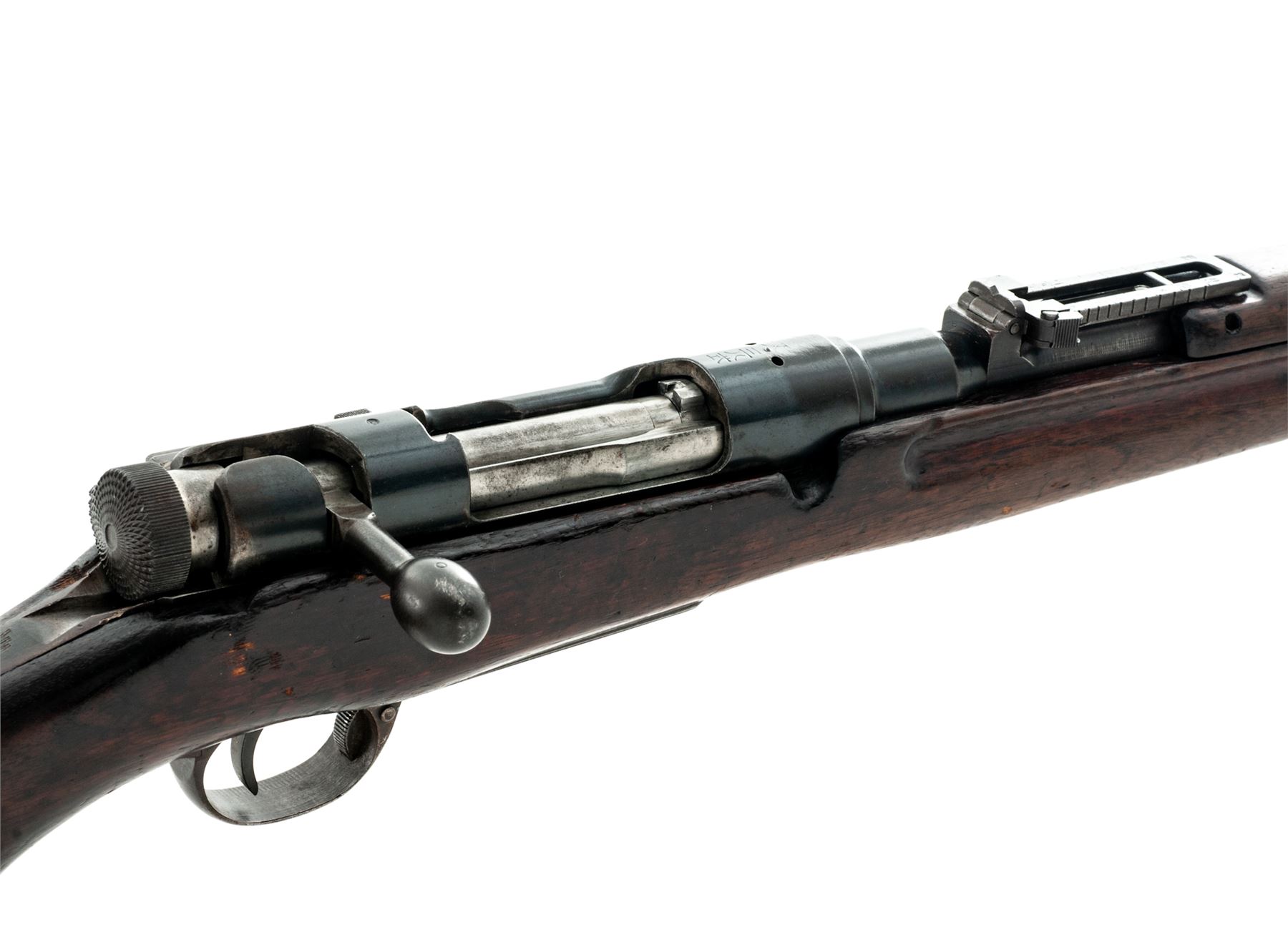 Japanese Type 38 Arisaka Bolt Action Rifle, #00429112, 6.5x50mm, Japanese cal., 31.25'' barrel, blued finish, hardwood stock, inverted ''V'' front sight and adjustable tangent rear sight. Marked on receiver ring with ''school'' and ''38 Type'' characters below obliterated Imperial mum. Left side of receiver has ''OO'' stamped next to serial number, indicating rifle was removed from service, along with the mark for the Kokura Arsenal . Mismatched number on bolt handle. Missing cleaning rod. ''459'' and ''102'' stamped on stock. Condition overall is very good with approx. 60% finish remaining on the metal. Wood is very good with overall darkness and handling marks. Action is smooth, bore is very good with very good rifling. No visible import stamps. Est.: $200-$300. (C&R)