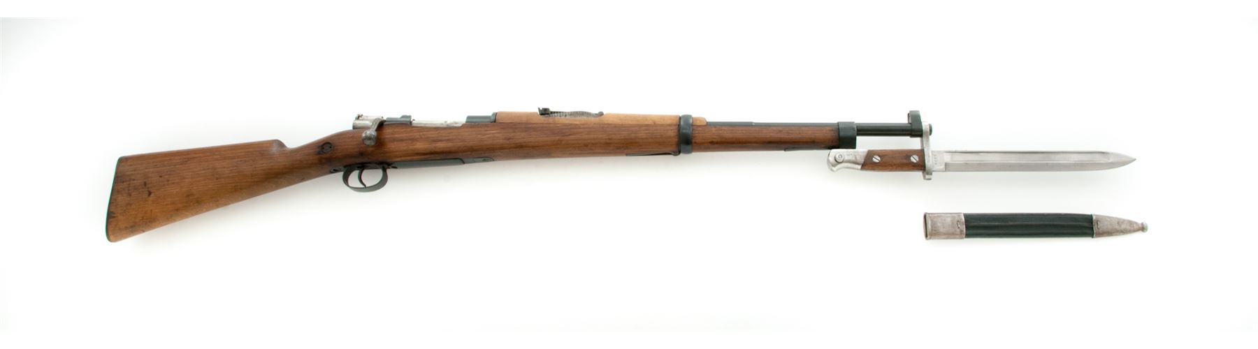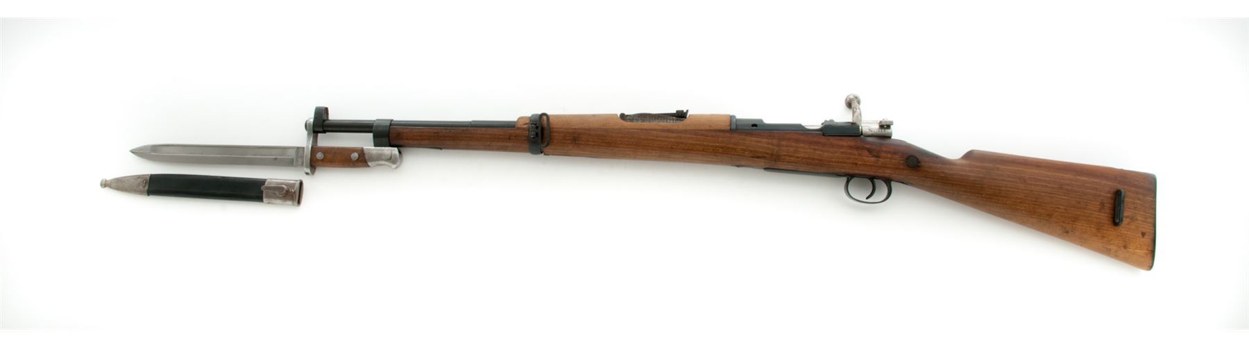 Spanish M1916 Mauser Bolt Action Rifle, with bayonet and scabbard, #A833, 7x57 mm cal., 21.75'' barrel, blued finish, hardwood stock, inverted ''V'' front sight with protecting ears and adjustable tangent rear sight. Partial Spanish crest visible on receiver ring. ''7MM'' stamped on barrel. ''LC'' stamped in stock at wrist. Matching numbers on bolt handle and stock, mismatched number on bolt shroud. Front sight has been canted left to adjust. Missing cleaning rod. Condition overall is very good with approx. 90% finish remaining on the metal, with speckled patina on the bands, floorplate, and buttplate. Wood is very good with impressions, scratches, and darkening. Action is smooth, bore has darkening and roughness with very good rifling. No visible import stamps. Bayonet with 10'' blade is marked ''ARTILLERIA FABRICA DE TOLEDO'' on left side of ricasso. Mismatched number on scabbard. Condition overall is very good with blade showing minor sharpening and cleaning. Leather on the scabbard is soft and pliable, chape has overall dents. Est.: $250-$450. (C&R)