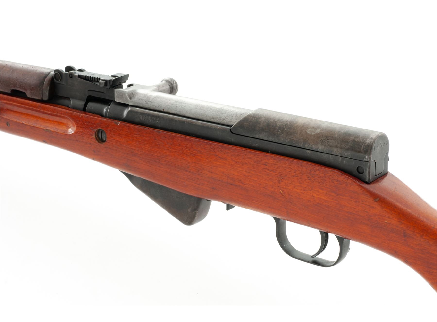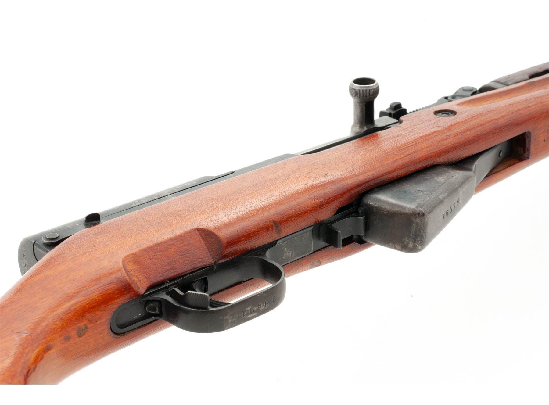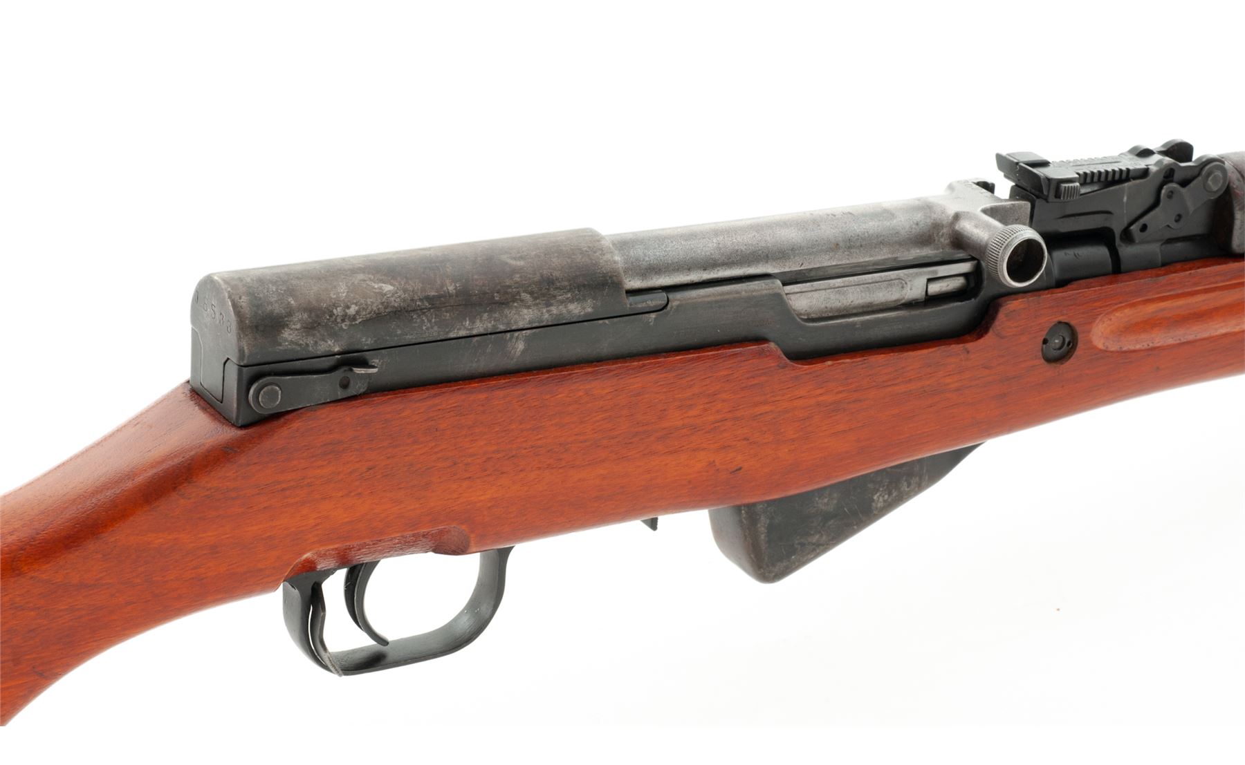 Chinese SKS Semi-Automatic Rifle, with accessories, #J8533, 7.62x39mm cal., 20.4'' barrel, blued finish, hardwood stock, hooded post front sight and adjustable tangent rear sight. Marked on left side of receiver with a ''Triangle 26'' arsenal stamp. Mismatched numbers. Includes buttstock cleaning kit, missing cleaning rod. Condition overall is very good with approx. 60% finish remaining on the metal with a faded uneven color to the balance. Handguard is a painted replacement in fair condition. Stock is very good with a few handling marks and impressions. Action is smooth, bore is very good with very good rifling. Import stamped on right side of receiver. Accessories included are: bayonet blade without collar or spring in very good condition, nine stripper clips, and an aftermarket ventilated handguard, new in package. Est.: $300-$400. (C&R)