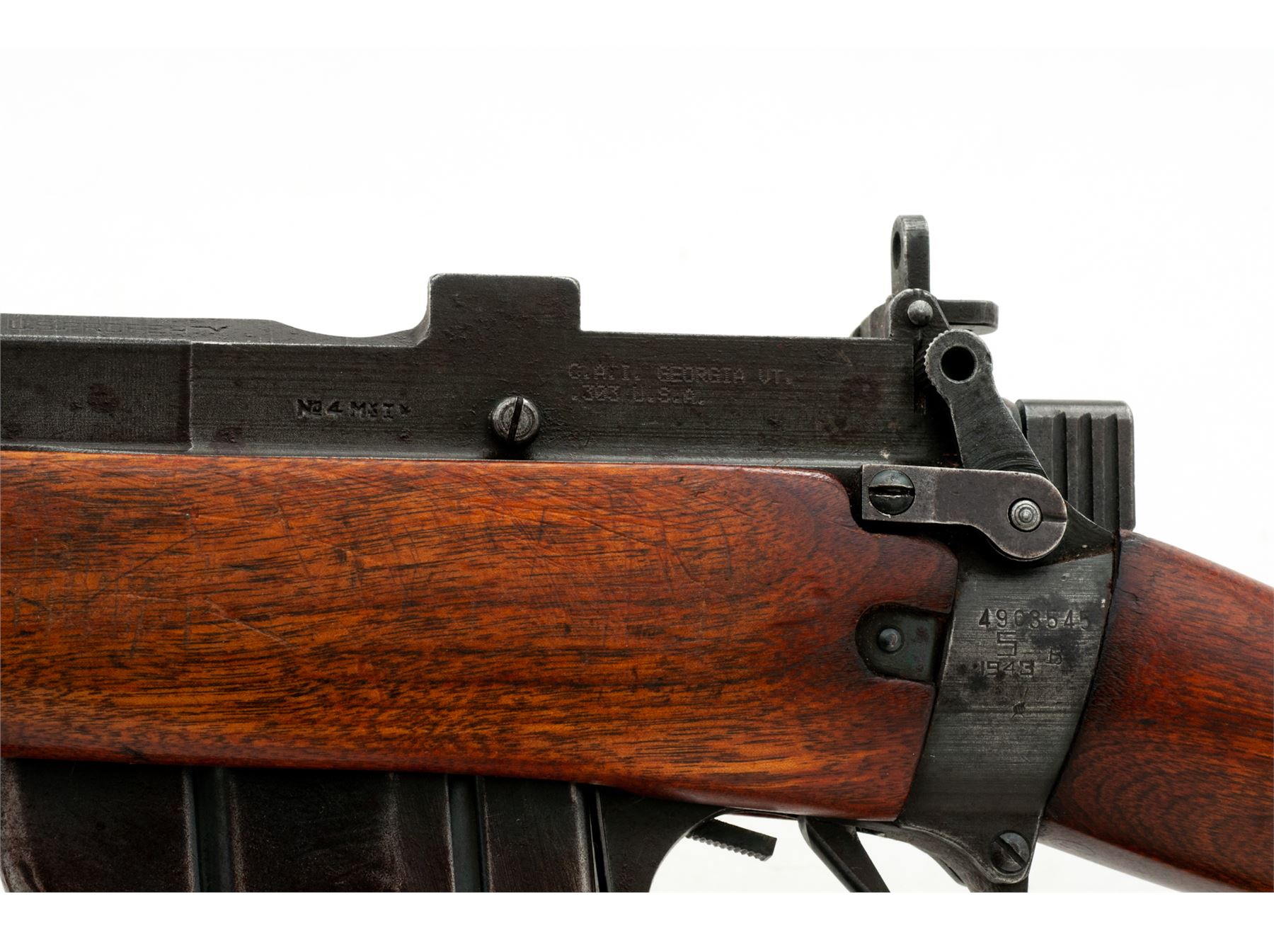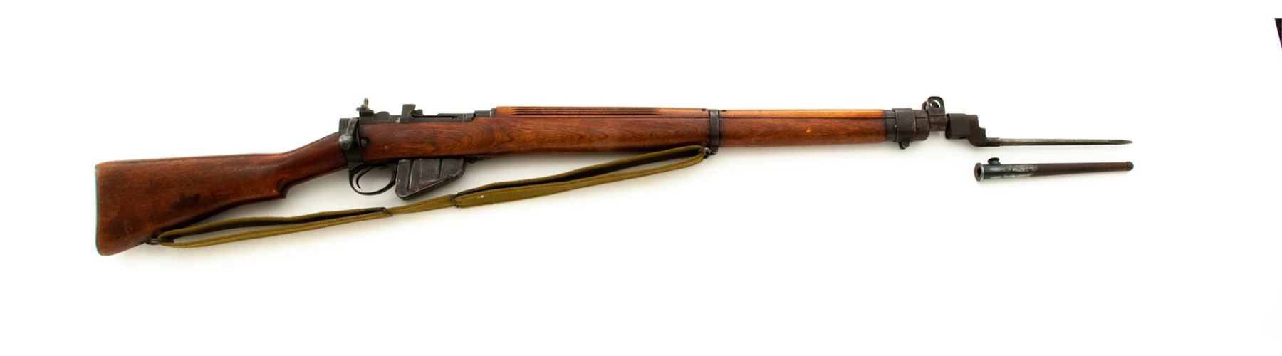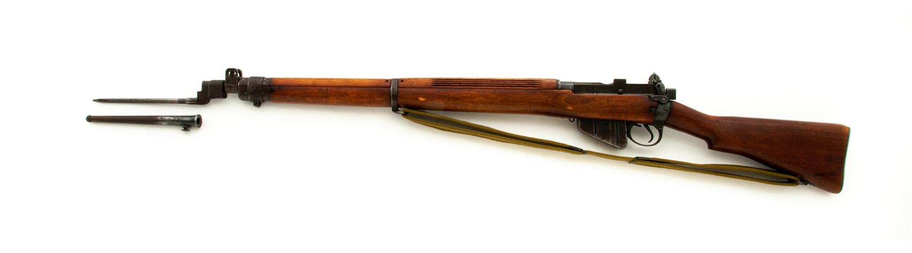 British No. 4 Mk 1* Lee-Enfield Bolt Action Rifle, with bayonet and scabbard, #49C3545, .303 British cal., 25.2'' barrel, blued finish, hardwood stock, blade front sight with protecting ears and 300/600 yard two-position flip rear sight. Marked on left side of receiver ''No.4 Mk1*'' and ''U.S.PROPERTY'', and on left side body ''S/1943'', indicating mfg. by Savage Arms Co. under the Lend-Lease agreement. Matching numbers on bolt handle, no numbers on forend. Magazine marked with a Savage ''Block S'', with zinc buttplate. Bore has darkening in the grooves, otherwise bright with very good rifling. Safety lever spring is weak but functional, action is smooth. Import stamped on left side of receiver. Includes a Danish cotton sling marked ''HTK'' in excellent condition. Bayonet is marked on left side of socket ''No.4 Mk II S'' and has a rifle serial number stamped on the left side. Scabbard is stamped ''No.4 Mk 1''. Condition overall is fair with the blade point chipped and extensive rust present. Est.: $300-$500. (C&R)