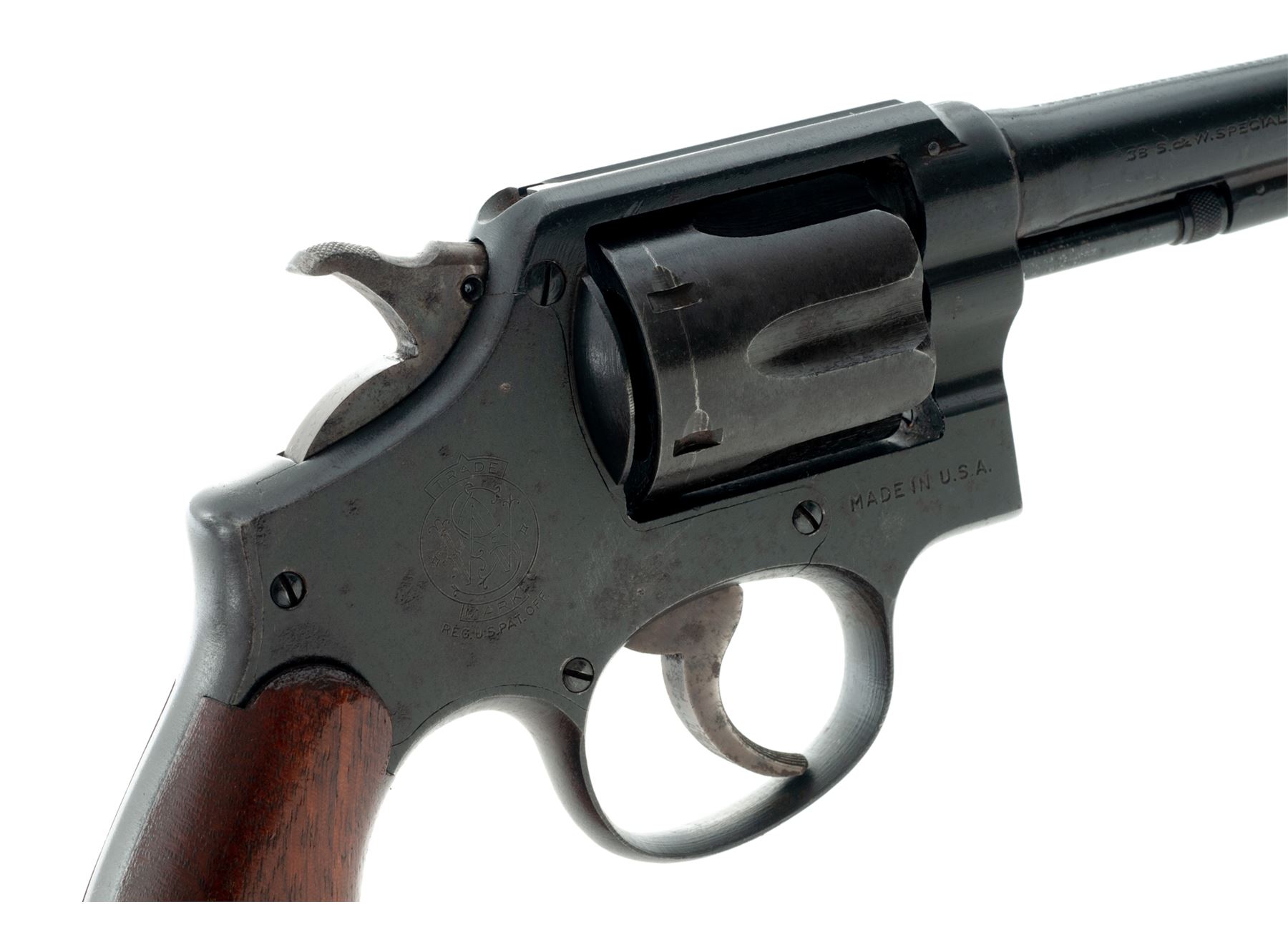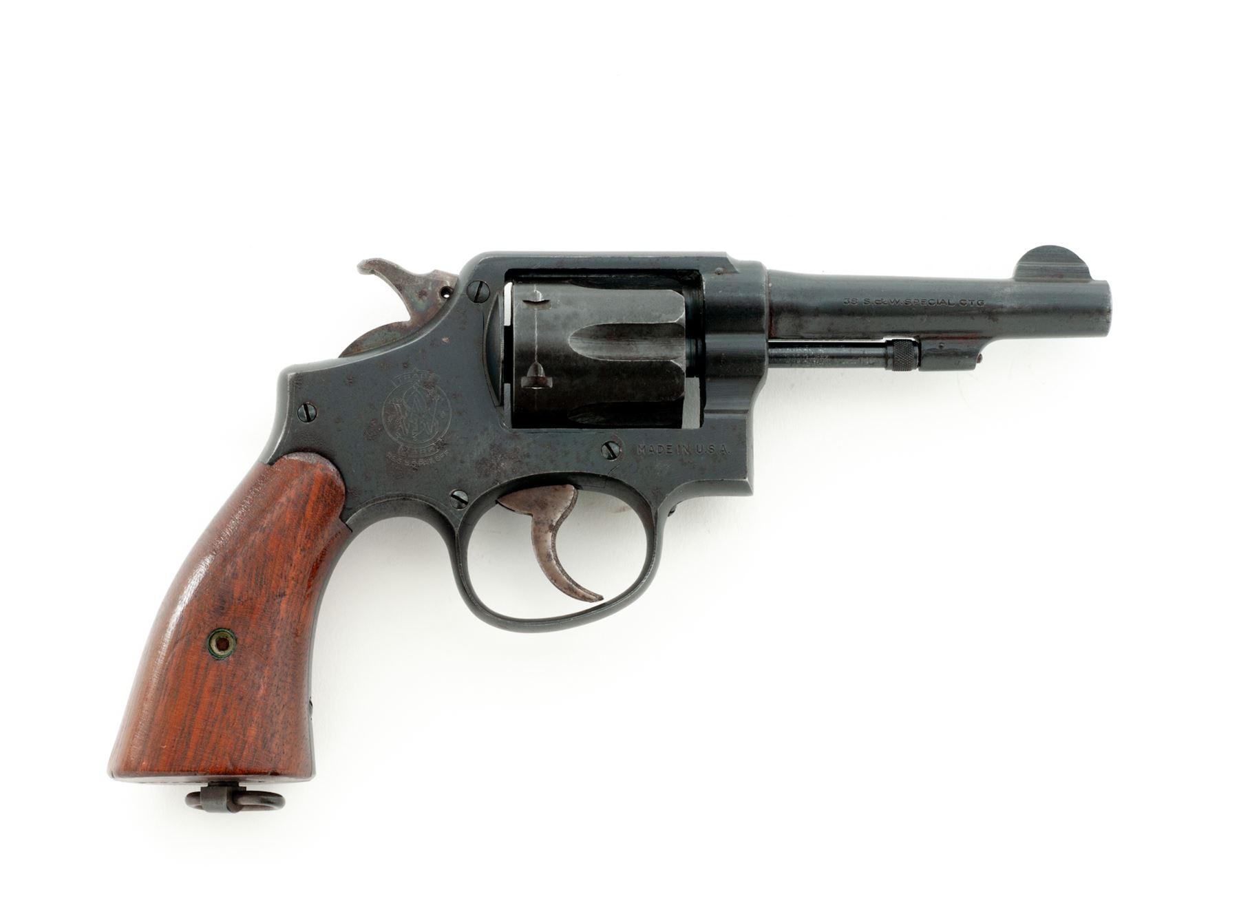U.S. marked Smith & Wesson Victory Model Double Action Revolver, #V566849, .38 S&W Spec. cal., 4'' barrel, parkerized finish, smooth walnut grips that are numbered to the gun, case hardened hammer and trigger with standard sights, lanyard loop in butt. Marked on right side of frame with S&W logo and ''MADE IN USA''; barrel marked on left side ''SMITH & WESSON'' and ''38 S&W SPECIAL CTG'' on right side; patent information marked on top of barrel; ''US PROPERTY GHD'' marked on top left side of frame. All matching numbers on frame, barrel, grips, cylinder, and cylinder star. Metal surfaces rate as good, majority of the parkerized and case colored finish remains, with specks and spots of reddish brown oxidation, some of which have turned to very fine surface peppering; factory lettering is clear. Grips are near excellent and look really good for their age with only small handling marks. Action is crisp with a bright near excellent bore. Est.: $250-$450. (C&R/PPT)